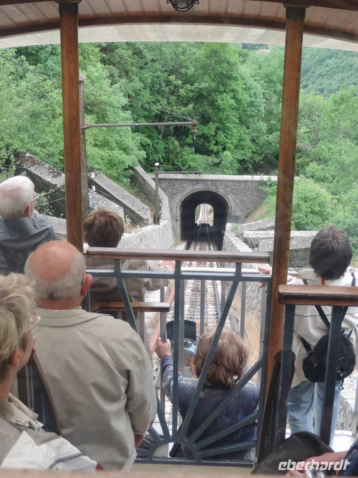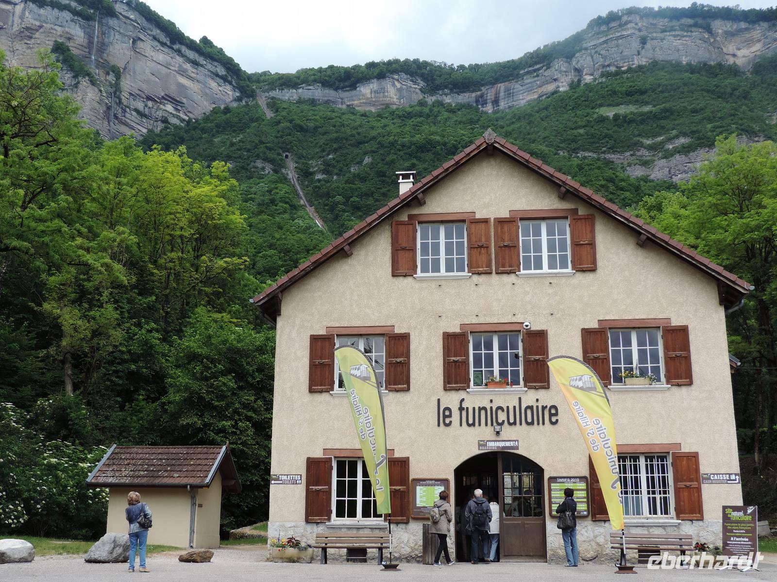Als nächstes fahren wir zum Ort Montfort, von wo aus wir um 13.30 Uhr die spektakuläre Standseilbahn nach St. Hilaire de Touvet nehmen. Es dauert 20 Min, bis wir oben sind. Leider ist die Sicht eingeschränkt, da die Wolken niedrig hängen und es etwas diesig ist.