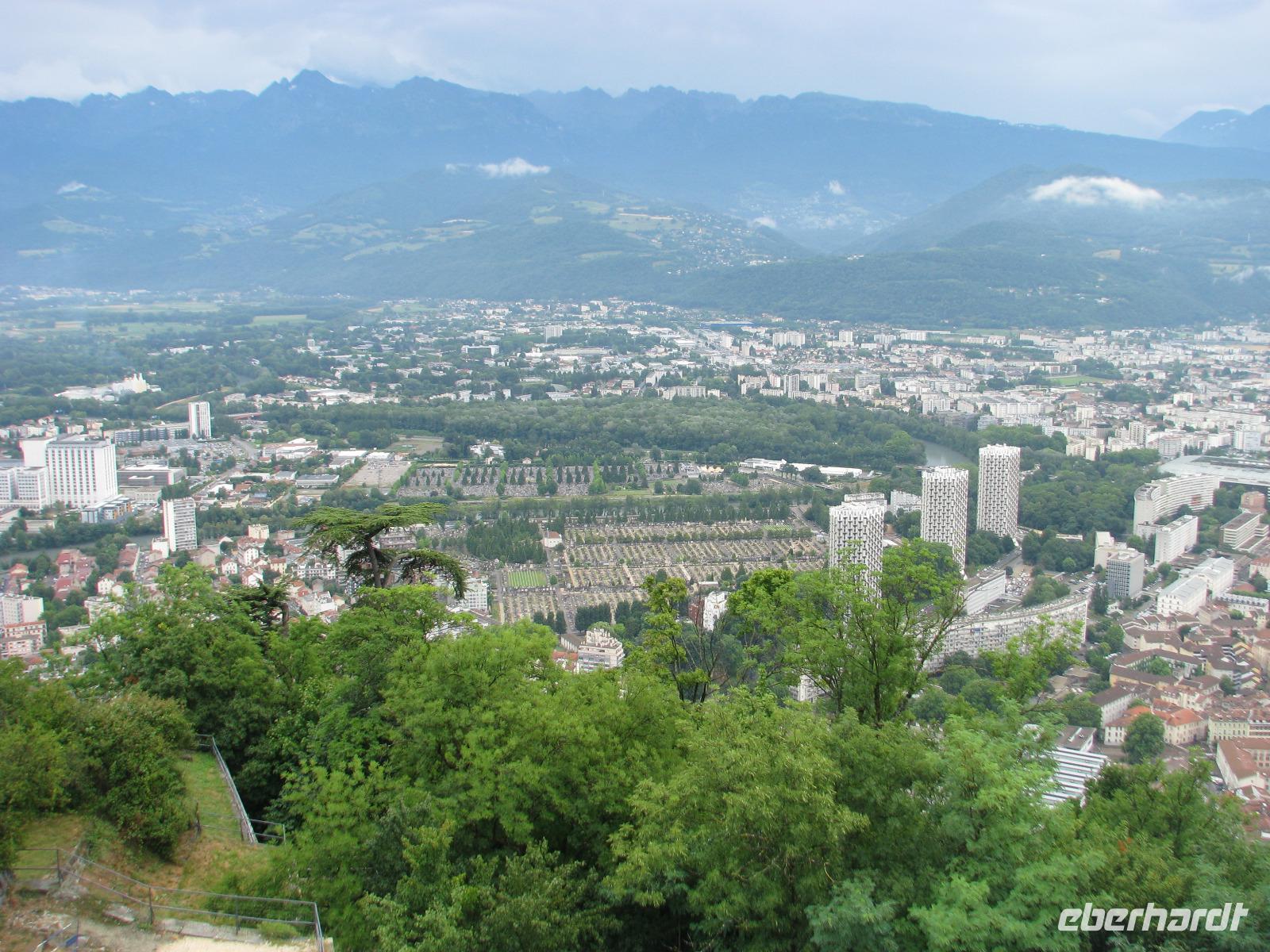 Grenoble, die größte Stadt der Alpen und einst Austragungsort der Olympischen Winterspiele erwartet uns. Nach dem Frühstück wollen wir diese Stadt mit ihrer besonderen Lage erkunden. Wir halten direkt an der Bahn, die die Franzosen liebevoll nur les Boules, die Kugel nennen. Aber zunächst wollen wir durch die lohnenswerte Altstadt schlendern. Leider ist das Wetter heute ein wenig ungnädig. Als ein kräftiger Schauer niedergeht, suchen wir Schutz unter der Markise eines Restaurants. Der Inhaber nimmt es gelassen und wünscht uns viel Glück für den weiteren Tag. Zugegeben, als wir oben auf der Festung sind, hätten wir mehr davon gebrauchen können, da der Regen und die Wolken leider die herrliche Lage Grenobles nur erahnen lassen.