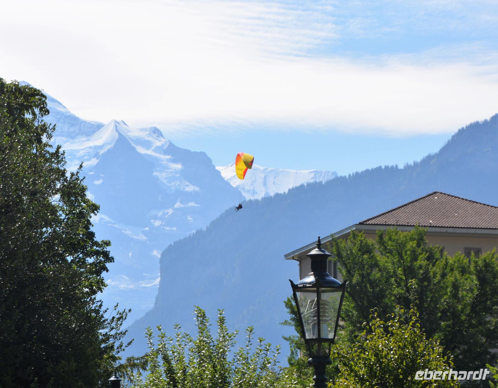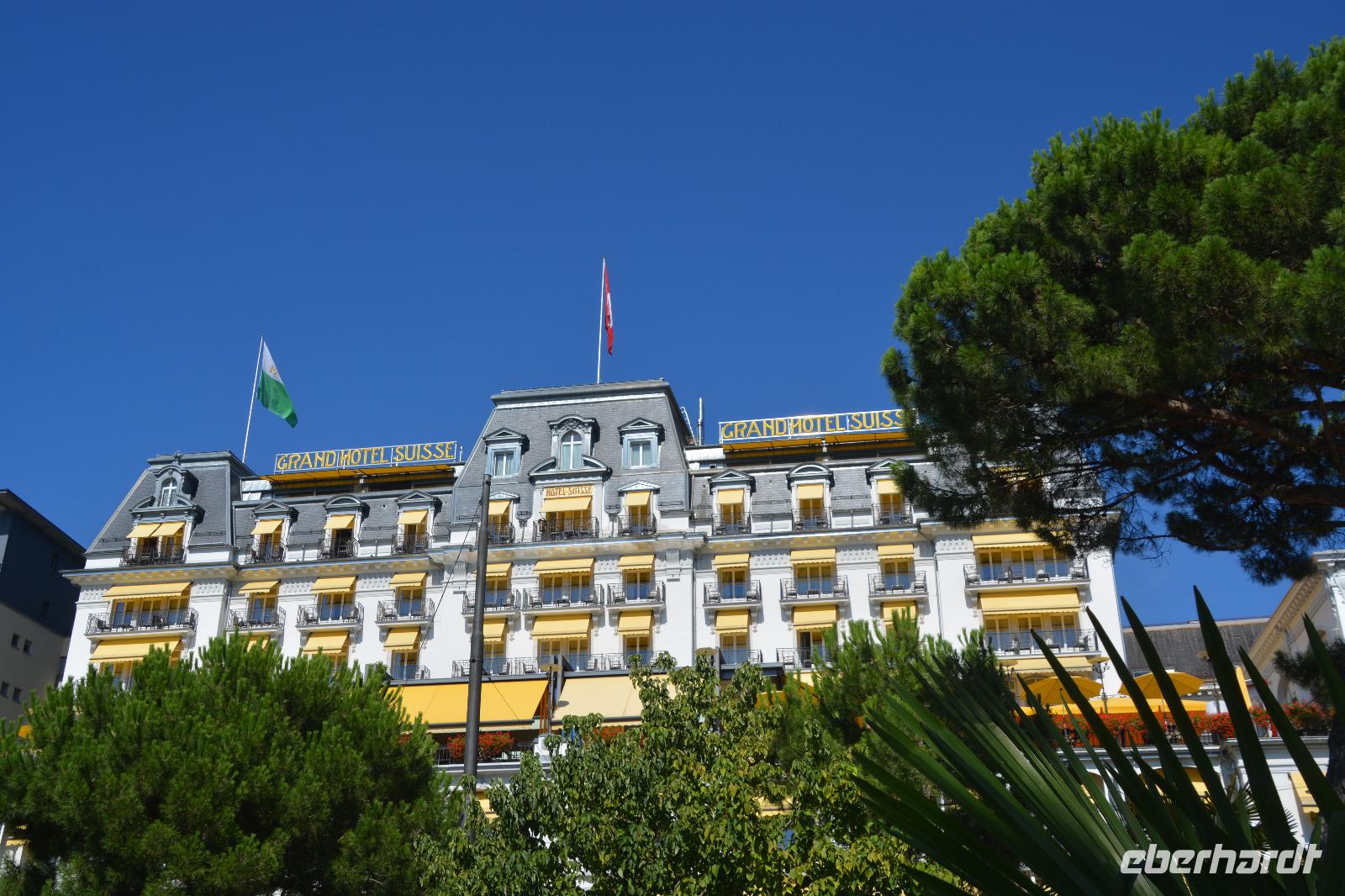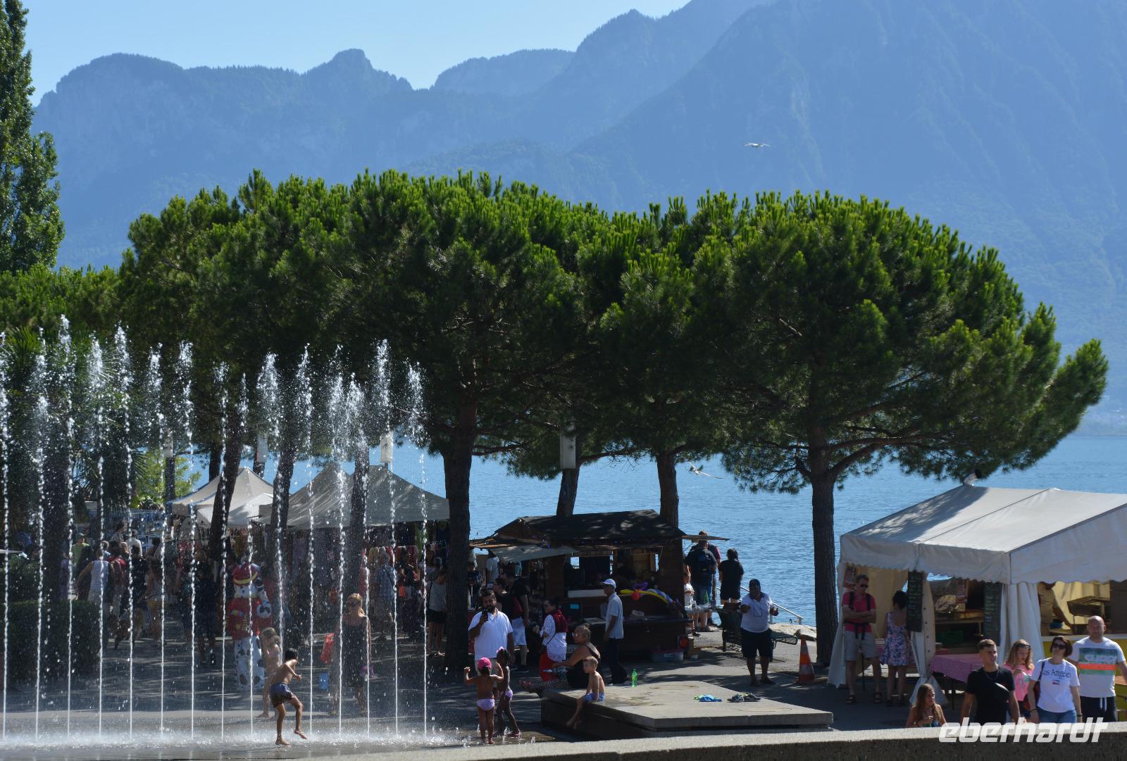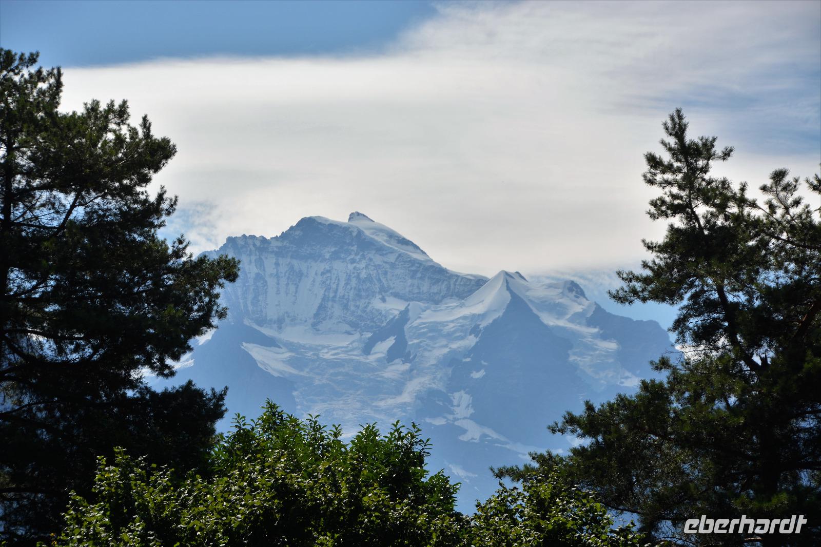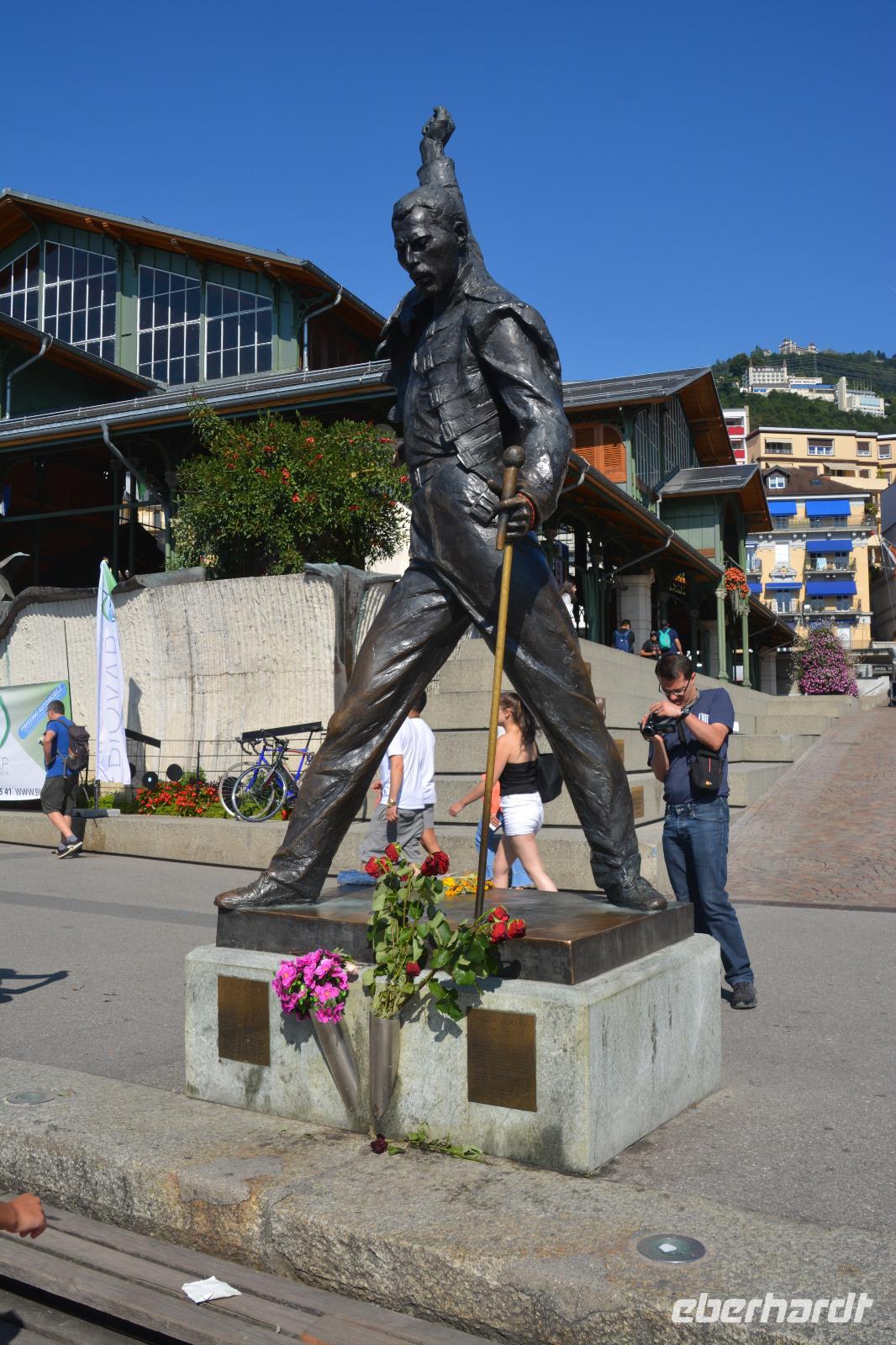 In einem sehr schönen Restaurant nehmen wir das sehr gute Frühstück ein. Aber wo steckt nur die Butter, die Milch und der Käse? Es dauert einen Moment bis wir herausfinden dass sich alles gut gekühlt in einem der farbigen Kühlschränke versteckt. Der Inhalt ist reichlich und alle werden satt. Danach starten wir den Tag und fahren in Richtung Interlaken. Wir erfahren etwas über die Geografie und die Bedeutung dieses Gebirges, welches so selbstverständlich für bestimmte klimatische Konstanten in Europa sorgt. Auch bekommen wir einen Überblick über die Geschichte der Schweiz, die wir heute durchfahren. Schon bevor wir in den Ort Interlaken gelangen erblicken wir, dank guter Fernsicht, das sog. "Dreigestirn": Eiger, Mönch und Jungfrau. Alle drei Berge haben eine ansehnliche Höhe von ca. 4000 m und gehören zu den Berner Apen. Die Eiger-Nordwand, die für jeden Bergsteiger aufgrund der Unberechenbarkeit des Wetters eine Herausforderung darstellt, sieht auch aus der Ferne beeindruckend aus. Der Ort Interlaken liegt, wie der Name schon sagt, zwischen zwei Seen: dem Thuner See und dem Brienzer See. Die Thermik im Ort scheint gut zu sein, denn es fliegen zahlreiche Gleitschirmflieger über der Kirchturmspitze und landen in der Nähe unseres Parkplatzes. Nach einer Pause hier in diesem Urlaubsort fahren wir durch das Simmental nach Gstaad wo unsere Bahnfahrt mit dem "Golden Pass Panoramic" startet. Das Simmental, eine wirkliche Bilderbuchlandschaft mit Almen und schönen Dörfern, erfährt durch die Bahnfahrt noch eine Steigerung. Wir fahren durch eine atemraubende Bergwelt. Steil sind die Hänge an denen sich Chalets und alte Bauernhäuser klammern. So manchem stellt sich die Frage, ob er hier leben könnte mit der Abgeschiedenheit und dem komplizierten Zugang im Winter. Das Wetter ist heute noch ein wenig wechselhaft und wir erwarten mit Spannung die weitere Entwicklung, wollen doch morgen einige von uns hoch hinaus. Jetzt aber kommen wir erst einmal auf der anderen Seite der Berge oberhalb von Montreux an. Steil und verhältnismäßig schnell bewältigt der Zug die letzten Kehren wieder mit einer tollen Aussicht auf diese Stadt am Genfer See. Schließlich sind wir dort und spazieren vom Bahnhof in Richtung Seepromenade. Dort angekommen entdecken wir schon bald den Bus mit Harald unserem Fahrer der uns schon erwartet. Jetzt aber schauen wir uns erst einmal in Montreux um. Hier an der Promenade sind heute am Sonntag viele Menschen unterwegs. Man promeniert und so manch einer möchte auch gesehen werden. Oder auch gehört - wie die Jazzband die auf einer Tribüne ein kleines Konzert gibt. Eisstände konkurrieren mit anderen Snackangeboten. Und in der Mitte des Ganzen steht kein Geringerer als Freddie Mercury, der hier einige Zeit am Ende seines Lebens verbrachte. Hier in Montreux traten Bands auf die Geschichte schrieben: Frank Zappa, Deep Purple und viele andere. Alljährlich findet hier das berühmte Jazz-Festival von Montreux statt. Als Jean Jacques Rousseau hier verweilte, wußte man davon allerdings noch nichts. Allerdings gab es da schon das Schloß "Chillon" an dem wir auch noch einen Fotostopp einlegen. Nachdem wir die Zeit im Ort genossen haben müssen wir noch weiter nach Martigny, wo wir eine Nacht in einem Hotel verbringen. Dieses Hotel liegt am Rande der antiken römischen Relikte, die wir uns morgen anschauen werden. Wir genießen die Ruhe hier im Hotel nach diesem ereignisreichen Tag bei einem guten Abendessen.