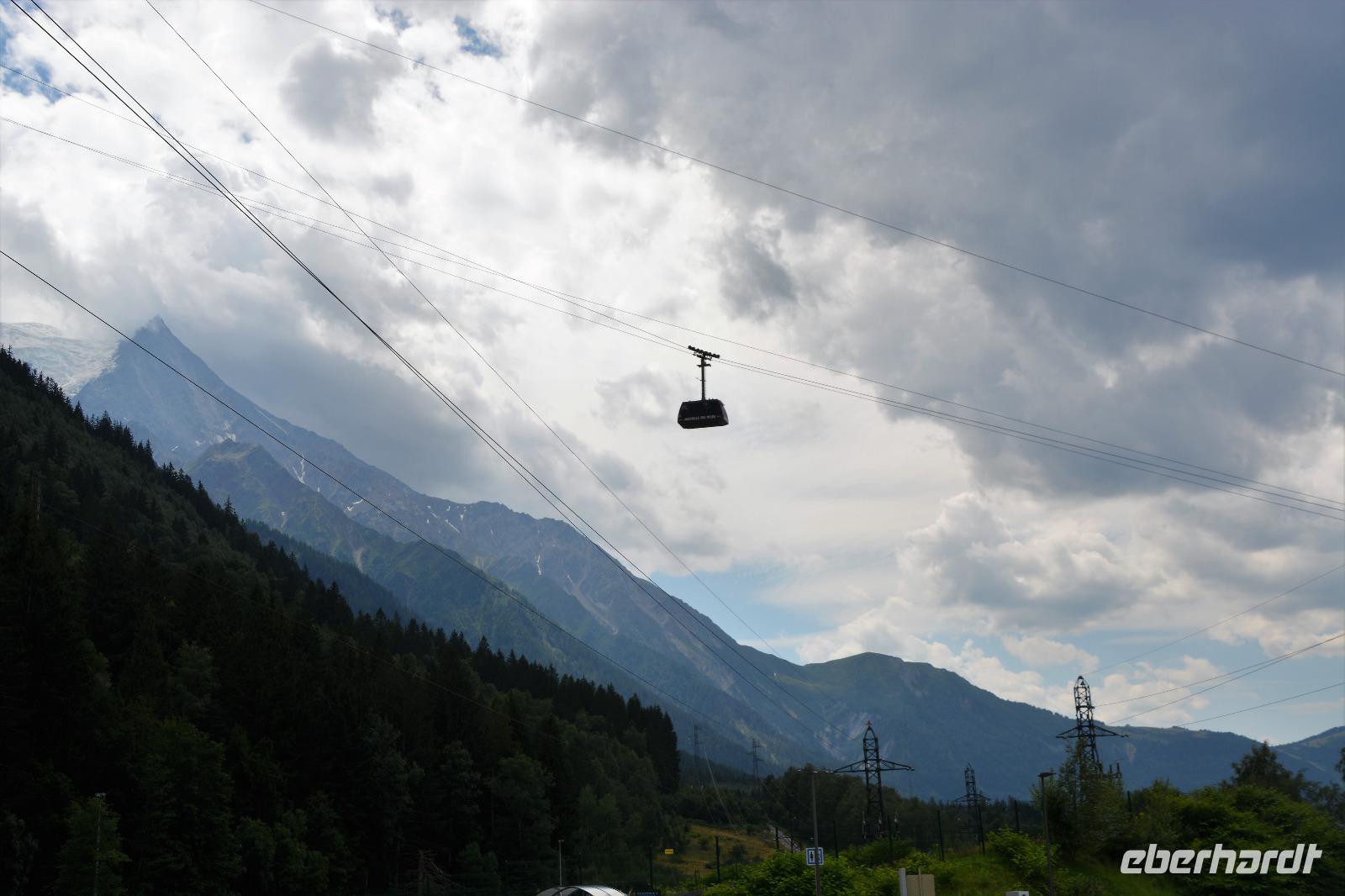 Überragt wird der Ort von der Festung "La Batia" welche extra zur Kontrolle der Passstraße im 13.Jahrhundert errichtet wurde. Nach ihrer Zerstörung blieb nur die Ruine stehen, die sich nach Restaurierungsarbeiten wieder in einem guten Zustand befindet. Im 18.Jahrhundert übernachtete Napoleon mit seiner Italienarmee hier im Ort. Schließlich kommen wir über die Hauptstraße des Ortes zum Bahnhof, von wo der "Mont-Blanc-Express" nach Chamonix startet. Nur durch einen Stopp auf der Strecke gekennzeichnet überfahren wir auf diese Art die Grenze nach Frankreich und kommen in Chamonix, einem der wohl wichtigsten Fremdenverkehrsorte der Region an. Der Ort wird vom Mont-Blanc-Massiv überragt. Der Mont Blanc ist mit 4810 m der höchste Berg der Alpen und von einigen Gletschern umgeben. Auf den "Aiguille de Midi", einen der felsigen Vorposten des Mont-Blanc-Massivs, soll den auch einer der angebotenen fakultativen Ausflüge gehen. Ein Teil der Gruppe hat sich dafür entschieden. Erst einmal aber geht unsere Reiseleitung mit den "Gletscherstürmern" nach Ankunft zu der Station Chamonix-Montenvers welche gleich neben dem Hauptbahnhof liegt und über eine Fussgängerbrücke zu erreichen ist. Alles läuft reibungslos denn wir werden schon erwartet und von einem netten Franzosen weitergeleitet.