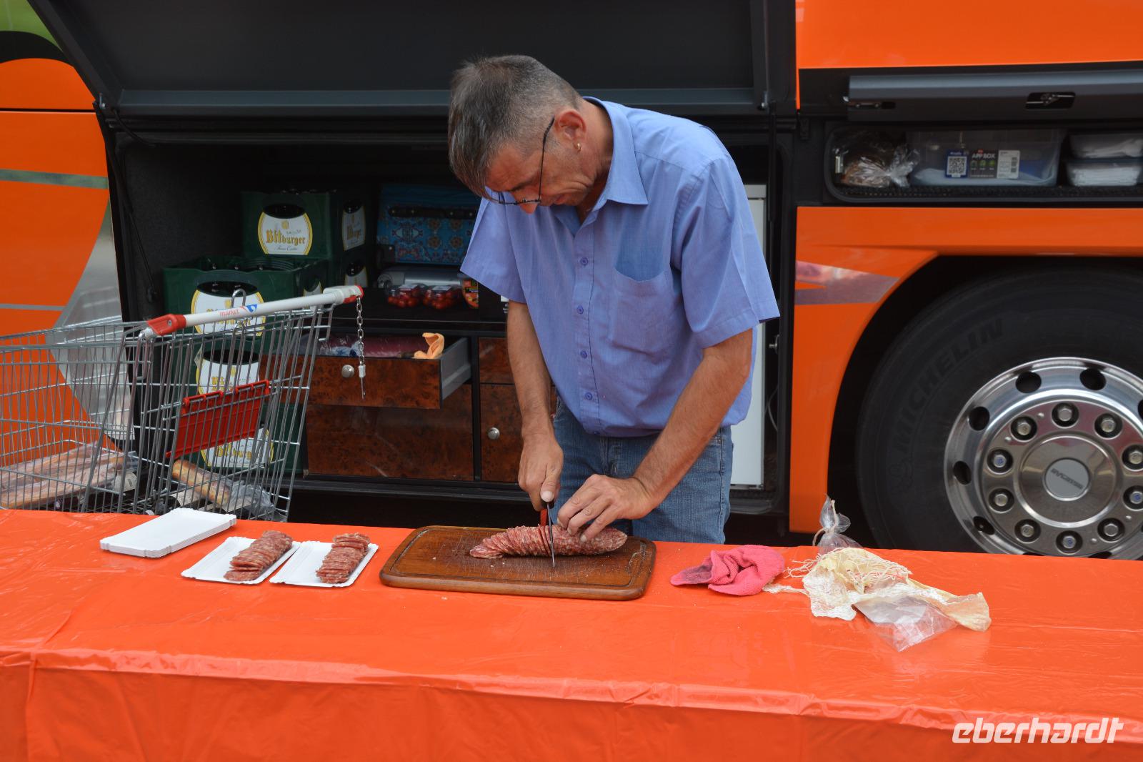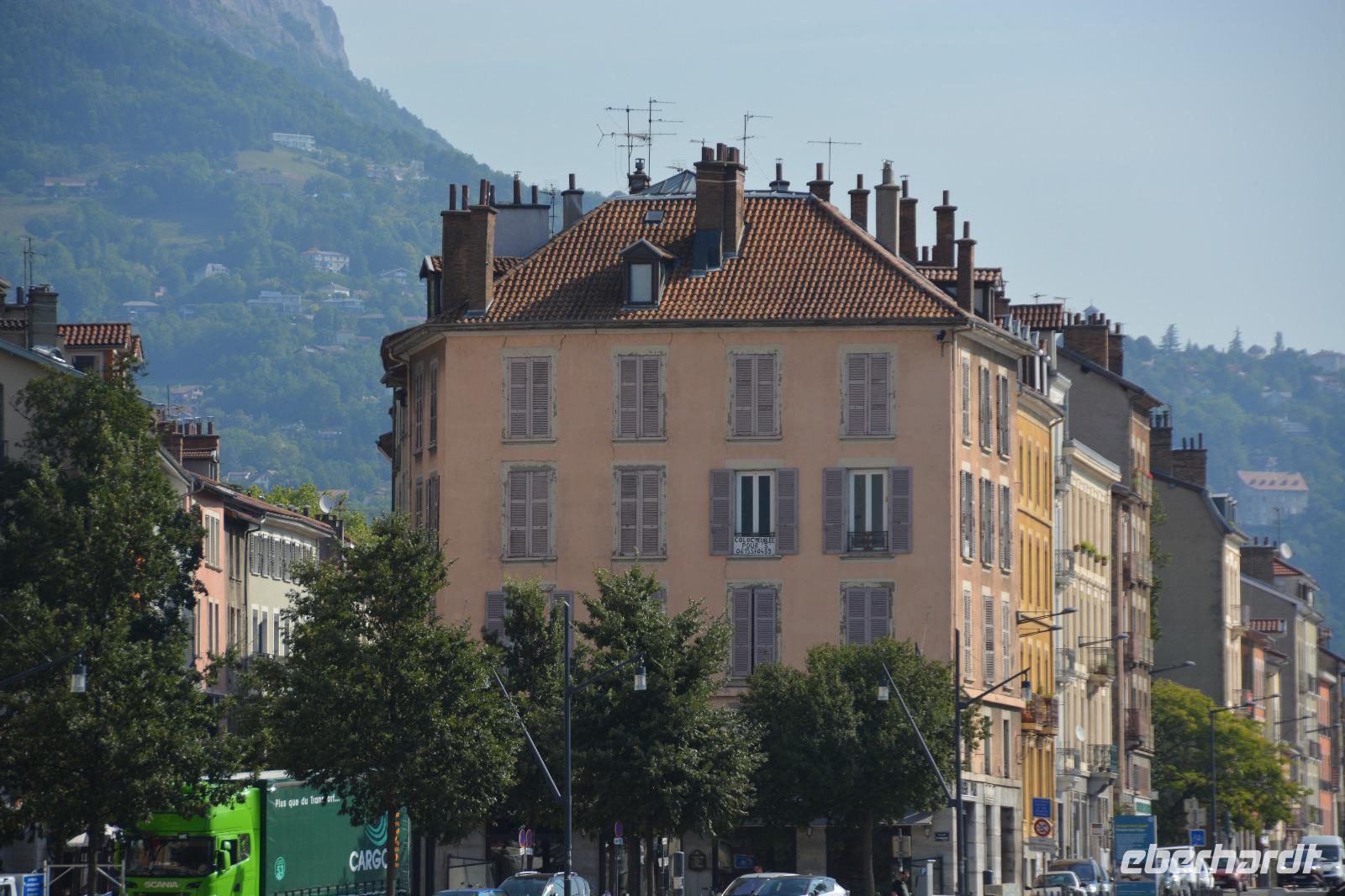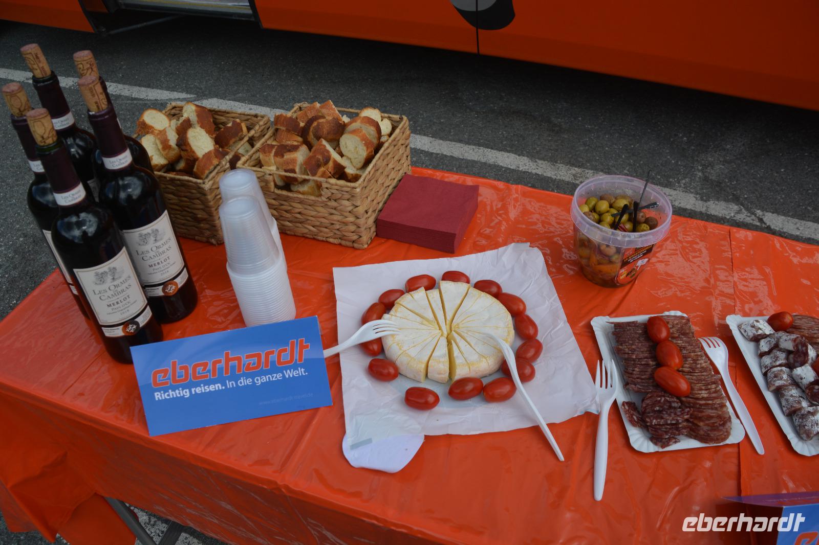 Nach diesem erlebnisreichen Nachmittag werden wir am Bus von unserer Reiseleitung und dem Fahrer mit einem französischen Buffet überrascht, dem sog. Eberhardt-Wow. Es gibt französischen Käse, verschiedene Sorten Hartwurst, Oliven und dazu einen (manche auch 2) Becher Rotwein. Unser Fahrer Harald hat aus seinem Bus 3 Tische und sogar eine Tischdecke hervorgezaubert auf dem alles appetitlich präsentiert ist, die Wurst sogar in dünne Scheiben mit einem ordentlich scharfen Messer geschnitten, dazu gute Oliven und Baguette. Das schmeckt jetzt allen besonders gut und wir greifen tüchtig zu. Der vorgesehene Nachtisch, ein französischer "Flan" (eine nahrhafte Eierspeise), bleibt für den nächsten Tag. So gestärkt verlassen wir Chamonix um nach Grenoble, Hauptstadt der franz.Region Isère und Dauphiné und Olympiastadt von 1968, zu fahren. Hier beziehen wir unser Hotel für eine Nacht und fallen alle satt an Bildern und anderem Nahrhaften müde in die Kissen.