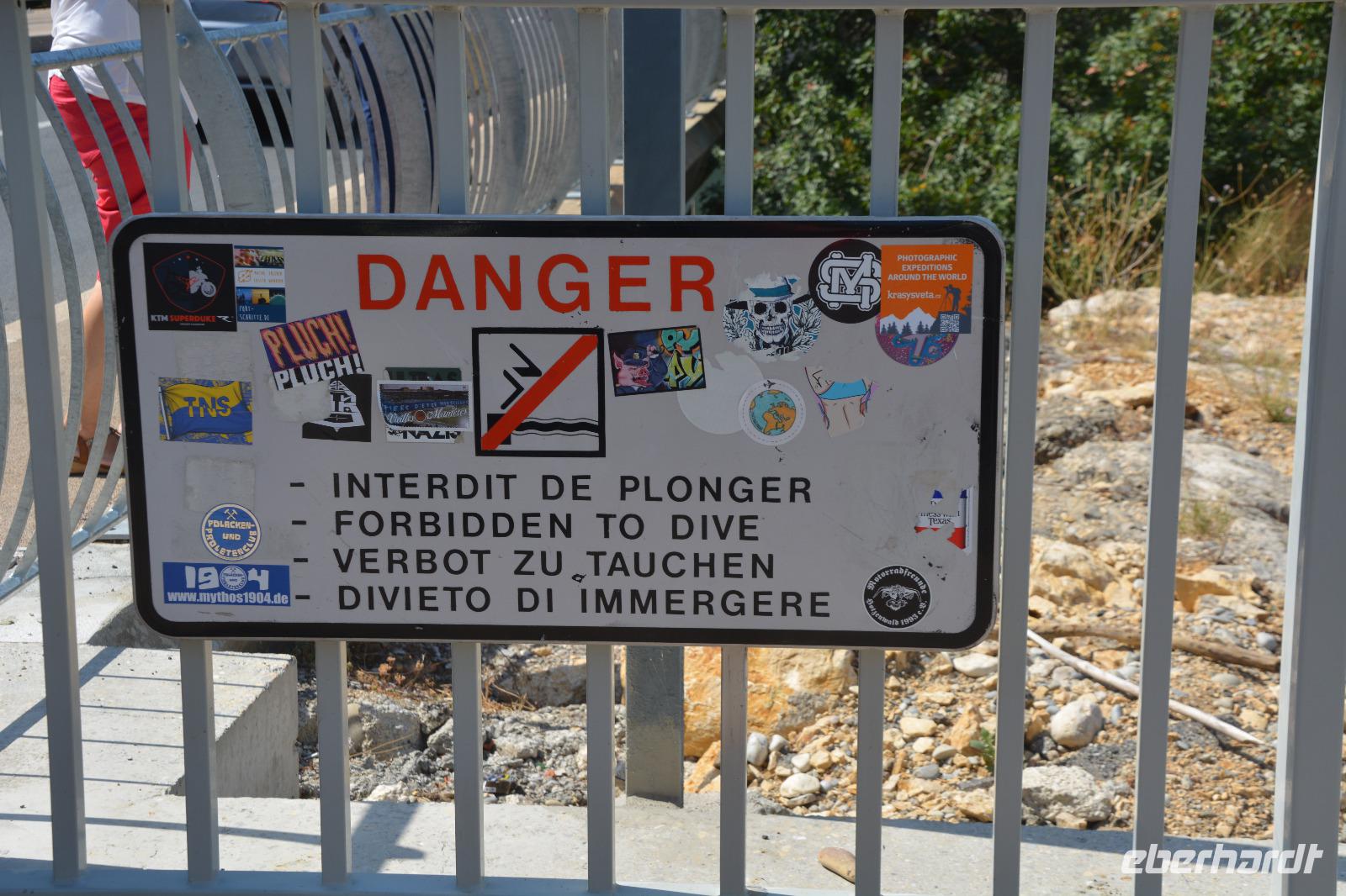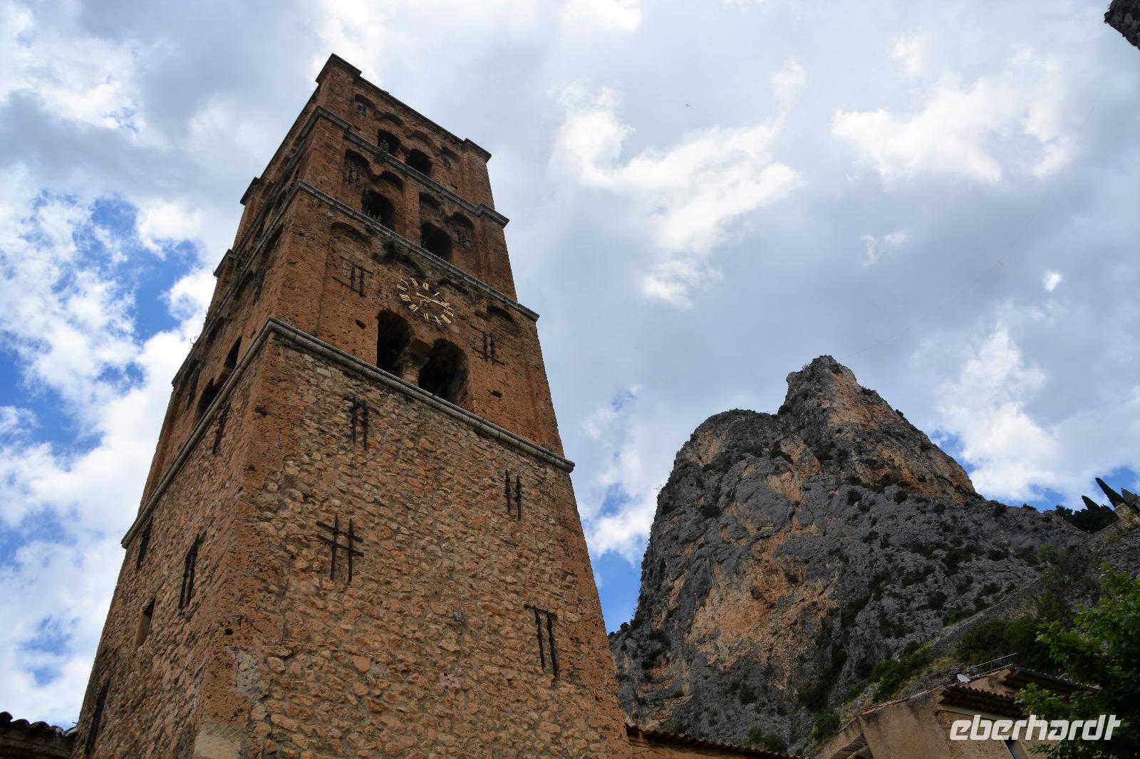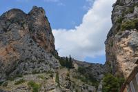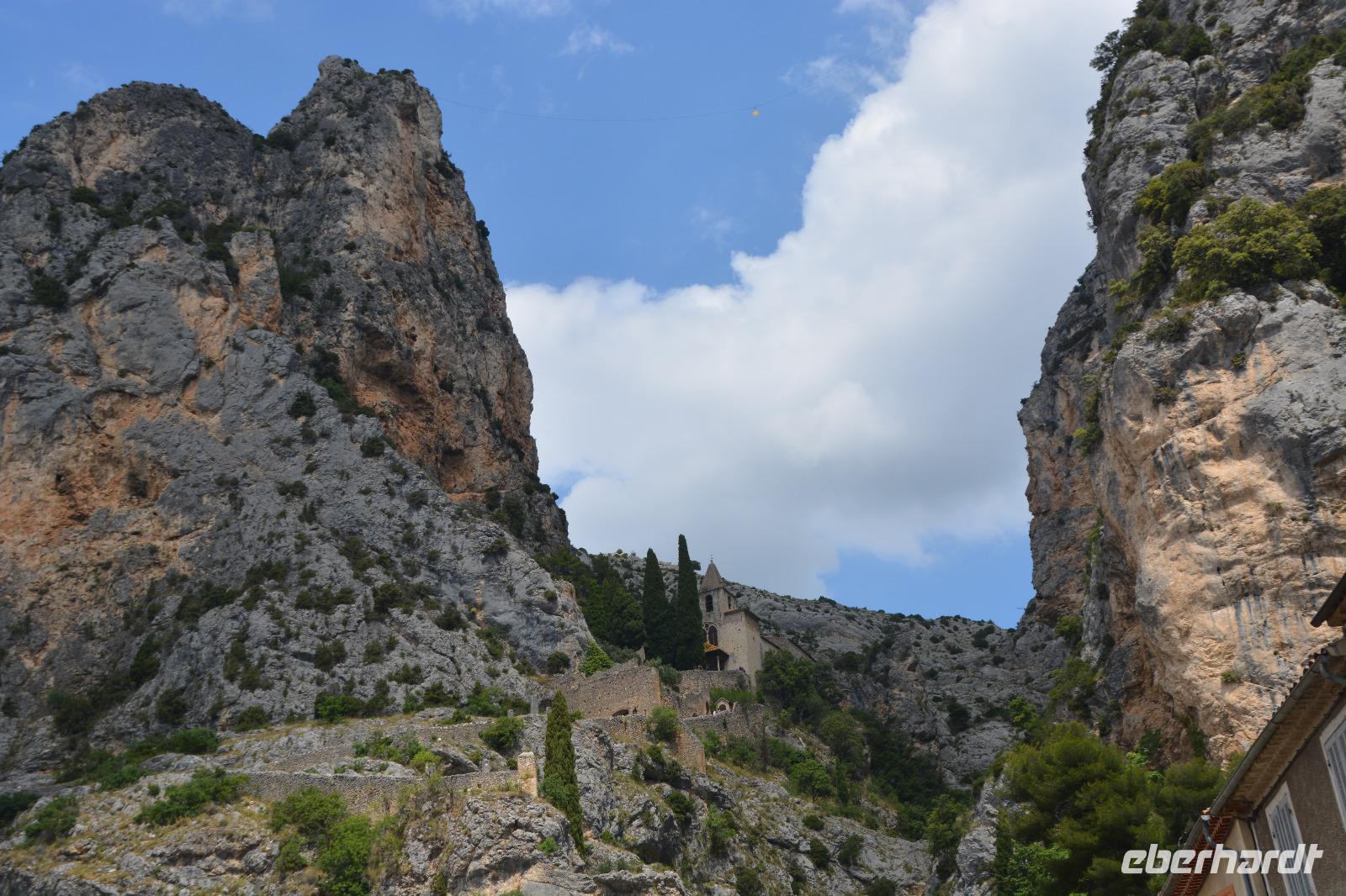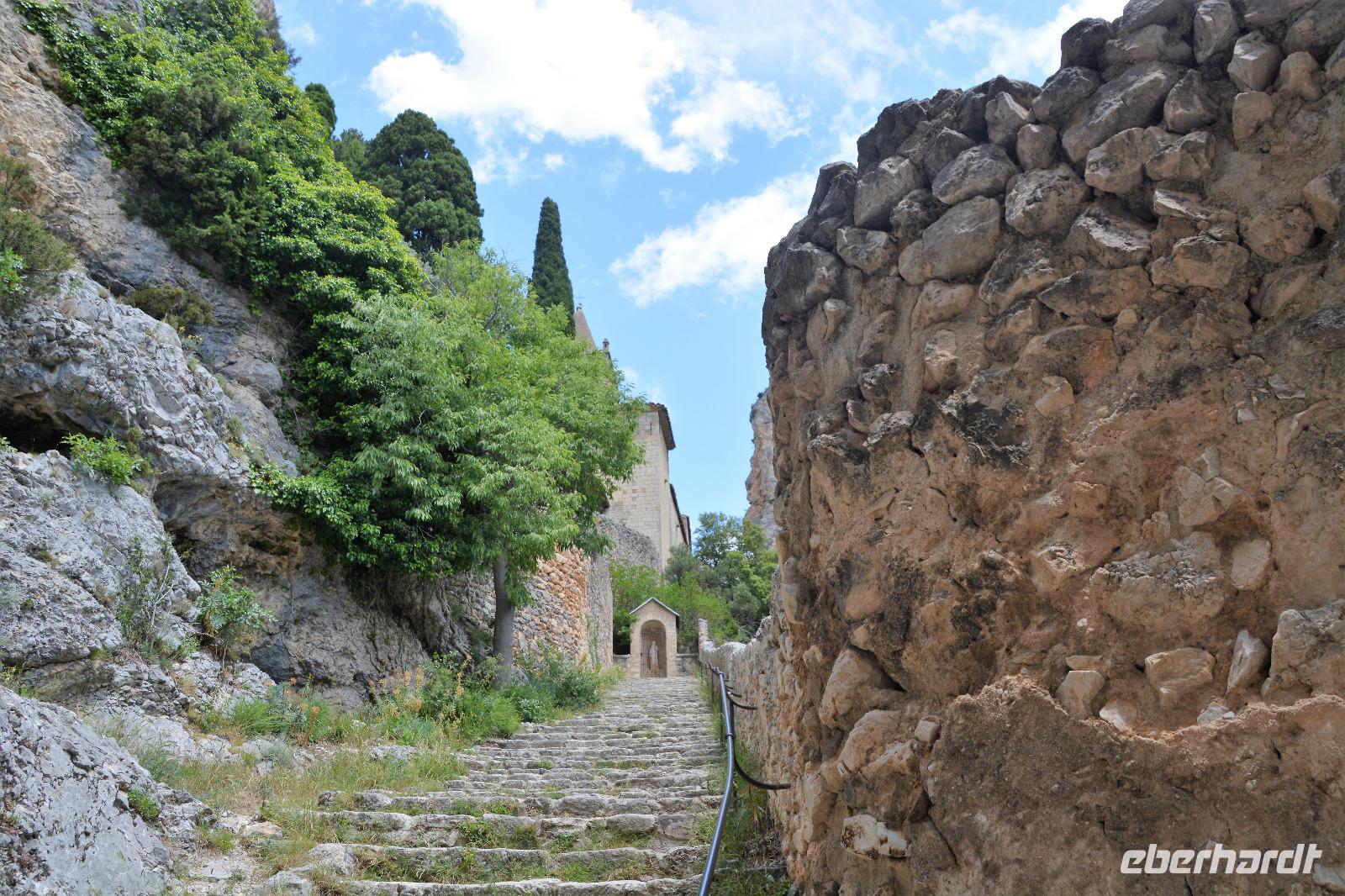 Am nächsten Morgen beginnt eines der größten Abenteuer dieser Reise, eine Fahrt durch die wohl berühmteste Schlucht Europas, dem "Canyon de Verdon". Tief eingegraben durchzieht sie 21 km lang den Süden Frankreichs. Wir fahren erst in eines der schönsten Dörfer Frankreichs, nach Moustiers-St-Marie. Der Ort mit ca. 700 Ew. hat nicht zu Unrecht dieses Prädikat, liegt er doch malerisch an einem Hang und wird von der Wallfahrts-Kapelle "Notre-Dame de Beauvoir" gekrönt. Es ist ebenfalls ein bekannter Töpferort in der Region. Da unser Bus nicht in den Ort hineinfahren darf, spazieren wir in ca. einer Viertelstunde ein wenig bergauf in den Ort. Gina zeigt für diejenigen, die zur Kapelle hinauf wollen, den Einstieg zu diesem steilen Treppenweg.