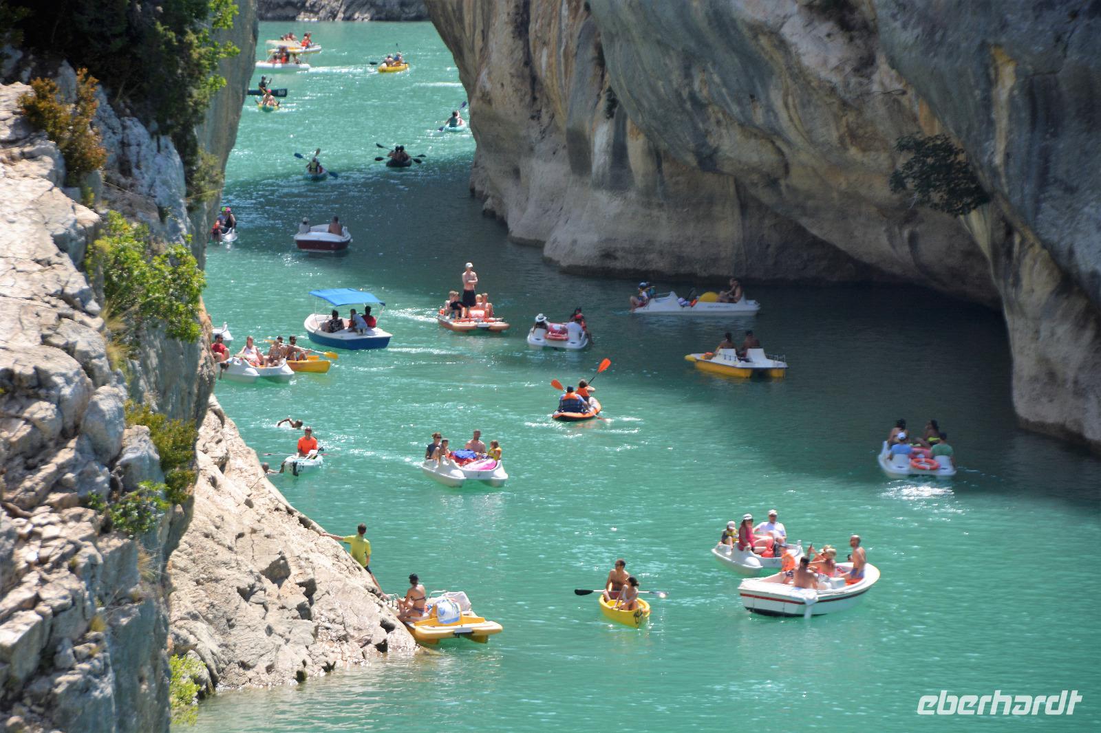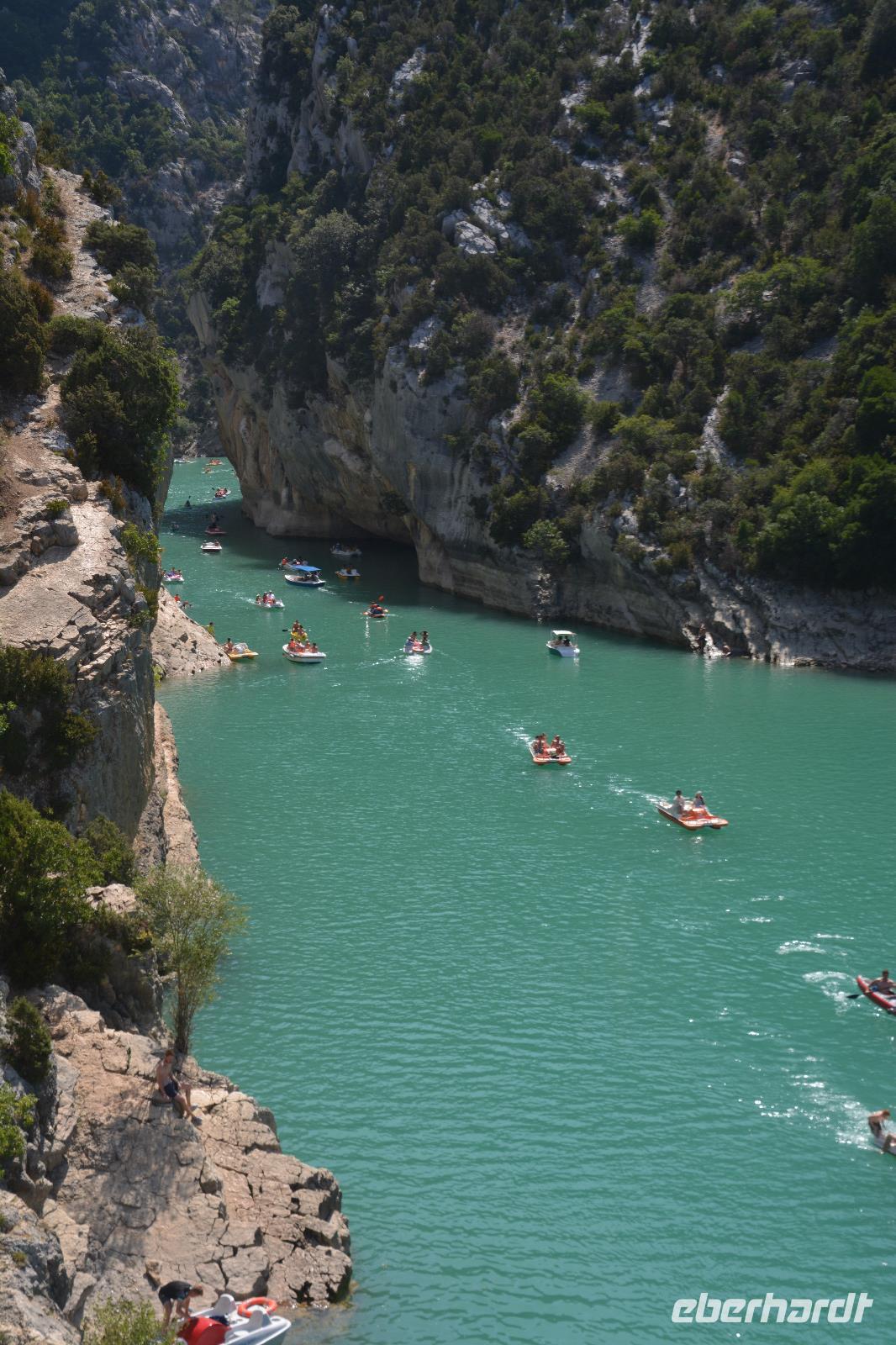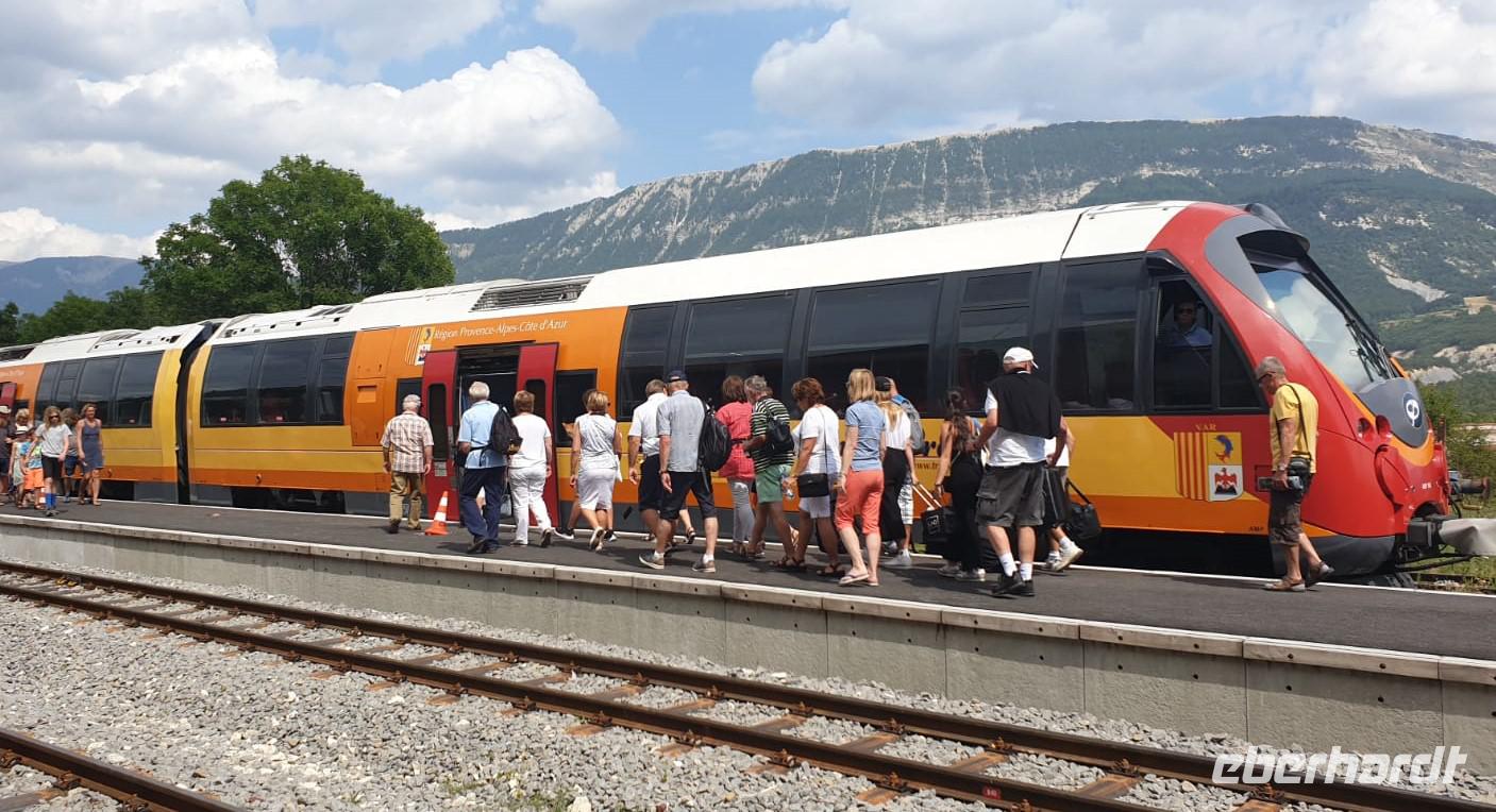 Dann noch einen Espresso in einem der netten Cafés und wir treffen wieder bei unserem Bus ein. Jetzt beginnt eine der landschaftlich spektakulärsten Strecken dieser Reise. Wir fahren von Moustiers in Richtung Lac de Sainte-Croix. Hier ist viel los, ist doch Ferienzeit und sowohl Franzosen als auch Touristen aus verschiedenen Ländern wollen diesen Canyon besuchten. Tretboote, andere Boote und sogar Badende (Wasser ist nicht so doll warm) tummeln sich am See. Wir machen ein paar Fotos und es geht weiter zu einem Aussichtspunkt, an dem wir eine "Würstlpause" einlegen. Herrlich ist die Aussicht von hier auf den See und mit den bunten Tupfen der Tretboote und der Badenden ein schönes Motiv für die Fotografen, die heute ziemlich viel zu tun bekommen. Fotoapparat immer im Anschlag, ist die Devise. Wir fahren entlang des bis zu 700 m tiefen Canyons und halten manches Mal die Luft an. Aber wir fahren ja mit Harald der seinen Bus beherrscht. Die Schlucht ist am Grund zwischen 6 und 100 Meter breit, den man aber erst am unteren Ende sehen kann. Prächtig sind die Aussichten und ein Fotostopp spektakulärer als der andere. Am Ende der Schlucht sind Rafting-Schlauchboote aktiv die sich an den Stromschnellen des Canyons versuchen. Wir müssen uns beeilen, denn wir haben auch heute noch eine Bahnfahrt vor uns: die Fahrt mit dem "Pinienzapfenzug" von Saint-André-les-Alpes nach Nizza. Wir kommen gerade noch rechtzeitig. Gina kauft die Fahrkarten und dann geht es durch die Landschaft der Provence und die Ausläufer der Seealpen in Richtung Mittelmeer. Wir kommen am Abend in der wohl schönsten Stadt der Cote d'Azur in Nizza an. Leider wird unsere Ankunft im Hotel durch einen kleinen Unfall in der verkehrsreichen Stadt verzögert. Aber schließlich gibt es eine vorläufige Einigung zwischen den Unfallpartnern und wir können zu unserem Hotel, welches in der Innenstadt von Nizza liegt. Der Parkplatz ist direkt beim Hotel und wir beschließen unseren Tag in dem komfortablen Novotel. Auf dem Dach gibt es sogar ein Schwimmbad. Hier bleiben wir 3 Nächte.