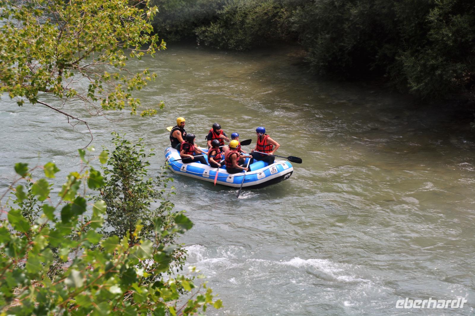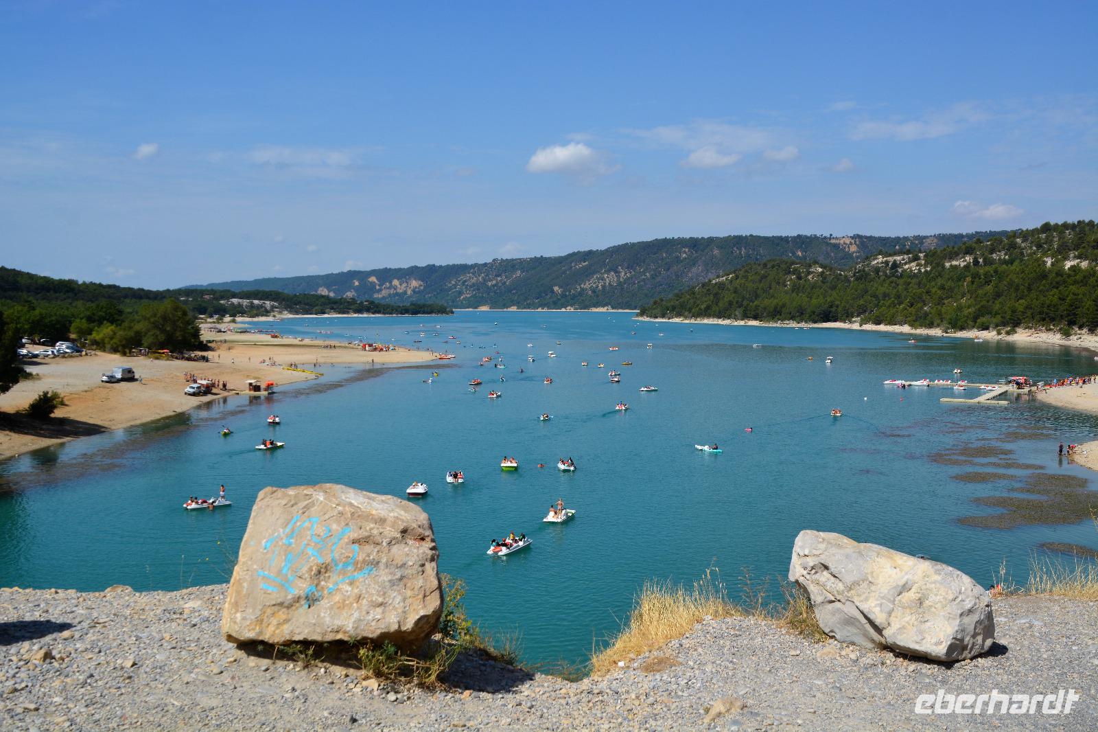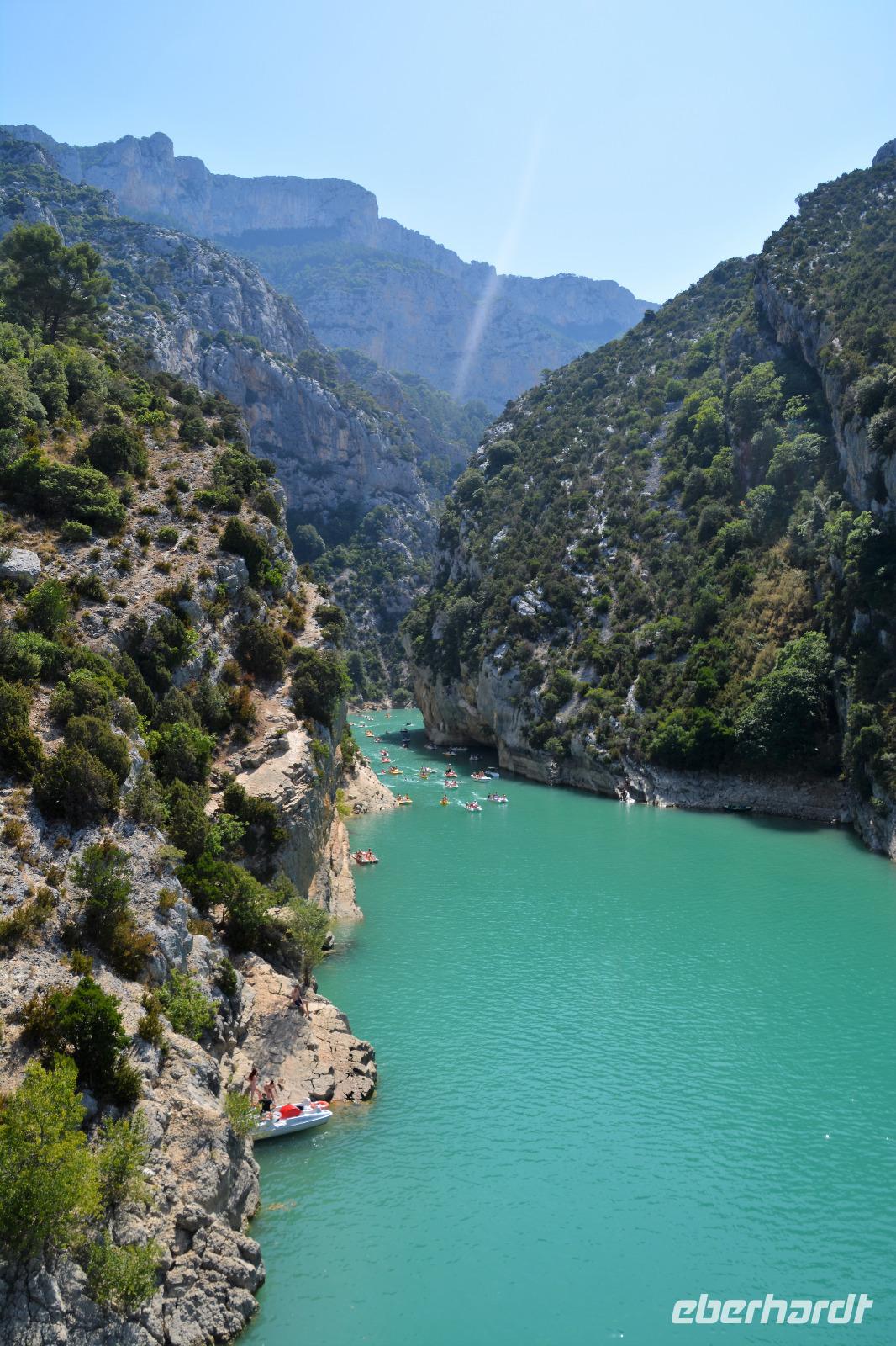 Dann noch einen Espresso in einem der netten Cafés und wir treffen wieder bei unserem Bus ein. Jetzt beginnt eine der landschaftlich spektakulärsten Strecken dieser Reise. Wir fahren von Moustiers in Richtung Lac de Sainte-Croix. Hier ist viel los, ist doch Ferienzeit und sowohl Franzosen als auch Touristen aus verschiedenen Ländern wollen diesen Canyon besuchten. Tretboote, andere Boote und sogar Badende (Wasser ist nicht so doll warm) tummeln sich am See. Wir machen ein paar Fotos und es geht weiter zu einem Aussichtspunkt, an dem wir eine "Würstlpause" einlegen. Herrlich ist die Aussicht von hier auf den See und mit den bunten Tupfen der Tretboote und der Badenden ein schönes Motiv für die Fotografen, die heute ziemlich viel zu tun bekommen. Fotoapparat immer im Anschlag, ist die Devise. Wir fahren entlang des bis zu 700 m tiefen Canyons und halten manches Mal die Luft an. Aber wir fahren ja mit Harald der seinen Bus beherrscht. Die Schlucht ist am Grund zwischen 6 und 100 Meter breit, den man aber erst am unteren Ende sehen kann. Prächtig sind die Aussichten und ein Fotostopp spektakulärer als der andere. Am Ende der Schlucht sind Rafting-Schlauchboote aktiv die sich an den Stromschnellen des Canyons versuchen. Wir müssen uns beeilen, denn wir haben auch heute noch eine Bahnfahrt vor uns: die Fahrt mit dem "Pinienzapfenzug" von Saint-André-les-Alpes nach Nizza. Wir kommen gerade noch rechtzeitig. Gina kauft die Fahrkarten und dann geht es durch die Landschaft der Provence und die Ausläufer der Seealpen in Richtung Mittelmeer. Wir kommen am Abend in der wohl schönsten Stadt der Cote d'Azur in Nizza an. Leider wird unsere Ankunft im Hotel durch einen kleinen Unfall in der verkehrsreichen Stadt verzögert. Aber schließlich gibt es eine vorläufige Einigung zwischen den Unfallpartnern und wir können zu unserem Hotel, welches in der Innenstadt von Nizza liegt. Der Parkplatz ist direkt beim Hotel und wir beschließen unseren Tag in dem komfortablen Novotel. Auf dem Dach gibt es sogar ein Schwimmbad. Hier bleiben wir 3 Nächte.