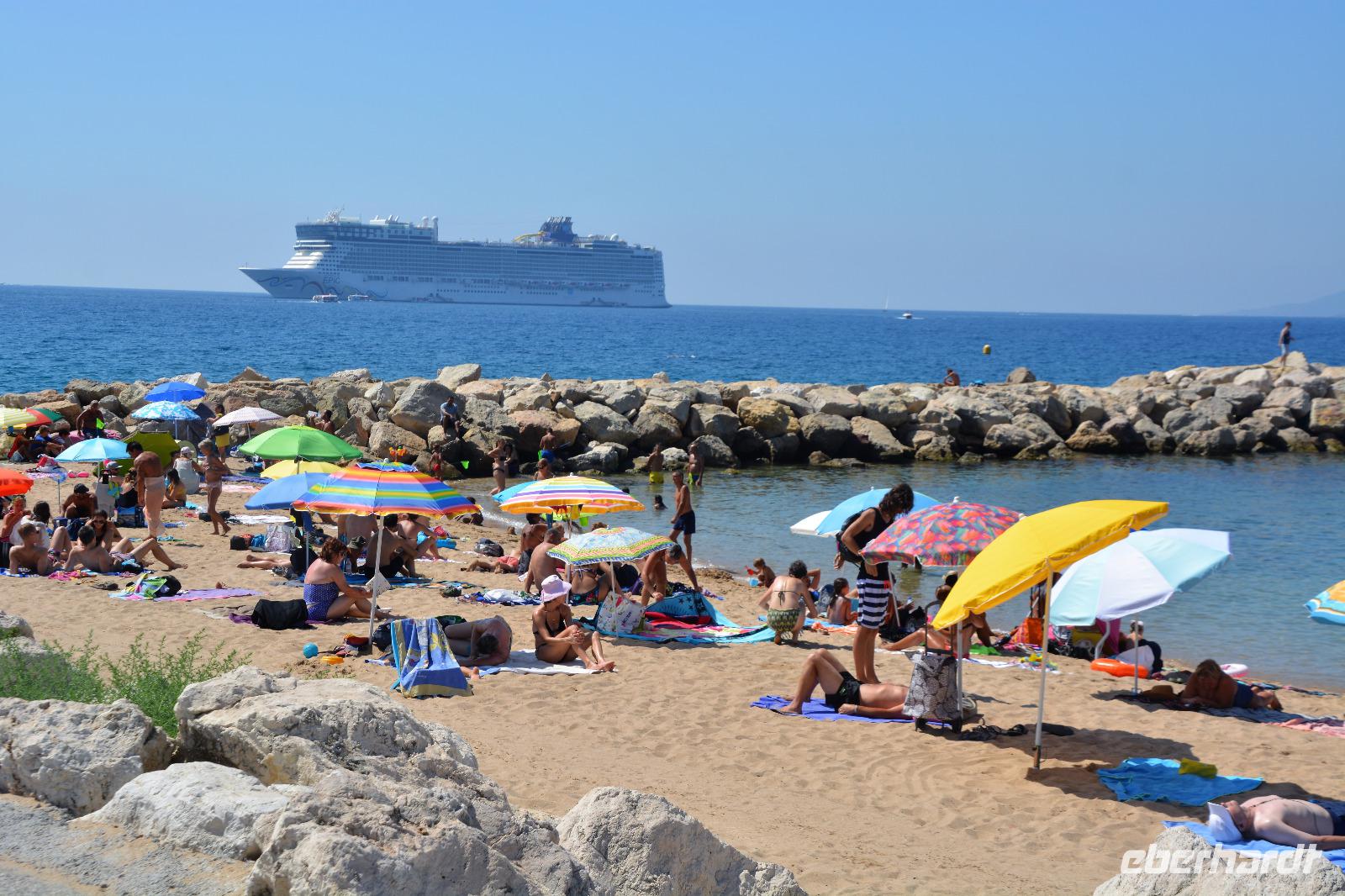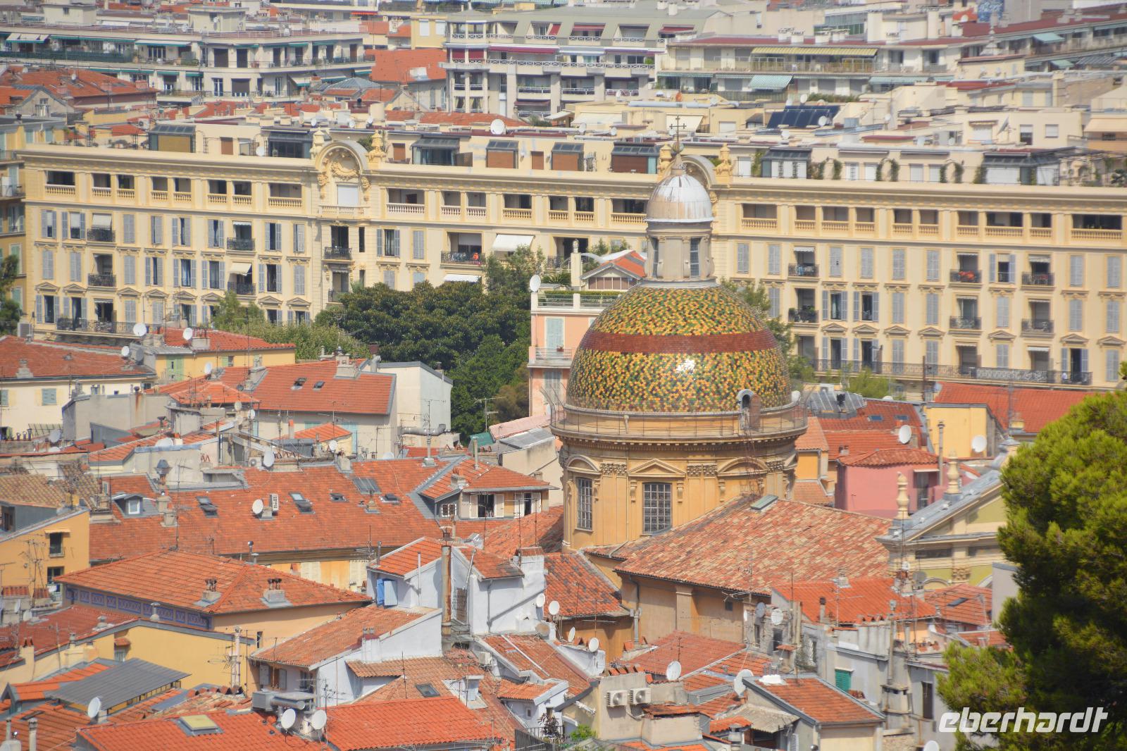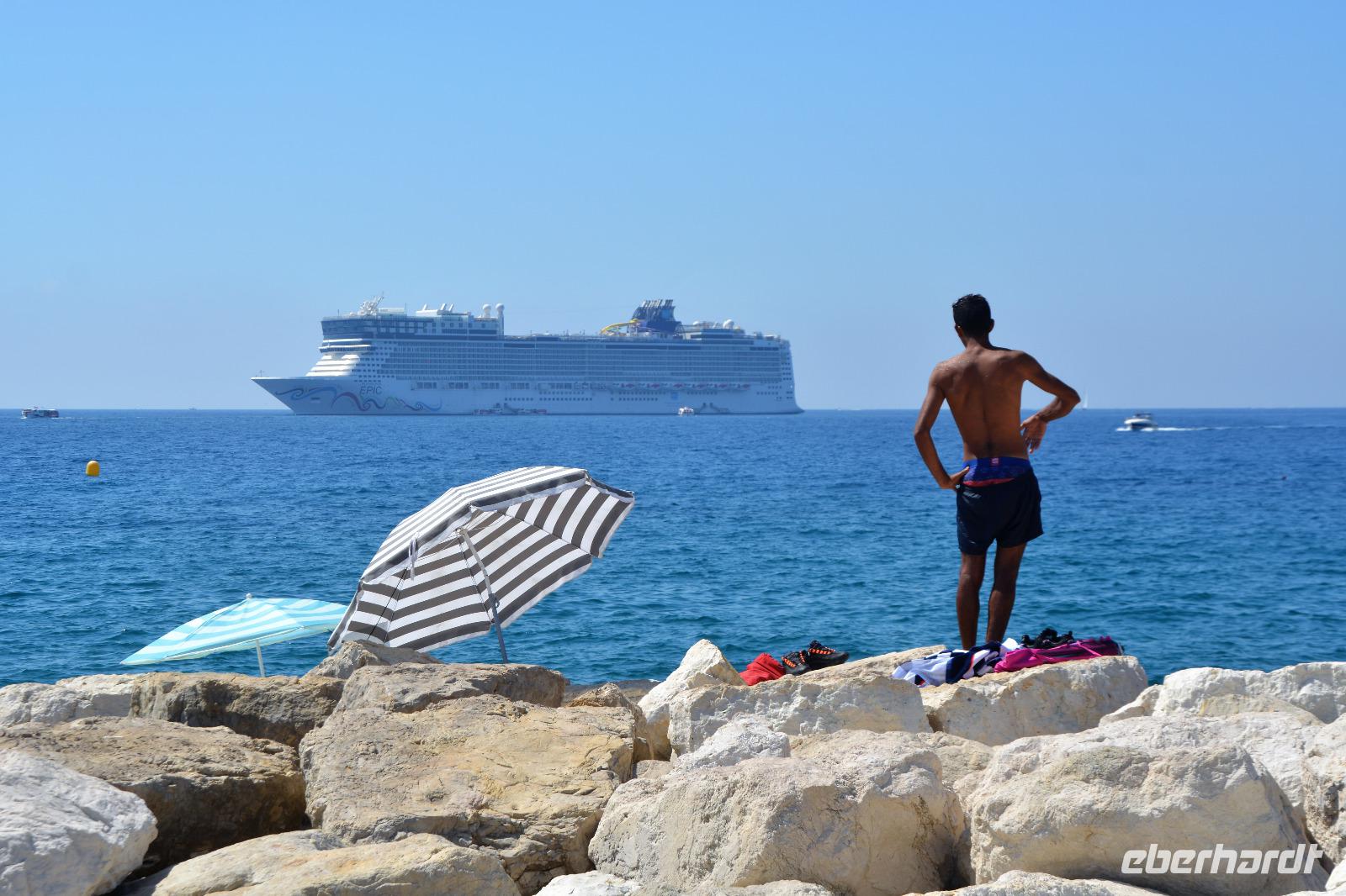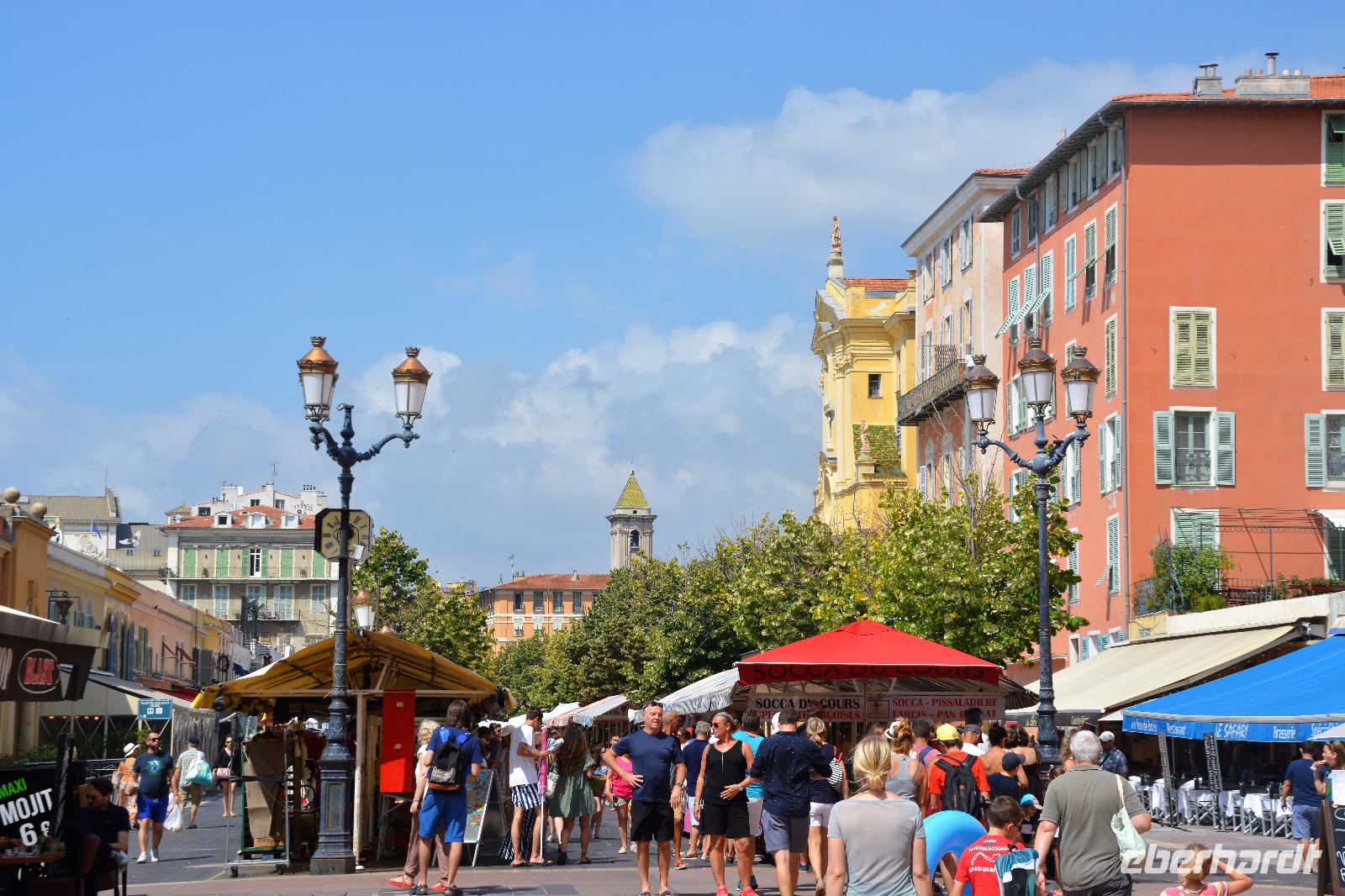 Nach einem üppigen Frühstück starten wir heute mal ein wenig später, d.h. wir können ausschlafen. Nur nicht zu lange, denn es wird wieder heiss werden und Nizza ist eine interessante Stadt. Wir fahren mit unserem Bus vorbei an dem sehr italienisch anmutenden "Place Massena", zum "Boulevard des Anglais", übersetzt "Boulevard der Engländer". Er heisst so, weil es einst Engländer waren die zum Aufschwung der Stadt im 19.Jahrhundert beitrugen. Ein weiterer Faktor war der Bau der Eisenbahnlinie, die 1864 die Stadt erreichte. Durch den Bau des Bahnhofs damals außerhalb der Stadt bliebt die Altstadt von Nizza gut erhalten. Hier logierte der europäische Hochadel, so der russische Zar und natürlich kam auch Queen Victoria hierher. Das "Grand Hotel Negresco" an welchem wir vorbeifahren ist ein Symbol dieser Zeit, wurde es doch im Auftrag des reichen Rumänen Henri Negresco erbaut. Kein Geringerer als Gustav Eiffel konstruierte die rosa Kuppel die weithin leuchtet - besonders nachts. Auch dieses Hotel hat seine Geschichte, wurde es doch zeitweilig als Militärkrankenhaus genutzt. Nach dem 2.Weltkrieg kamen die Stars, wie die Beatles, Romy Schneider und Alain Delon, Edith Piaf, die berühmte französische Chansonsängerin und auch Clint Eastwood. Heute kann man es sich im Stil der Belle Époque in einem der fast 100 Zimmern gute gehen lassen, wenn man bereit ist das nötige Kleingeld auszugeben. Am Garten Albert I. verlassen wir den Bus und gehen entlang der Promenade in Richtung Altstadt. Ein Liegestuhl hier kostet hier einiges pro Tag, aber ist eigentlich unabdingbar bleibt man länger zum Baden, denn der Strand ist ein grober Kiesstrand auf dem das Liegen nicht unbedingt sehr bequem ist. Aber darum geht es in Nizza eigentlich nicht. Sehen und gesehen werden ist die Devise. Jetzt am Morgen sind die Jogger und die Walker auf der Promenade. Wir gehen vorbei an der Oper zum lebendigsten Platz der Altstadt, dem Cour Saleya mit dem Blumenmarkt auf dem es nicht nur Blumen sondern alle Lebensmittel gibt, welche die Provence zu bieten hat. Hier wird auch die "Socca" gegrillt, eine Art Fladen aus Kichererbsenmehl. Vorbei geht es an der Barockkirche "Chapelle de la Misercorde" welche im Juli/August leider geschlossen hat. Wir laufen bis zum östlichen Ende des Marktes und werfen einen Blick auf das Haus in dem Henri Matisse eine Zeitlang lebte. Dann biegen wir ab in die Altstadt und gehen durch enge Gassen mit buntem Treiben zur Kathedrale Sainte-Reparate aus dem 17.Jahrhundert. Gerade ist ein Gottesdienst und wir setzen uns ein Weilchen dazu, denn die Musik ist schön und ergreifend. Ein wenig feierliche und besinnliche Stimmung im sonst hektischen Nizza. Auch Nicht-Gläubige werden von der Musik und der Szenerie ergriffen.