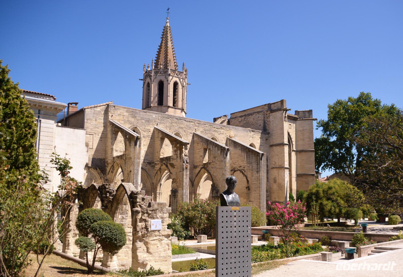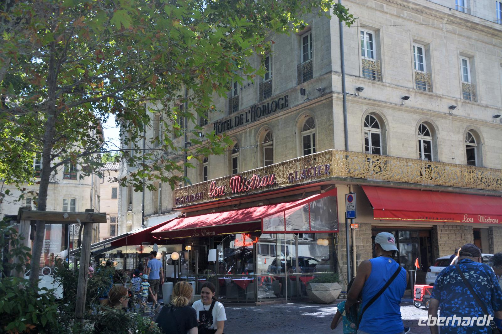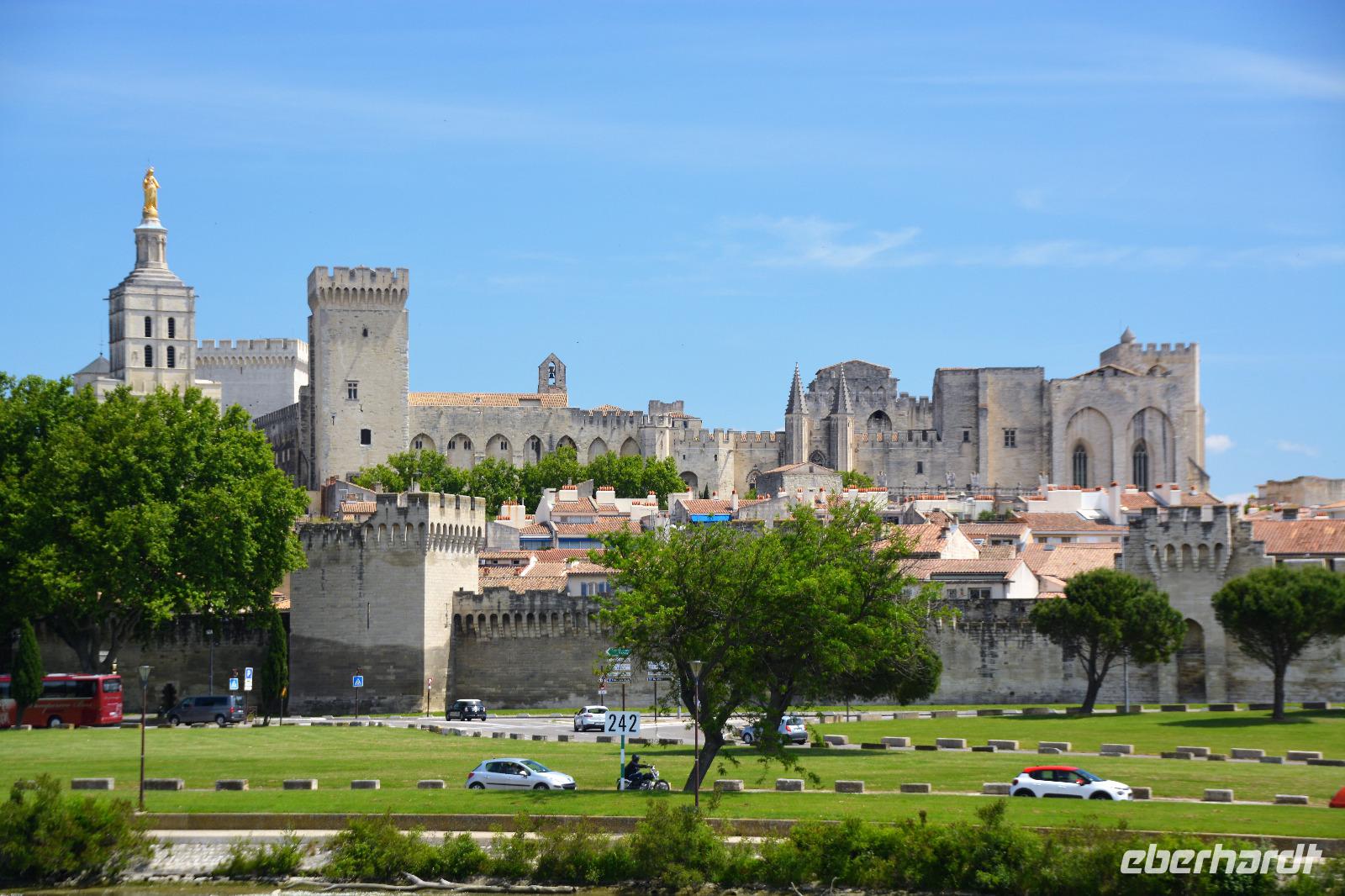 Jetzt sind wir ohne Bus und auf eine gute Organisation angewiesen. Die "Pont St. Bénézet" die berühmte Brücke von Avignon grüßt schon von Weitem. Wir spazieren durch eins der 7 Stadttore der Stadtmauer, welche die Altstadt von Avignon umgibt. Ein wenig geht es bergauf bevor wir zum berühmten gotischen Papstpalast ankommen. Die Stadt welche schon im 4.Jahrtausend vor Christus besiedelt und dann von den Römern zu einem befestigten Flusshafen ausgebaut wurde, Sarazenen und die Völkerwanderung überstand, war von 1309 bis 1423 Papstsitz. Insgesamt 7 Päpste ließen es sich hier gut gehen.