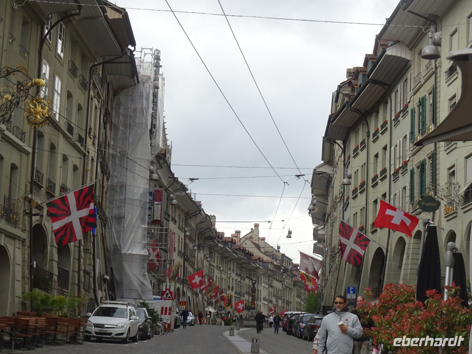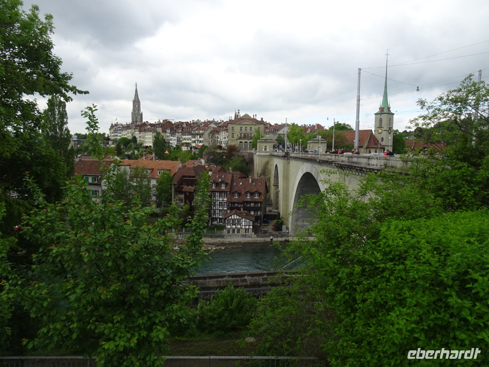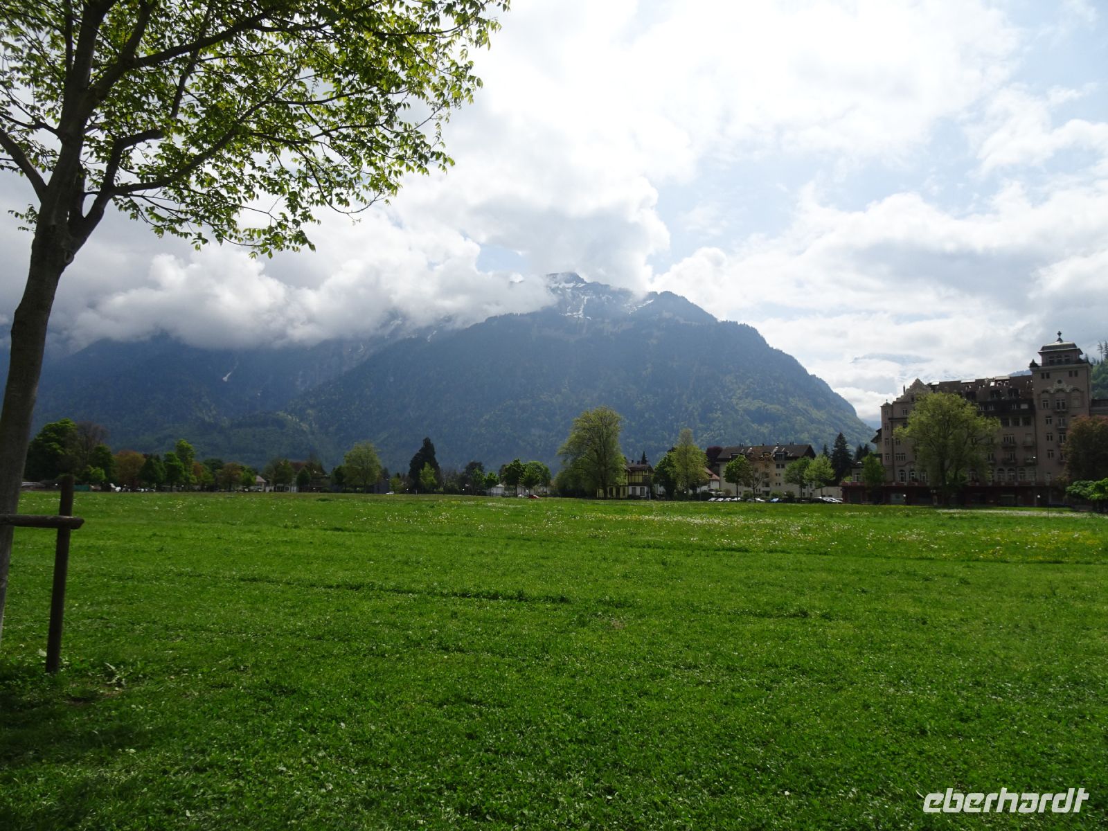 Vorbei an Basel ging es staufrei nach der Bundeshauptstadt Bern. Da wir zeitlich gut unterwegs waren, konnten wir hier einen kurzen Halt einlegen. Wir hielten am Bärenpark (mit echten Braunbären im Gehege!), überquerten die Aare und unternahmen einen kleinen Rundgang durch die Altstadt von Bern. Sehenswürdigkeiten waren hier das Rathaus und in der Ferne der Zytgloggeturm, den einige Reisegäste dank Teleobjektiv auch auf die Speicherkarte zauberten. Dann ging es weiter vorbei am Thunersee nach Interlaken. Der Ort liegt unmittelbar am Gebirgsstock des Jungfrau-Eiger-Mönch-Massivs. Trotz des bewölkten Wetters hatten wir von den zentral in Interlaken gelegenen und Dank kluger Entscheidung einiger Interlakener Bürger seit dem 19. Jahrhundert nicht bebaubaren Höhenmatten einen guten Blick auf die umgebenden Bergketten des Berner Oberlandes.