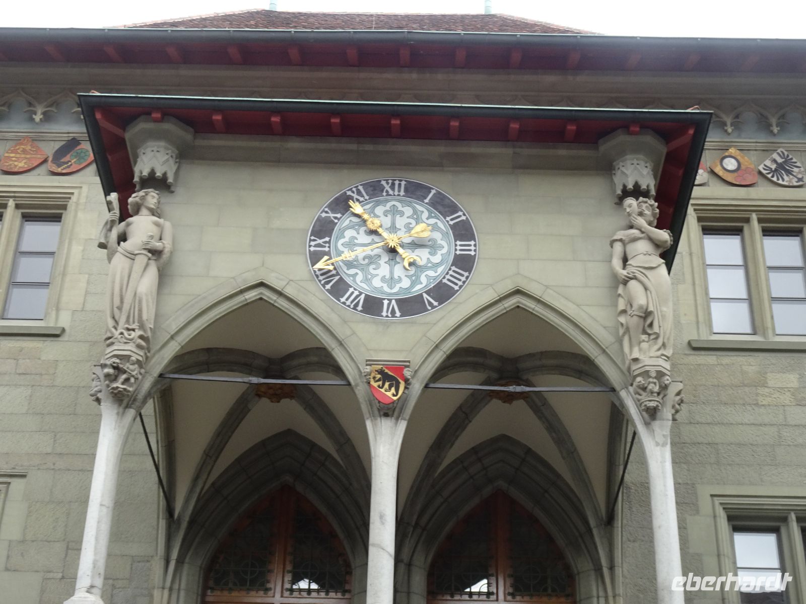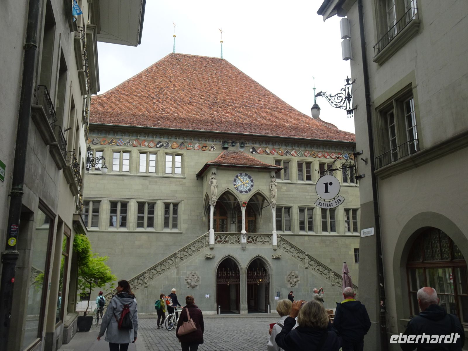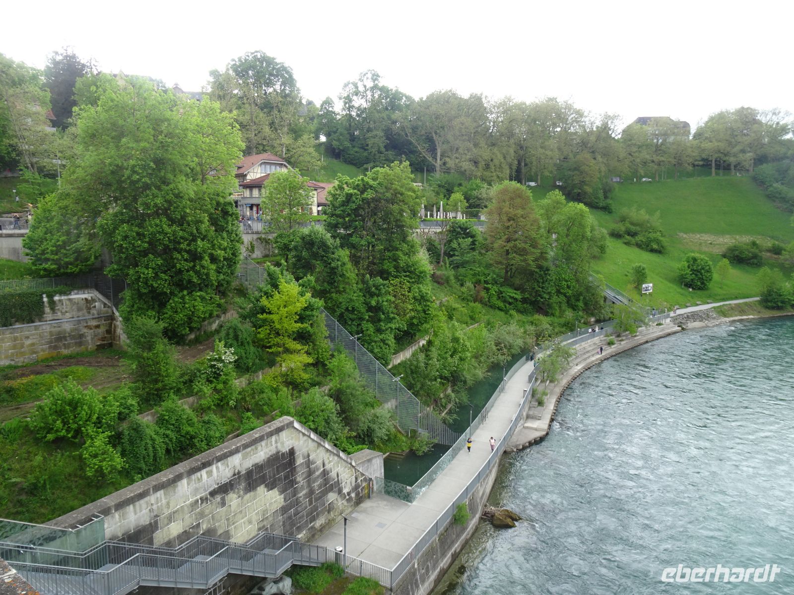 Vorbei an Basel ging es staufrei nach der Bundeshauptstadt Bern. Da wir zeitlich gut unterwegs waren, konnten wir hier einen kurzen Halt einlegen. Wir hielten am Bärenpark (mit echten Braunbären im Gehege!), überquerten die Aare und unternahmen einen kleinen Rundgang durch die Altstadt von Bern. Sehenswürdigkeiten waren hier das Rathaus und in der Ferne der Zytgloggeturm, den einige Reisegäste dank Teleobjektiv auch auf die Speicherkarte zauberten. Dann ging es weiter vorbei am Thunersee nach Interlaken. Der Ort liegt unmittelbar am Gebirgsstock des Jungfrau-Eiger-Mönch-Massivs. Trotz des bewölkten Wetters hatten wir von den zentral in Interlaken gelegenen und Dank kluger Entscheidung einiger Interlakener Bürger seit dem 19. Jahrhundert nicht bebaubaren Höhenmatten einen guten Blick auf die umgebenden Bergketten des Berner Oberlandes.