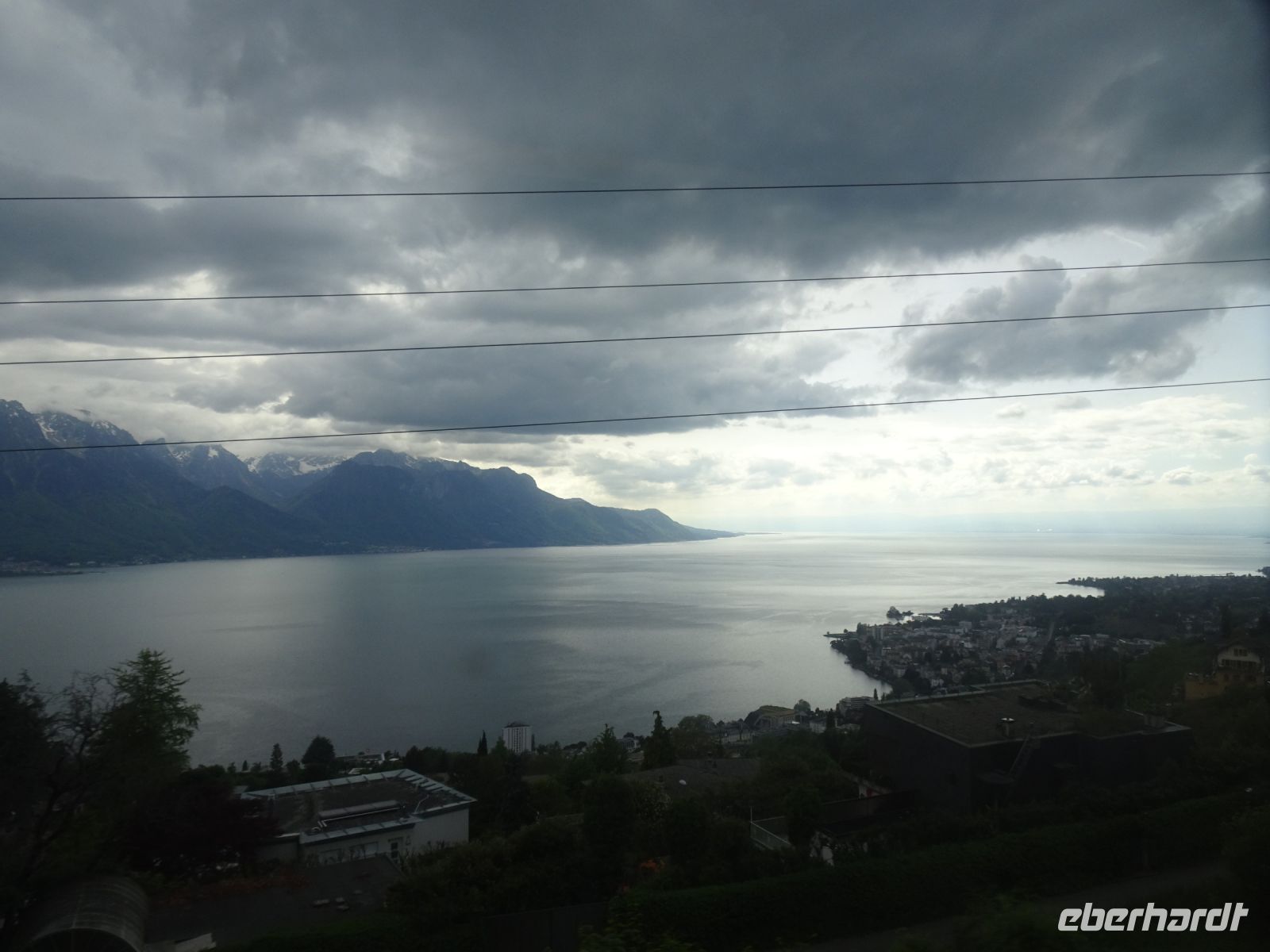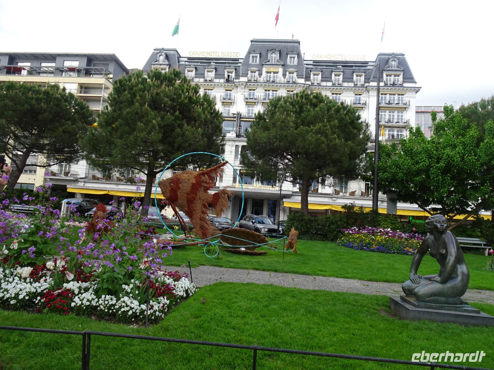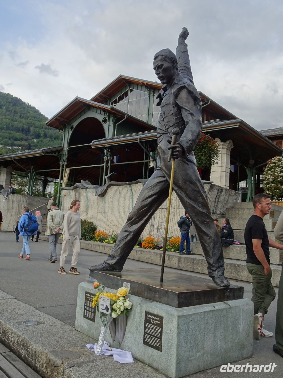 Nach kurzer Zeit ging es dann durch das Simmental, bekannt durch das Simmentaler Haus im schweizerischen Chaletstil, weiter zum Bahnhof Gstaad. Hier wollten wir den GoldenPass Panoramic Zug pünktlich erreichen. Wir waren rechtzeitig in Gstaad und konnten auf der sonntäglich ruhigen Promenade in Gstaad schlendern, einen Blick auf das über dem Ort thronende Hotel Palace werfen und auch ein Eis oder einen Kaffee genießen. Weiter ging es dann wie geplant nach Montreux mit dem GoldenPass Panoramic durch eine herrliche Landschaft, vorbei an den Orten Chateáu d´Oex und Rossiniere. Besonders interessant: auf Anregung unseres Reiseleiter unterhielten wir uns mit dem Zugbegleiter. Mit glänzenden Augen und offensichtlicher Freude an seiner Tätigkeit gab er uns bereitwillig Antworten auf unser Fragen. Und: an der im 1112 m langen Jaman-Tunnel liegenden Sprachgrenze wechselte er mit Vergnügen zur französischen Sprache. Schon bald sahen wir den Genfersee. Wir erreichten Montreux am späten Nachmittag und hatten noch Zeit, entlang der Uferpromenade eine kleinen Bummel zum Freddy-Mercury-Denkmal, dem ehemaligen Sänger der englischen Rockband "Queen", zu machen. Wie verhalten die Touristenbesuche noch sind war daran zu erkennen, dass nur ein einziger Blumenstrauß mit Karte einer seiner Verehrerinnen am Denkmal lag. Das war bis vor 3 Jahren ganz anders, da konnte man kaum vor internationaler Fangemeinde bis an das Denkmal rankommen!