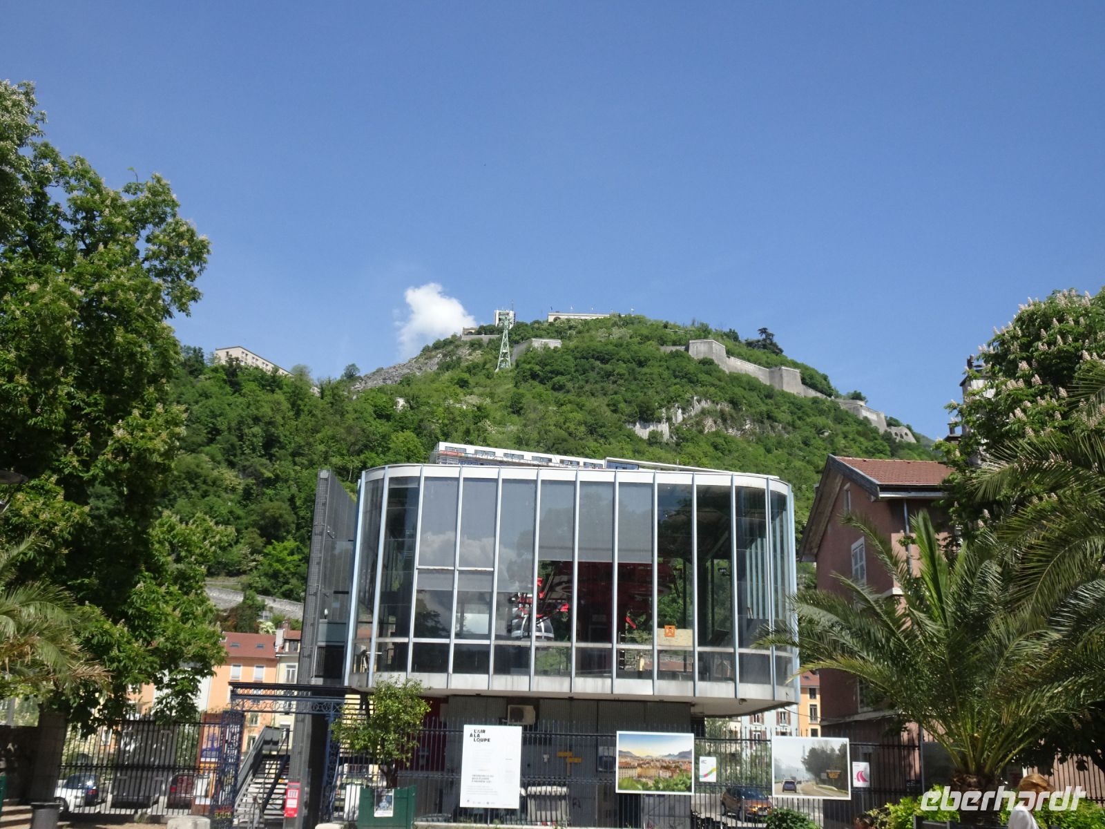 Die Zeit bis zur Auffahrt zur Bastille verbachten wir im Stadtgarten, mit über hundertjährigen Platanen und Linden sehr attraktiv. Die Auffahrt auf die Bastille ist seit 1934 mit einer Seilbahn möglich, die 1976 modernisiert wurde. Mit 5 Kugeln, in der jeweils 6 Personen Platz haben, wird der Höhenunterschied von 260 m in kurzer Zeit überwunden.