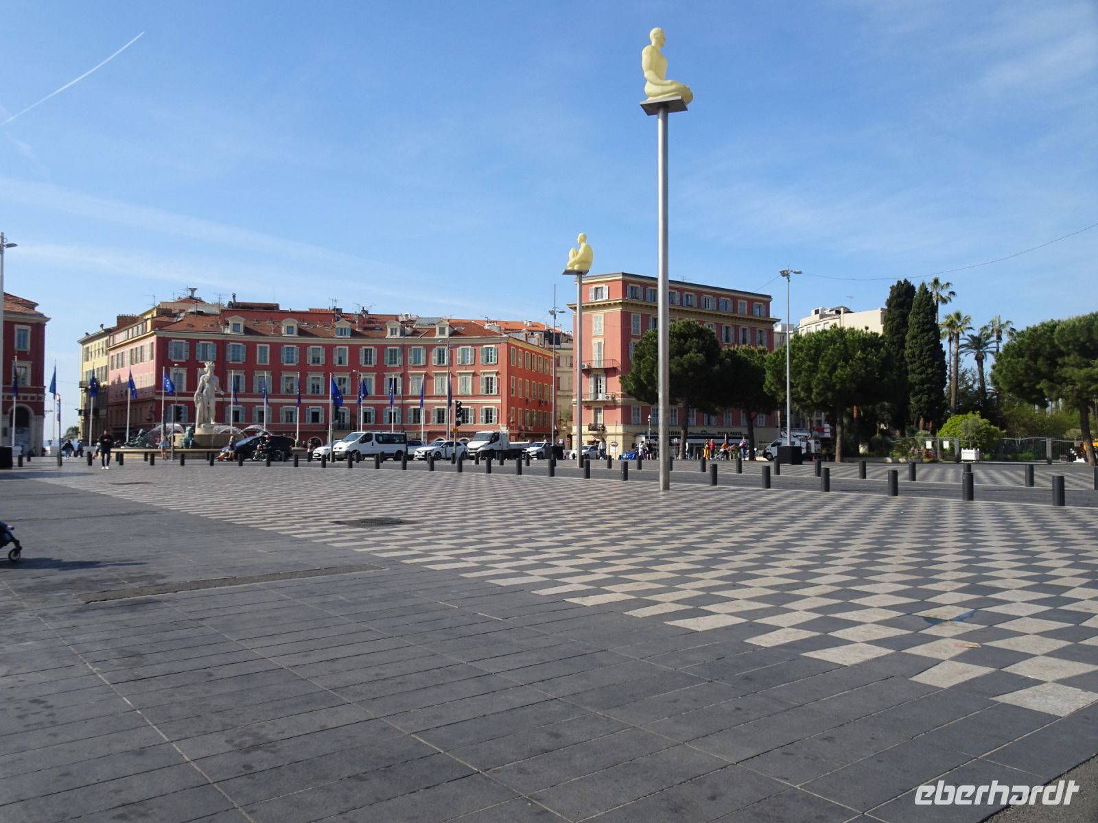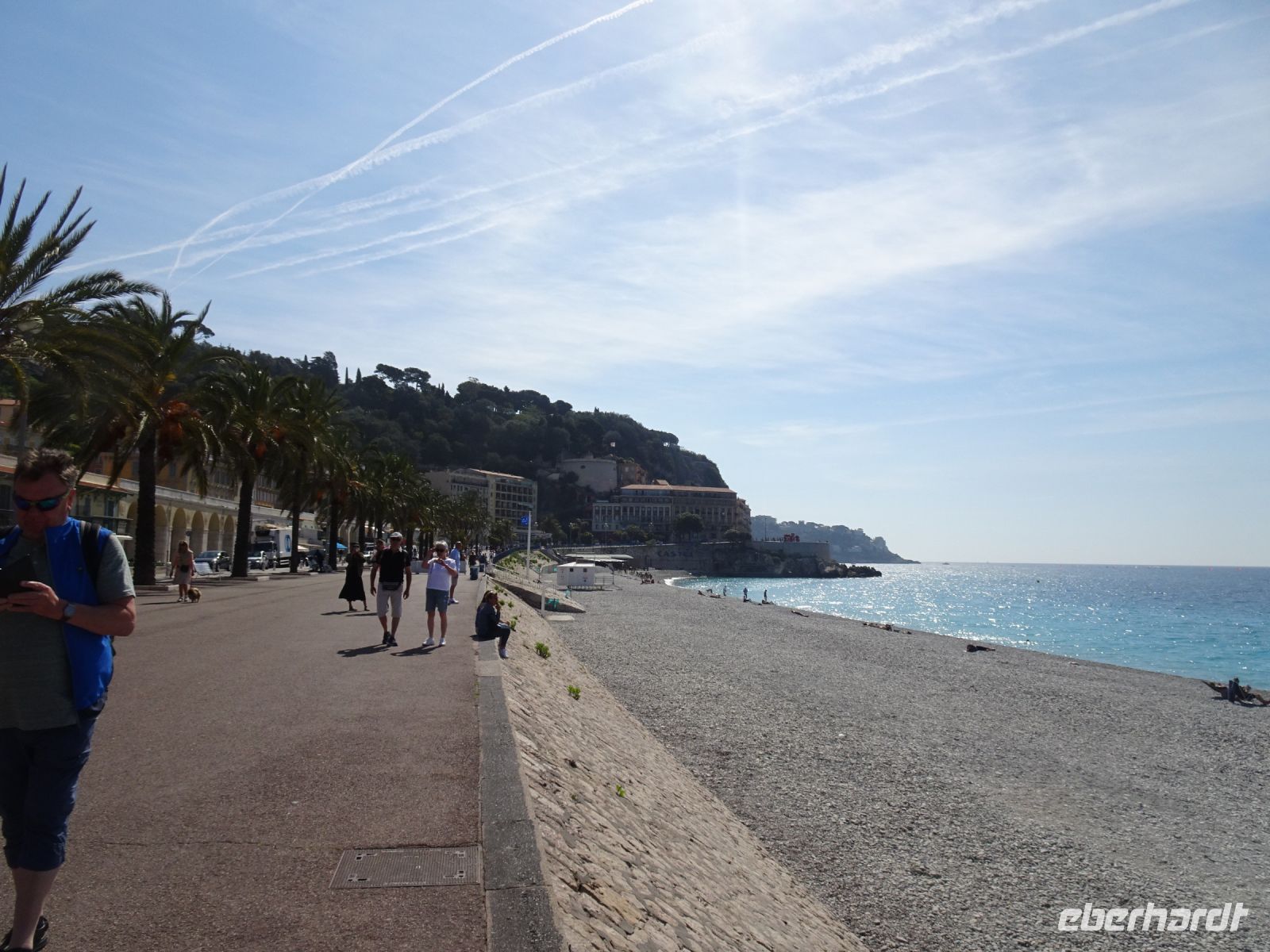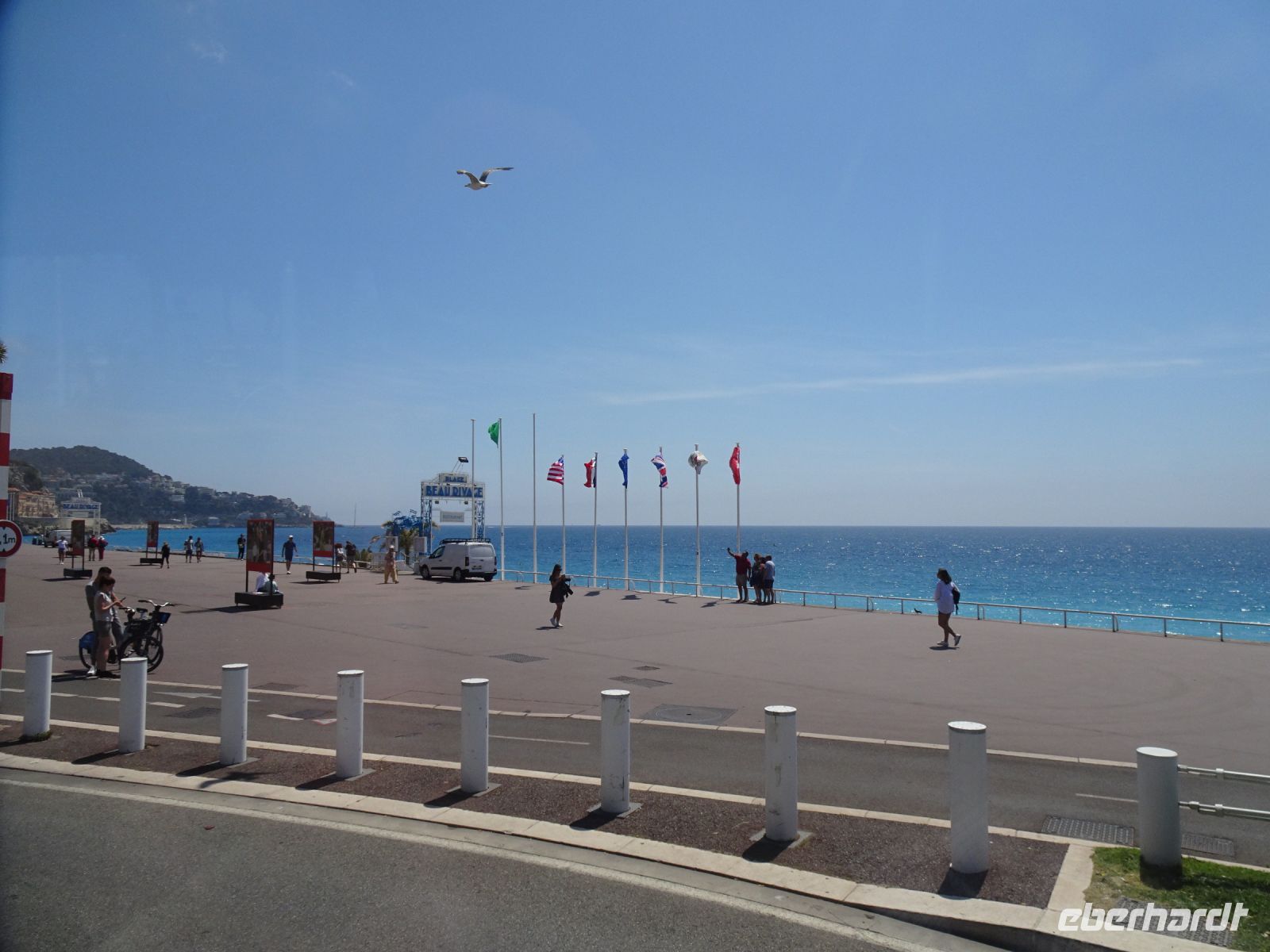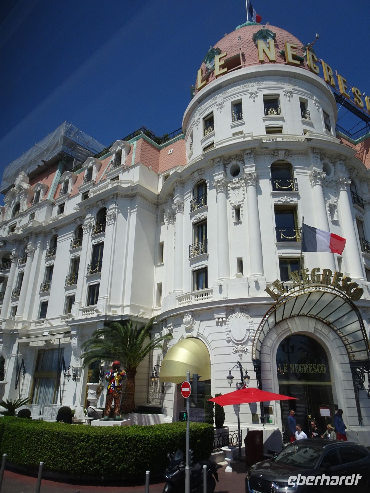 Nach einem umfangreichen Frühstücksbuffet stand am nunmehr sechsten Tag Nizza und wer es denn wollte Monaco auf dem Programm. Bereits um 9 Uhr nahm uns am Hotel unsere örtliche Reiseleiterin Annelies unter ihre Fittiche. Wir fuhren mit einer modernen Straßenbahn in die Innenstadt bis zum Place Masséna. Hier war vor allem der Brunnen du Soleil mit der krönenenden Apollo-Statue Anlass für umfangreiche Informationen von Annelies. Aber auch die die 7 Kontinente verkörpernden 7 Charaktere auf Säulen des Künstlers Jaume Plensa, die abends erleuchtet werden, waren von Interesse. Weiter ging es zu Fuß zum Rathaus, der Oper und unmittelbar gegenüberliegend der historischen Confiserie "Auer". Wunderbare Auslagen, regionale Spezialität sind die kandierten Früchte - hmmmm! Und dann der Blumenmarkt - südliches Flair pur. Bei bestem Wetter gab es viele bunte und schöne Bilder. Kennen Sie die regionale Spezialität Socca? Hier gibt es diese Kichererbsenfladen direkt auf dem Markt frisch und noch ganz heiß. Wohlbekannt: Socca bei Theresa. Einige Reisegäste haben diese Spezialität natürlich auch probiert. Bei einem kurzen Abstecher zum Strand hatten wir einen wunderbaren Blick auf die Küste von Nizza. Weiter ging es zu Fuß durch die Altstadt mit vielen kleinen Läden zur Kathedrale St. Réperate. So hatten wir genügend Anregungen für etwas Freizeit, bevor wir uns um 12 Uhr vor unserem Hotel zur Stadtrundfahrt mit unserem Bus und unserem Fahrer Sergey trafen. Damit konnten wir einige zentrumsfernere Bereiche, wie z. B. den Stadtteil Chimiez mit dem prunkvollsten Belle-Époque-Bau Palais Régina, gewidmet der englischen Königin Victoria, dem Amphitheater und einigen kirchlichen Einrichtungen, ansehen. Auch die Promenade des Anglais fuhren wir lang und bestaunten die vielen historischen heute jedoch modern ausgestatteten Hotels, wie z. B. das Hotel Negresco.