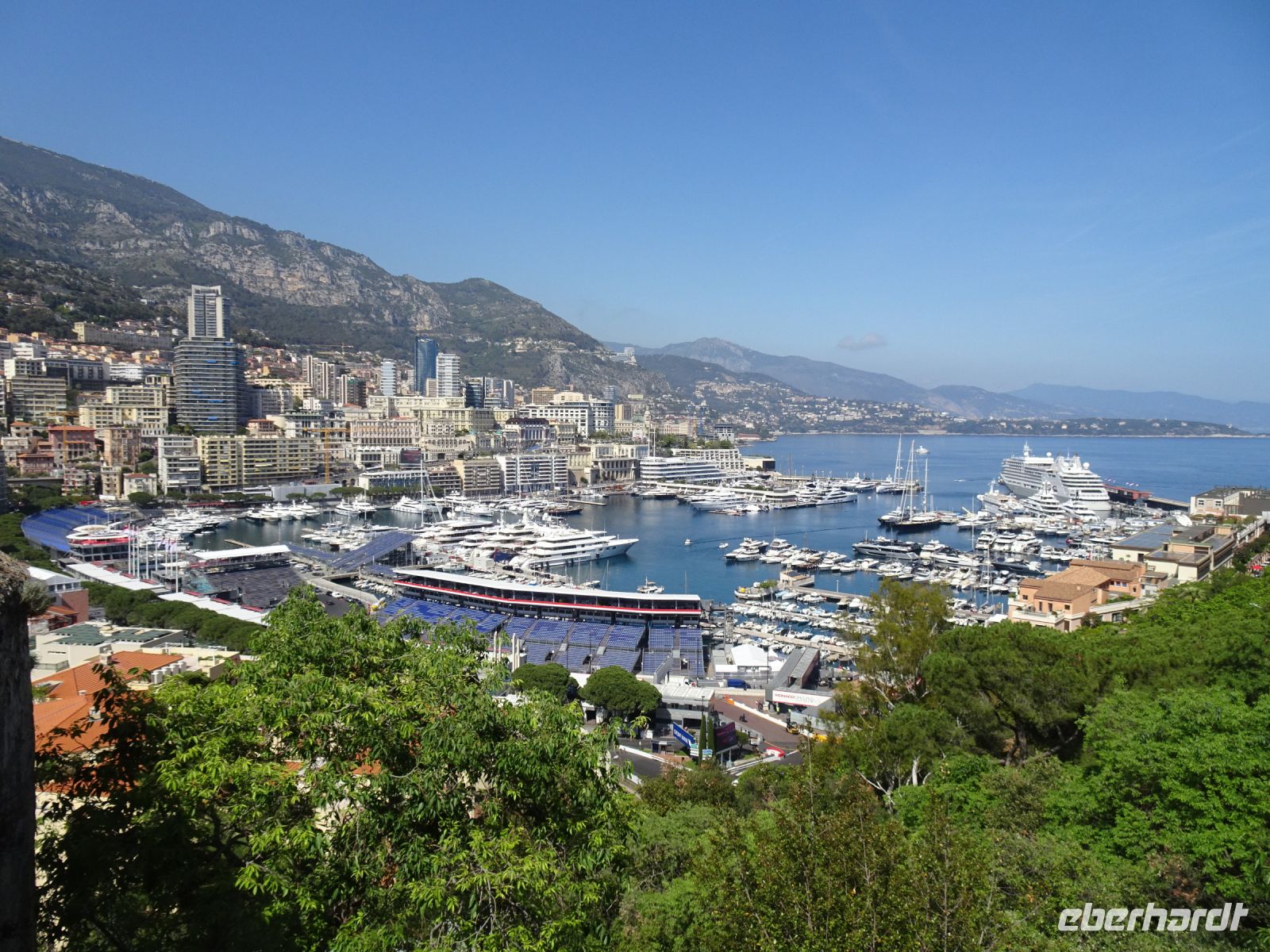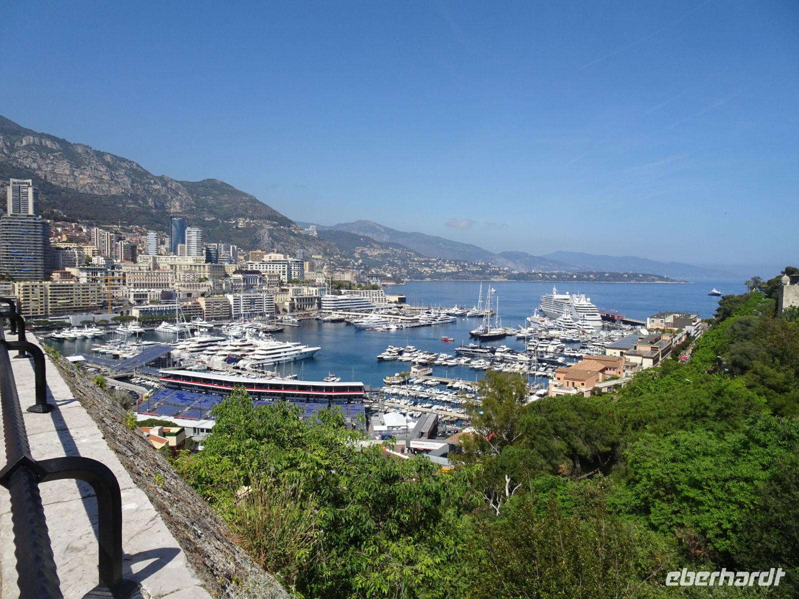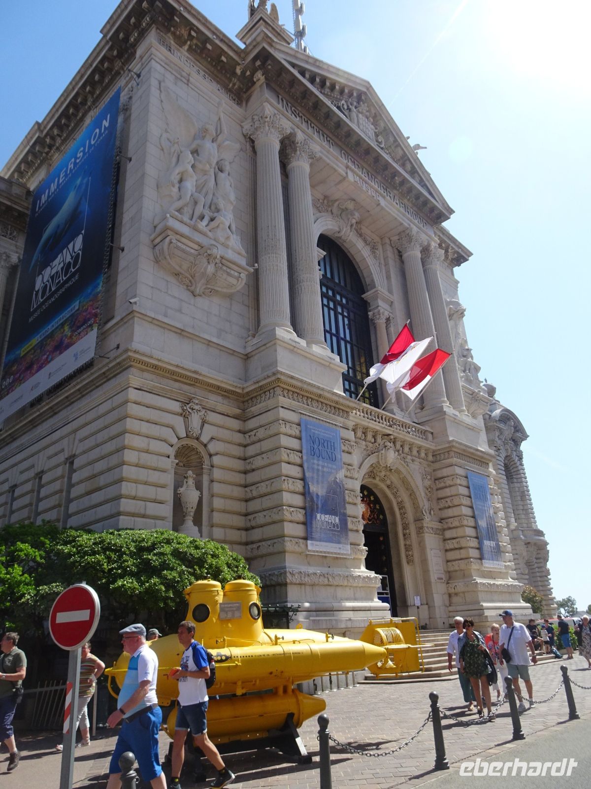 Anschließend ging es für die Reisegäste, die es wollten, weiter nach Monaco. Uns war bewusst, dass in Monaco die Grand Prix Rennen bevorstanden und aus diesem Grunde mit Verkehrschaos zu rechnen war. Bevor wir in Monaco ankamen, gab es eine schöne Tour entlang der Küstenstraße. Vorbei an den Nobelorten Beaulieu-sur-Mer, Eze und Cap-d´Ail gab Annelies umfassende Insiderkenntnisse zum Lebensstil und den Vorlieben der Reichen und Schönen zum Besten. In Monaco angekommen dann eine kurze Rundfahrt durch Monte-Carlo, wo wir in der Ferne auf das Casino schauen konnten. Anschließend mussten wir aussteigen und durch die quirlige Innenstadt zu Fuß zum Fürstenpalast gehen. Vorbei am Briefmarkenmuseum - wäre sicherlich auch interessant gewesen - und dem Zoo ging es auf "den Felsen - le Rocher", wie der Berg mit Fürstenpalast, Kathedrale und weiteren repräsentativen Gebäuden im Volksmund gern bezeichnet wird. Würdevoll krönt der Fürstenpalast derer von Grimaldi den Berg, Polizisten haben ein waches Auge auf unbeschwerte Touristen, die dem Palast zu nahe kommen, die großgewachsenen Wachsoldaten patroullieren und lösen sich regelmäßig ab - ein Eindruck wie aus einer anderen Welt! Anschließend besuchten wir die Kathedrale de Monaco mit den Gräbern der 1982 tödlich verunglückten Prinzessin Gracia Patricia und daneben das Grab von Fürst Rainier dem Dritten. Ebenfalls auf dem Berg ein paar Schritte weiter das Ozeanografische Museum. Sehenswert hier vor dem Museum das gelbe Unterseeboot, die Yellow Submarine. Nach etwas Freizeit und dem Blick von oben auf die Rennstrecke mit Besuchertribünen , Fahrerständen und sonstigen Dingen für den Medienrummel des Grand Prix ging es auf der mittleren Straße zurück nach Nizza. Auch heute wieder ein wunderschöner Tag bei bestem Wetter und damit Gelegenheit für viele Eindrücke und Fotos. Ergänzt durch die Informationen von Annelies, der wir für ihre Begleitung ganz herzlich dankten. Das Abendessen mussten wir an diesem Tag leider im Garten des Novotels einnehmen. Da merkten wir, dass die Witterung nach einem sehr sonnigen Tag abends doch etwas frisch war.