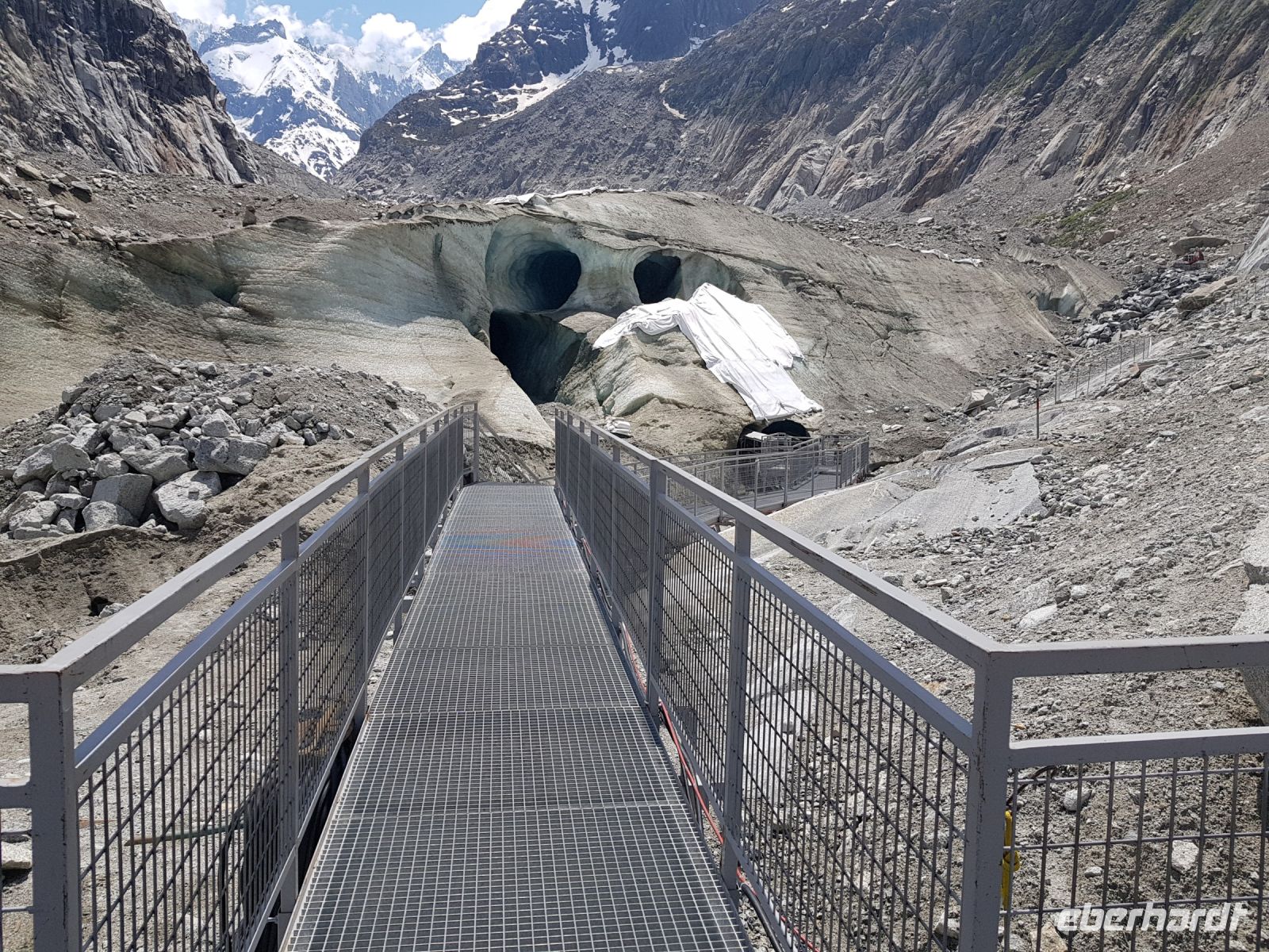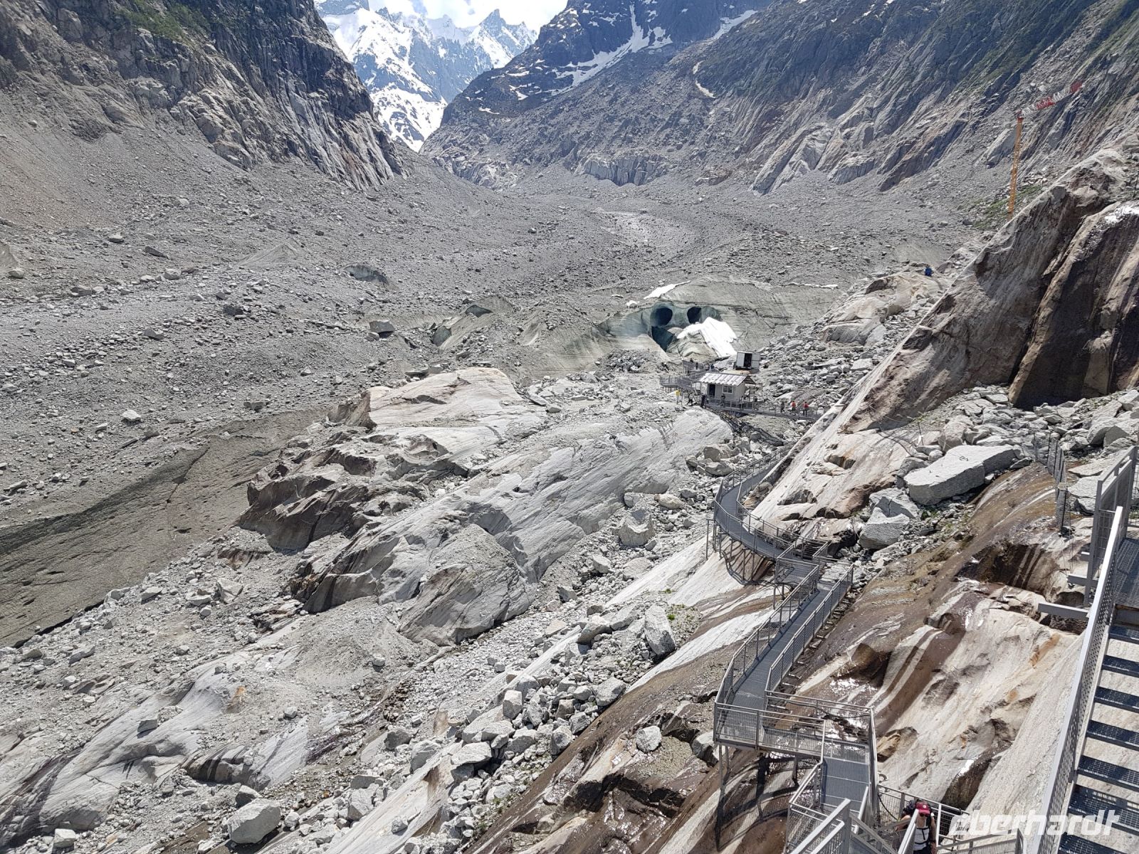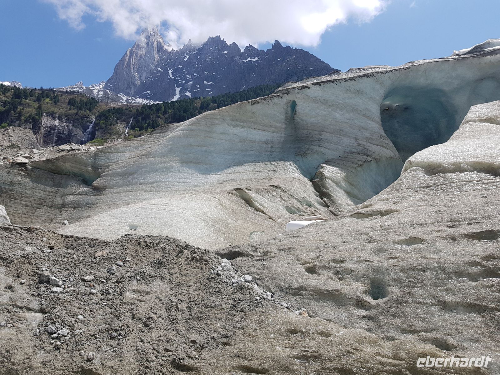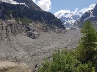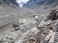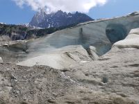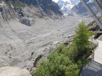 Dann stiegen wir in den Mont Blanc Express nach Chamonix. Diesmal hatten wir sehr viel mehr Glück mit unserer Panoramafahrt. Mit dem Wetter wurde auch die Aussicht immer besser. Atemberaubend schön wurde es dann nach unserem Umstieg in den französischen Panoramazug in Vallorcine, der uns bis hoch hinauf in das Mont Blanc Massiv führte. In Chamonix angekommen, besuchten einige von uns die berühmte Aiguille du Midi bei wolkenlosen Himmel und fantastischer Aussicht, während andere den „Eismeergletscher“ besuchten. Letzterer entpuppte sich jedoch vor allem als trockenes Gerölltal, an dessen Ende ein Zipfel des einst mächtigen Gletscher grade noch erkennbar war. Unzählige Treppenstufen führten zur inzwischen weit entfernten Eishöhle. Sie zu besuchen war ein beklemmendes „Vergnügen“, denn angesichts der rasanten Klimaerwärmung unseres Planeten ist es unwahrscheinlich, dass sie die nächsten Jahre überdauert.