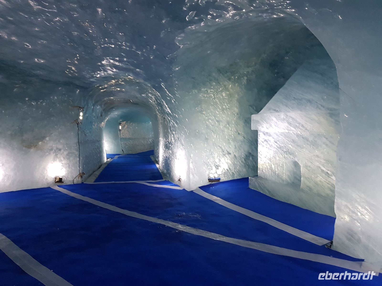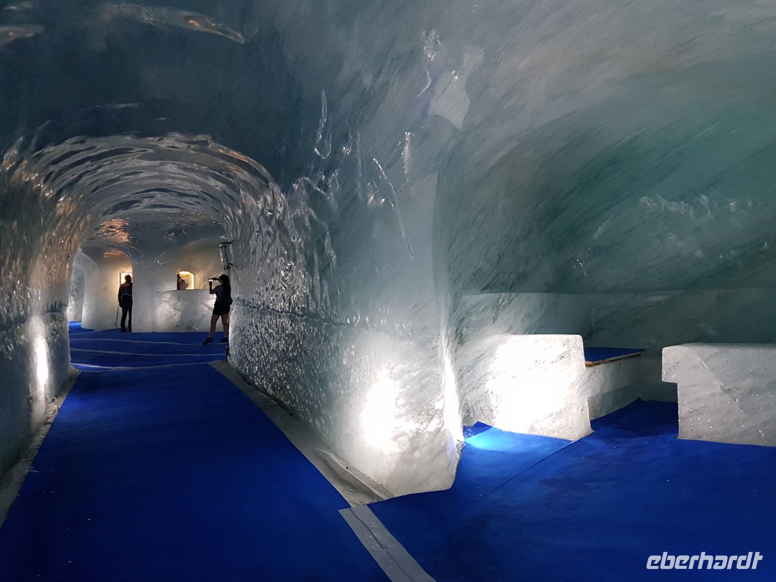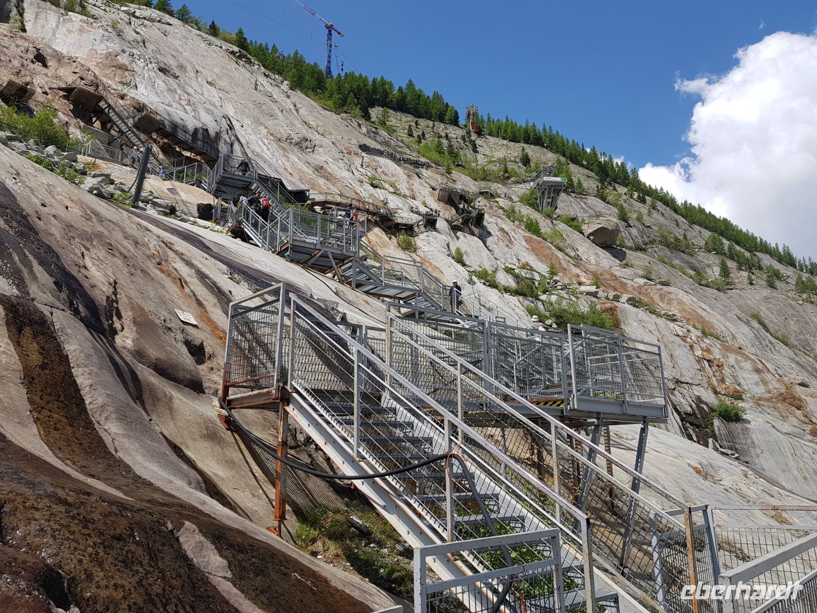 Dann stiegen wir in den Mont Blanc Express nach Chamonix. Diesmal hatten wir sehr viel mehr Glück mit unserer Panoramafahrt. Mit dem Wetter wurde auch die Aussicht immer besser. Atemberaubend schön wurde es dann nach unserem Umstieg in den französischen Panoramazug in Vallorcine, der uns bis hoch hinauf in das Mont Blanc Massiv führte. In Chamonix angekommen, besuchten einige von uns die berühmte Aiguille du Midi bei wolkenlosen Himmel und fantastischer Aussicht, während andere den „Eismeergletscher“ besuchten. Letzterer entpuppte sich jedoch vor allem als trockenes Gerölltal, an dessen Ende ein Zipfel des einst mächtigen Gletscher grade noch erkennbar war. Unzählige Treppenstufen führten zur inzwischen weit entfernten Eishöhle. Sie zu besuchen war ein beklemmendes „Vergnügen“, denn angesichts der rasanten Klimaerwärmung unseres Planeten ist es unwahrscheinlich, dass sie die nächsten Jahre überdauert.