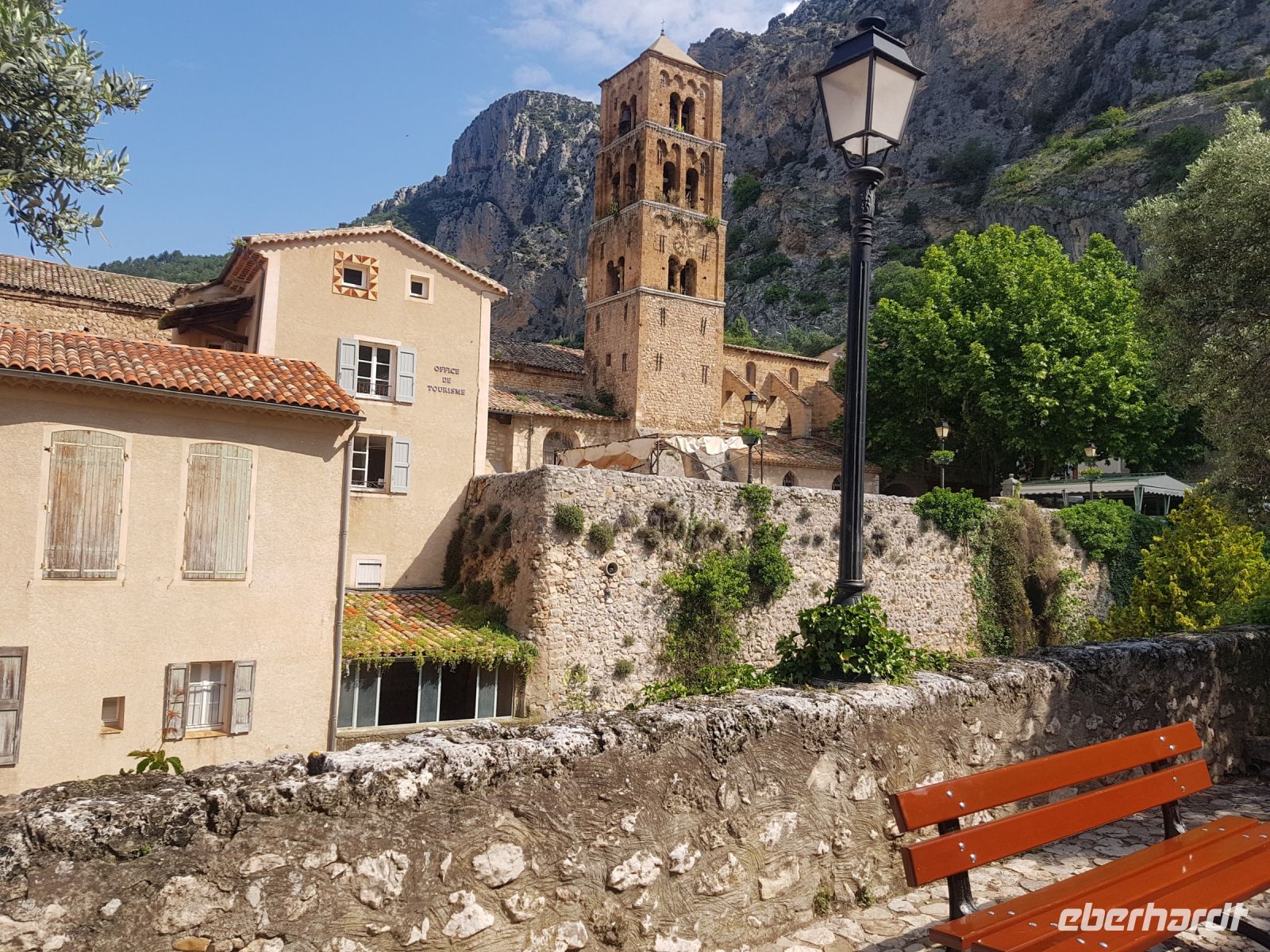Nachdem wir vorläufig zum letzten Mal die Koffer in den Bus geladen hatten, ging es zunächst nach Moustiers-Sainte-Marie. Das malerische Dörfchen schmiegt sich, wie Sisteron, an einen Felsen. Inmitten der Berge gelegen hat es jedoch einen völlig anderen Charakter. Mit ihm beginnt die großartige Schluchtenlandschaft des Grand Canyon du Verdon, die wir in der nun folgenden Panoramafahrt mit unserem Reisebus kennen lernten.