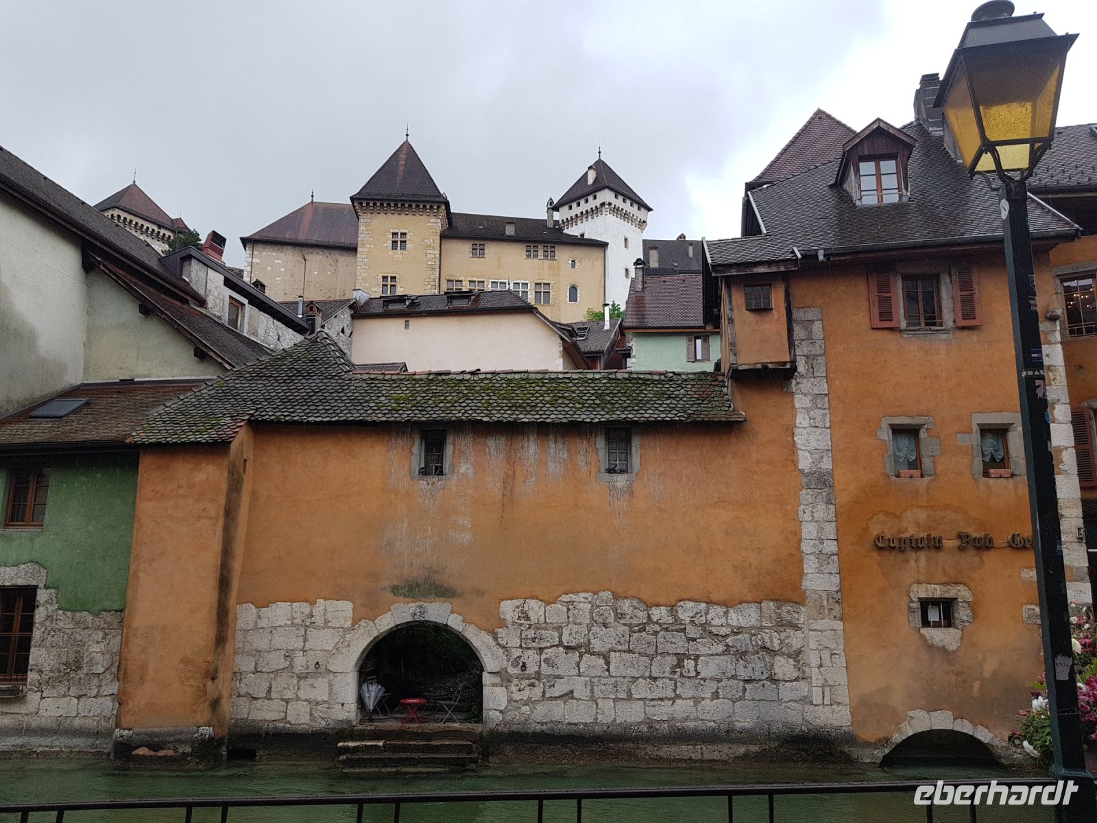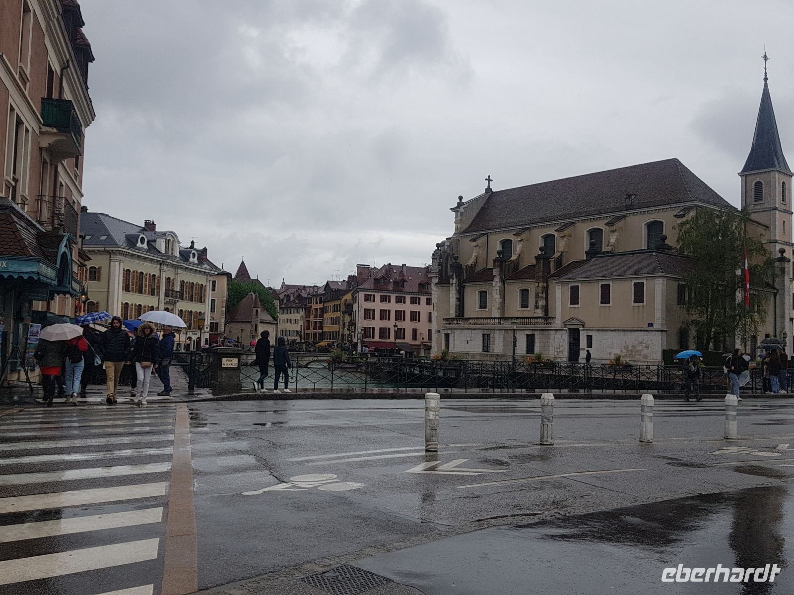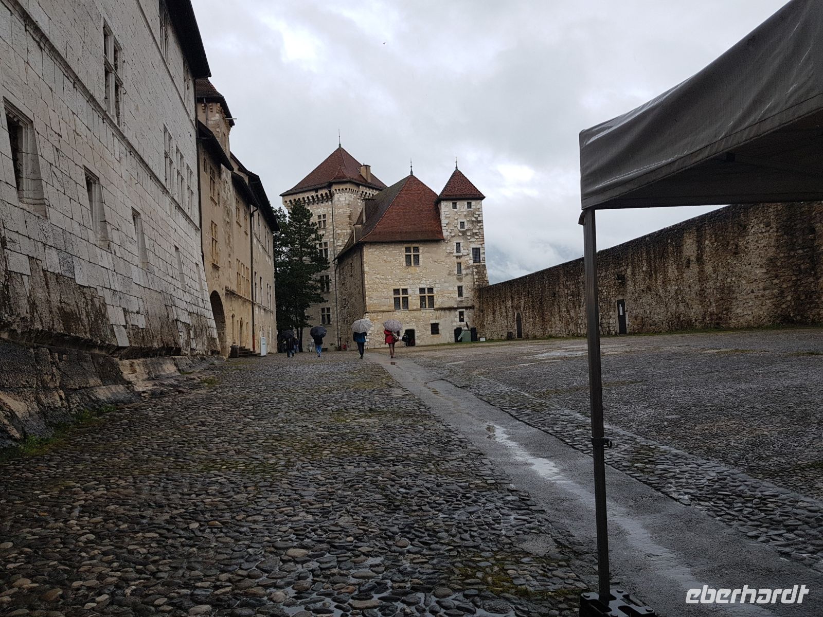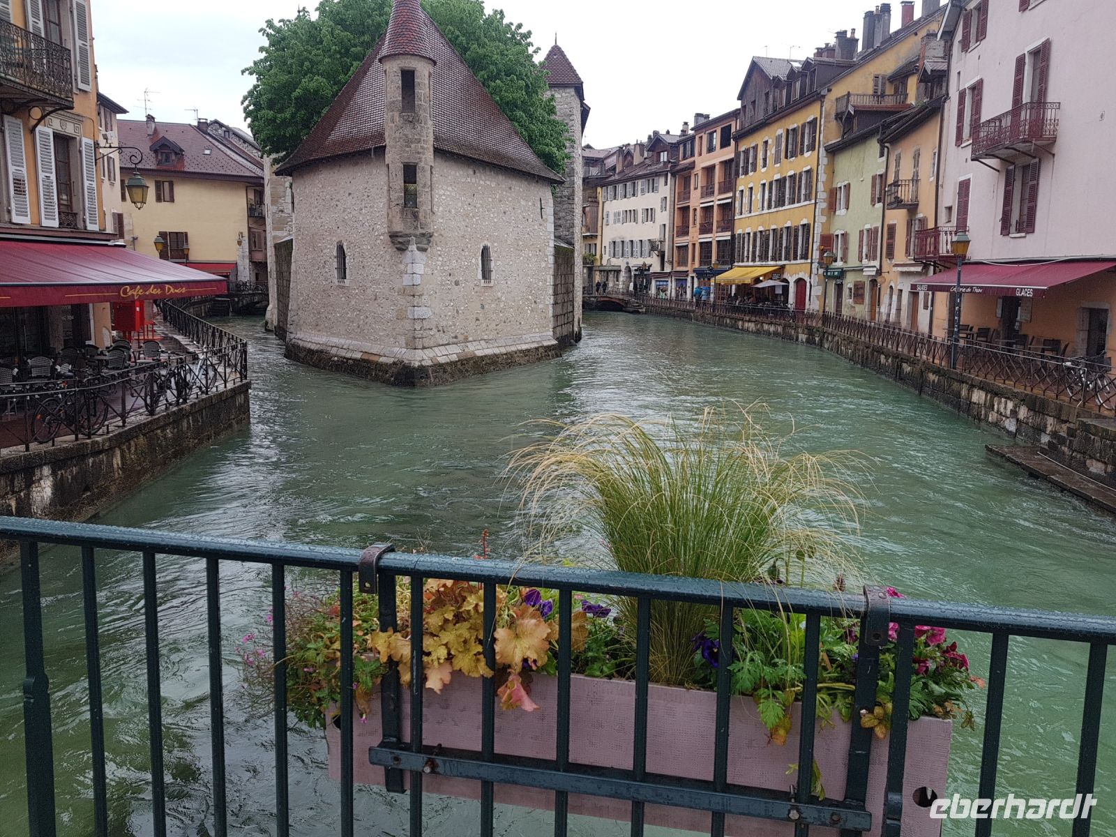 Früh am Morgen nach dem Frühstück standen für uns zunächst die Sehenswürdigkeiten Martignys auf dem Programm. Wir hörten vor dem Museum Baryland von der Jahrhunderte alten Tradition der Mönche am Großen Sankt Bernhard, Bernhardiner-Hunde zum Aufspüren verirrter Pilgern zu halten. Dann sahen das antike Amphitheater und sowie die Ausgrabungen römischer Funde am Kunstmuseum Martignys. Anschließend fuhren wir zum Bahnhof, wo wir später in den Zug nach Chamonix einstiegen. Die Aussichten für unseren Aufenthalt in Chamonix waren schon seit Tagen leider sehr schlecht. Und so war die Fernsicht von dicken Wolken verdeckt. Nur in der Nähe konnten wir während der Fahrt markante Felsen oder einige Wasserfälle sehen. In Chamonix hatte der Regen zunächst nachgelassen und so unternahmen wir einen gemeinsamen Rundgang, der uns durch den berühmtesten Wintersportortes Frankreichs zum Rathaus, wo gerade das 100jährig Jubiläum der 1. Olympischen Winterspiel 1924 gefeiert wurde, und zur Dorfkirche führen sollte. Die tief hängenden Wolken ließen auch hier keinen Blick auf die umgebende Bergwelt zu. Dann setzte ein starker Regen ein, so dass wir uns für die Regenvariante anstelle der entfallenen Ausflüge in Chamonix entschieden und die einstige Savoyardische Residenzstadt Annecy ansteuerten. Das in den Savoyer Alpen am Lac de Annecy gelegene Annecy bietet eine wunderschöne Altstadt, die sich an dem Flüsschen Thiou entlang zieht. Den malerischen Auftakt für den Besuch der Altstadt bietet das „Palais de L'Isle“, ein mittelalterliches Gefängnis und heutiges Museum, das mitten in dem Flüsschen Thiou steht. Stimmungsvolle Gassen, gemütliche Kaffees, spannende, kleine Läden boten unterhalb der mittelalterlichen Burg Château d'Annecy viel zu entdecken, wobei wir den Regen fast vergessen konnten. Anschließend ging es nach Echirolles, einen Vorort von Grenoble, wo wir nach unseren Abendessen die heutige Nacht verbrachten.