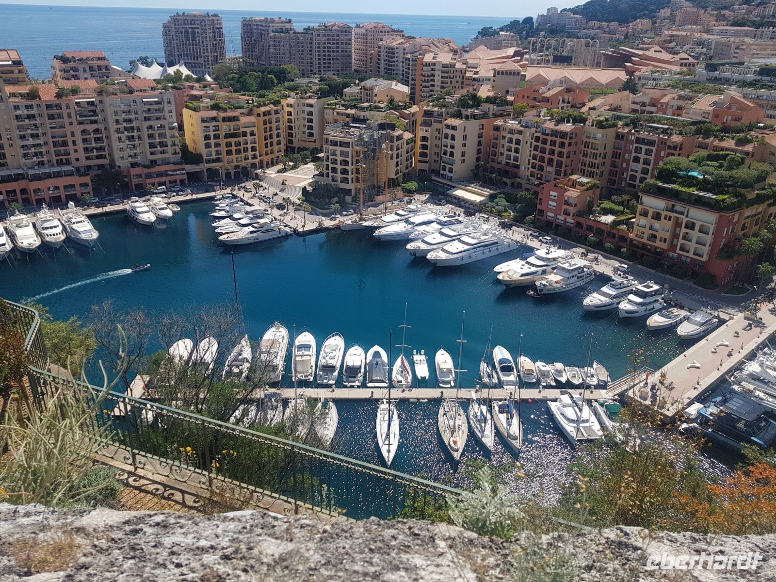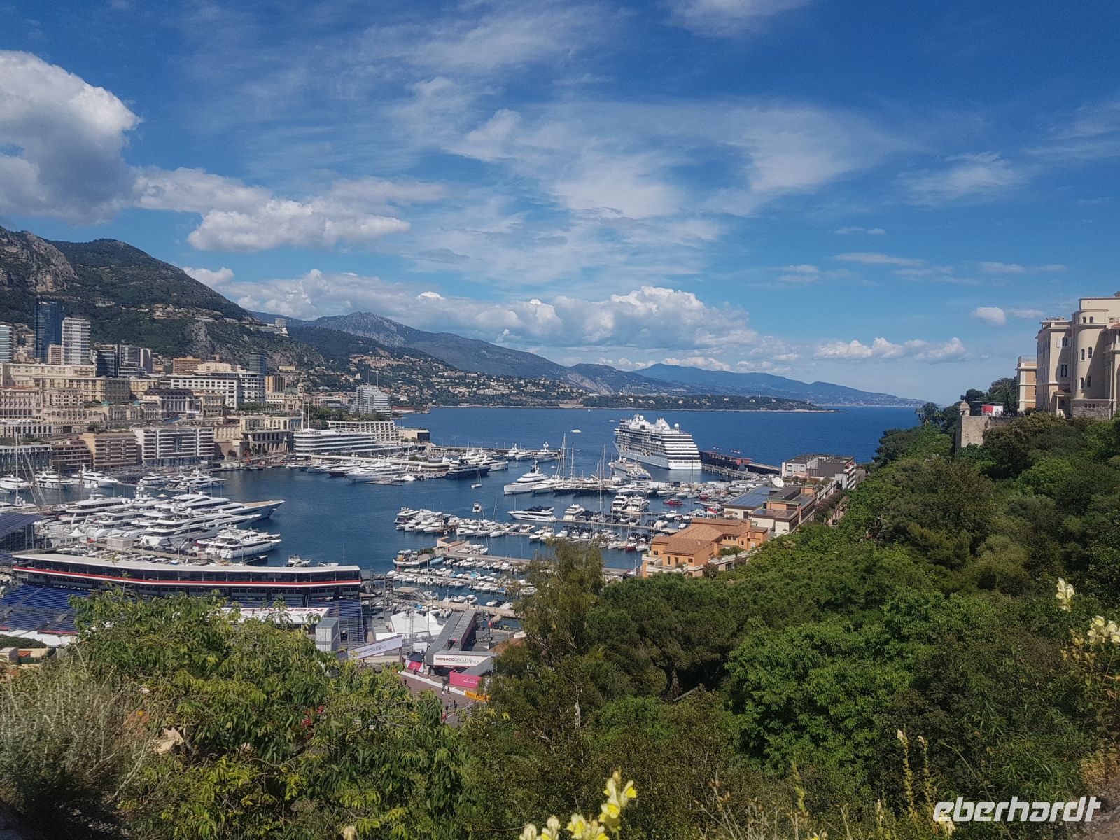 Nach der anschließenden Mittagspause trafen wir uns wieder und fuhren zusammen mit unserer örtlichen Reiseleiterin auf der mittleren Straße hoch über der Mittelmeerküste nach Monaco. Dort angekommen, hörten wir, dass wir aufgrund der Vorbereitungen für das nächste Formel I Rennen mit unserem Bus zum Stadion Fontvieille fahren und von dort mit den Shuttle zur Altstadt auf dem Burgberg fahren sollen. Statt mit unserem Bus waren wir in den nächsten Stunden mit diversen Shuttles unterwegs, die uns vom Burgberg mit der Altstadt nach Monte Carlo und später wieder nach Fontvieille bringen sollten. Auf dem Burgberg standen wir zuerst vor dem berühmten Ozeanographischen Museum, besuchten dann die Kathedrale und kamen schließlich zum Platz mit dem Schloss der Fürsten von Monaco. Dabei hörten wir von Geneviève viel Spannendes über die Geschichte des Fürstenhauses und die aktuelle Fürstenfamilie.