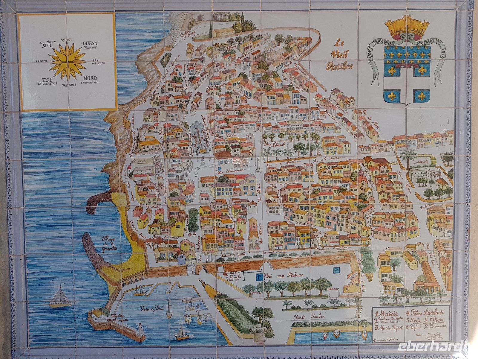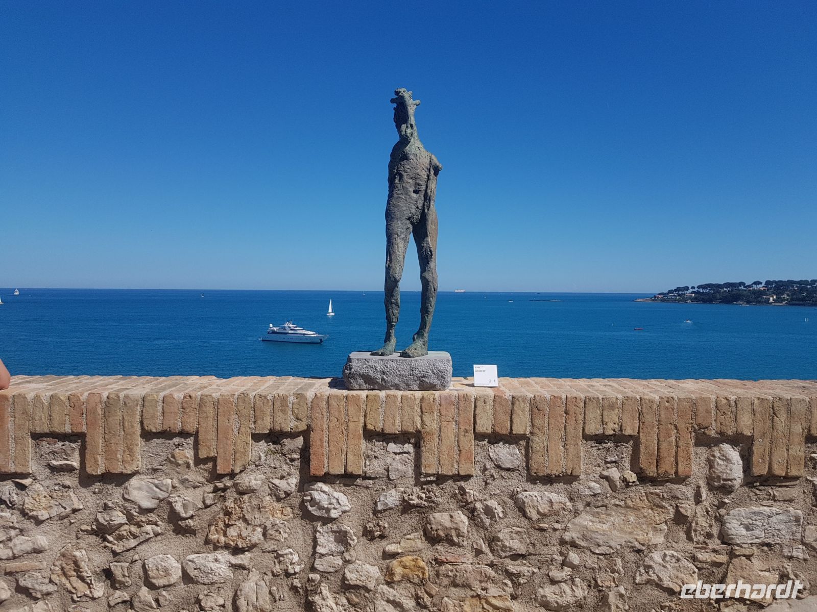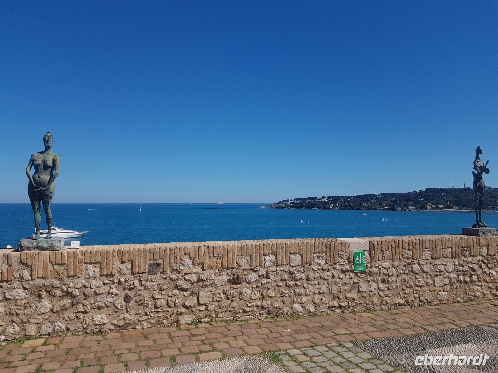 Dann ging es hinunter zum Rathaus von Cannes, wo einige aus unserer Gruppe im Schatten der Platanen auf uns gewartet hatten. Gemeinsam gingen wir nun zum Festivalpalais. Hier wurde gerade fieberhaft an der Vorbereitung der Internationalen Filmfestspiele, die vier Tage später beginnen sollten, gearbeitet. Der alte rote Teppich auf der berühmten Freitreppe war schon weggeräumt, um einem neuen für die in Kürze erwarteten Stars Platz zu machen. Nach einer Pause für eigene Erkundungen trafen wir uns wieder am Bus, um nach Antibes zu fahren. Die alte Hafenstadt erwartete uns mit südlicher Gelassenheit. Vom Busausstieg spazierten wir am Jachthafen entlang zur Altstadt. Über dem Hafen thront würdevolle die alte Vauban-Festung, die hier einst die Grenze des Königreichs Frankreich gegen das Savoyardische Nizza schützte. Am Provencialischen Markt, der schon nahezu abgeräumt war, verabredeten wir uns zu einem späteren Zeitpunkt, um gemeinsam zum Picasso-Museum zu gehen. In der Zwischenzeit tauchten wir ein in die provencialische Atmospäre dieser alten Hafenstadt am Mittelmeer ein und erfrischten uns mit einem Eis oder einem Mittagsimbiss. Dann besuchten wir das Picasso-Museum, in dem vor allem die Werke ausgestellt waren, die Pablo Picasso während der Zeit, in der er im Obergeschoss des alten Grimaldi-Schlosses wohnte und arbeite, entstanden sind.