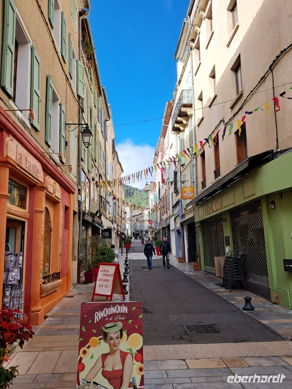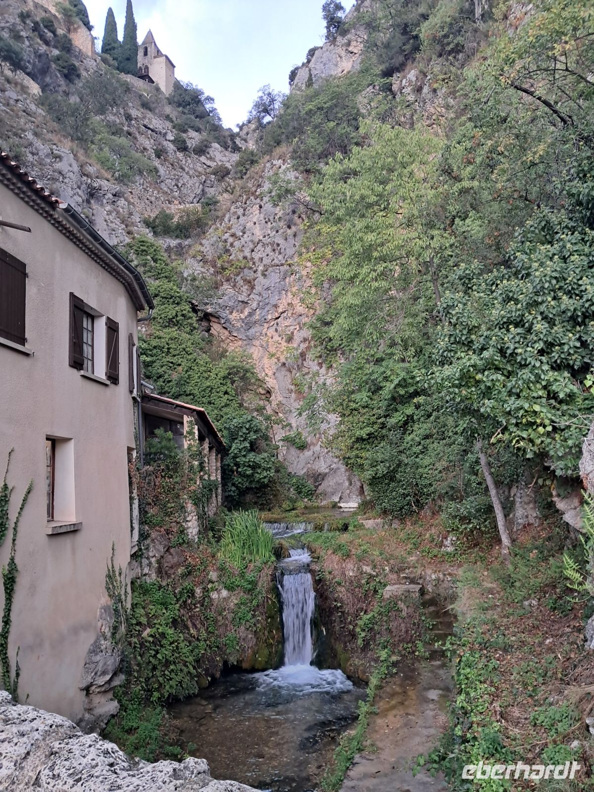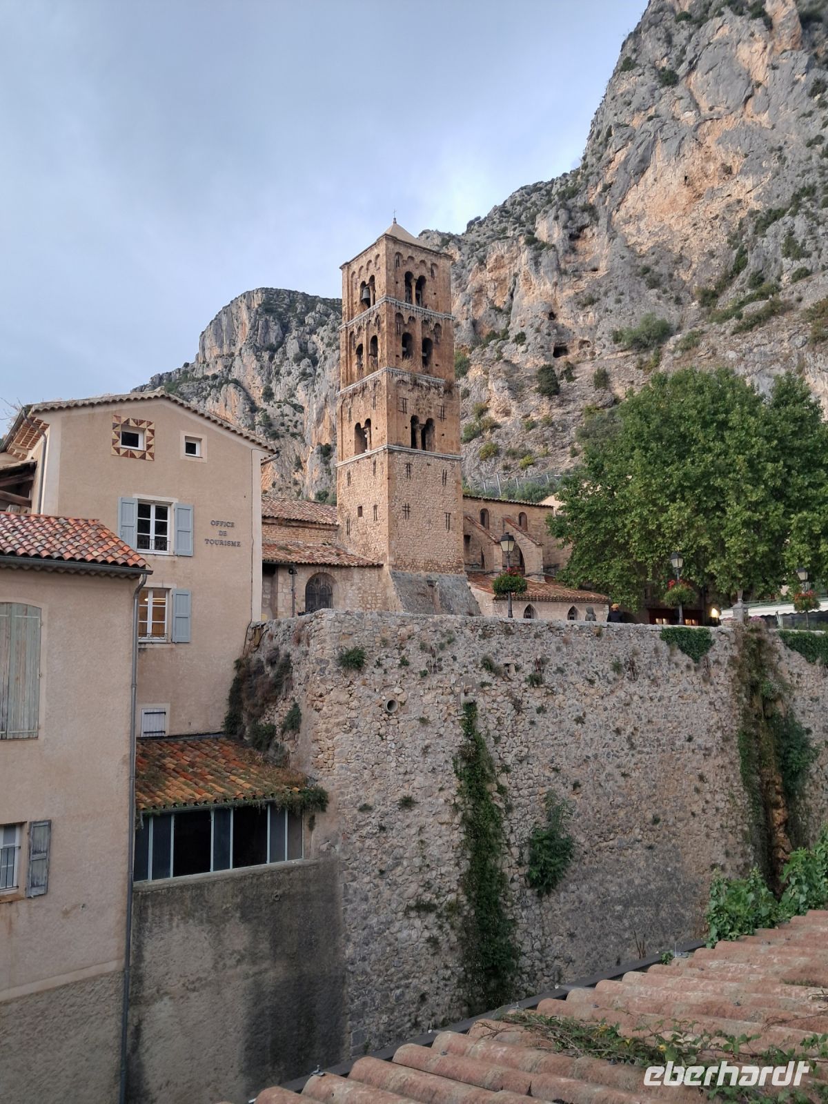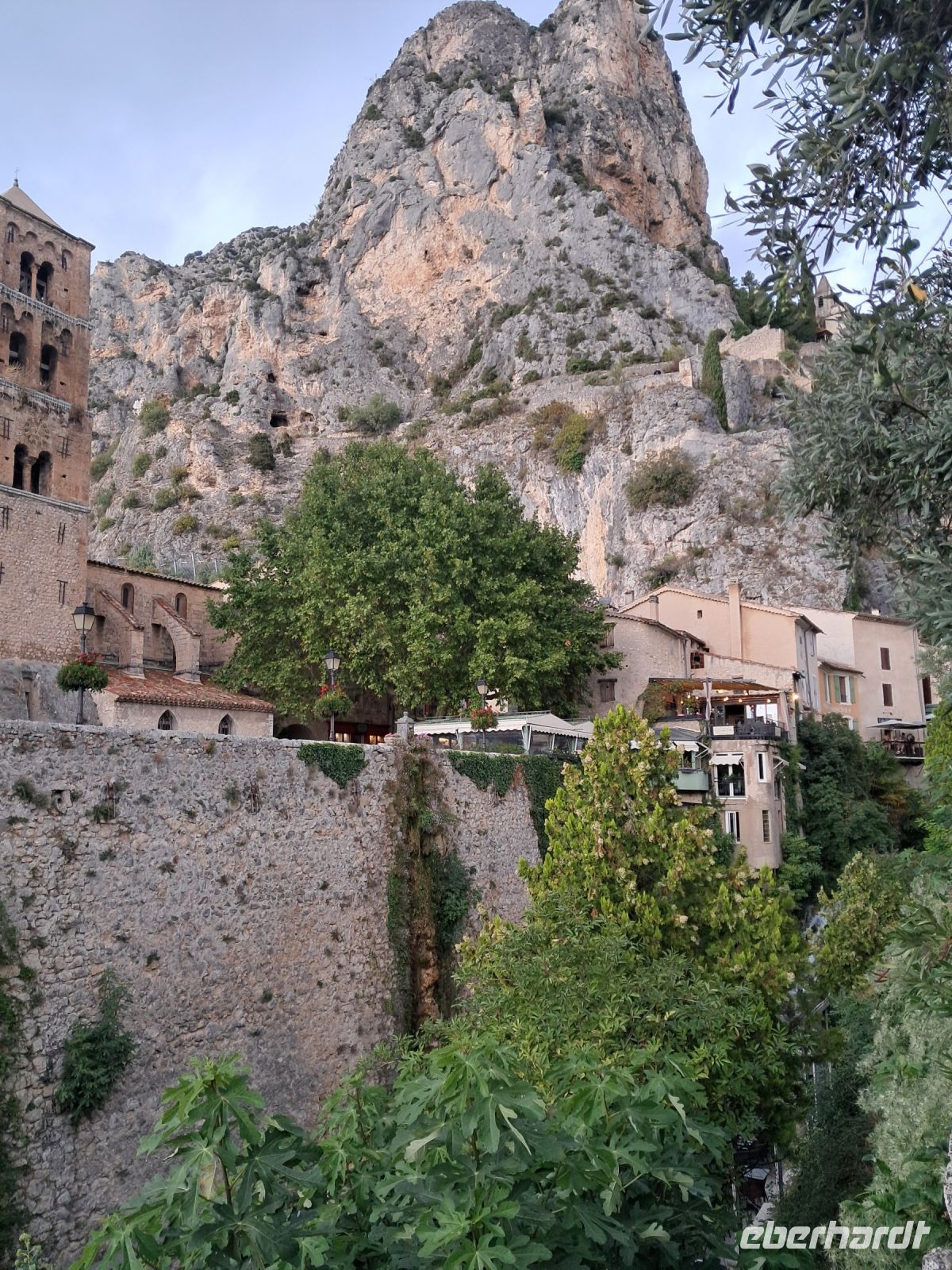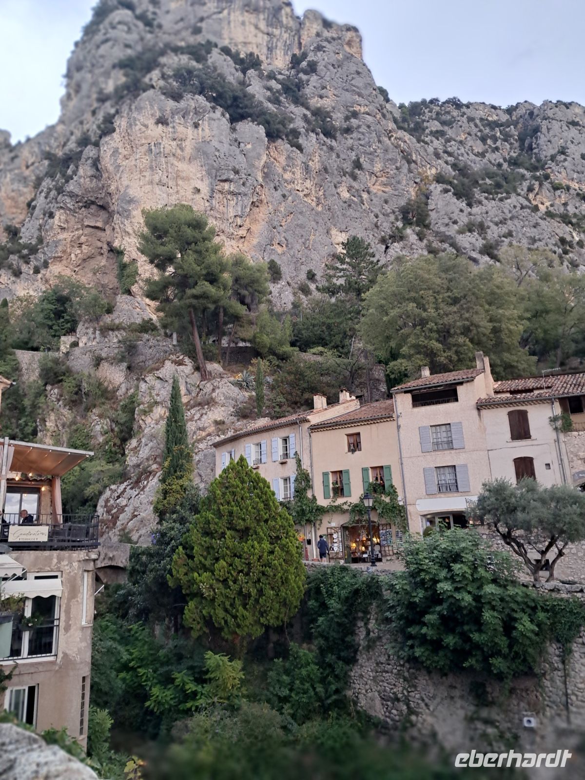 Wir erreichen Moustiers Sainte Marie. Ein historischer Wallfahrtsort mit seiner kleinen, über steile Stufen zu erreichenden Kapelle Notre-Dame-de-Beauvoir, der größeren Pfarrkirche Notre Dame zur Auferstehung und seinem Fayence-Museum. Nicht zu vergessen die wunderschönen Gassen und ein Dorf, wie eine Bienenwabe am Berg hängend, nicht ohne Grund eines der schönsten Dörfer Frankreichs. Das Wetter spielt eher in Moll und so ziehen einige der Reisegruppe den Espresso an der Theke, den Roséwein im Restaurant oder den Croque-Madame am überdachten Imbiss dem ausgedehnten Bummel bei Regen vor. Immerhin kommen wir alle aber wieder trocken zum Bus.