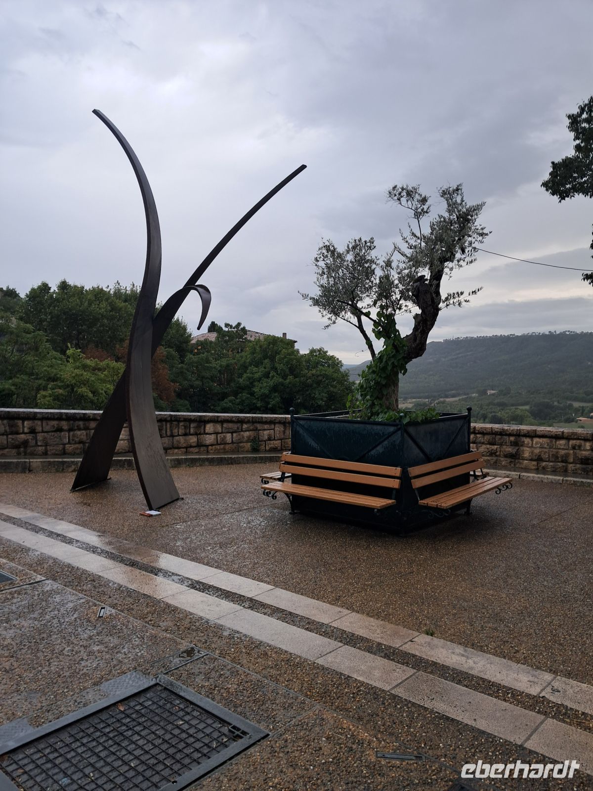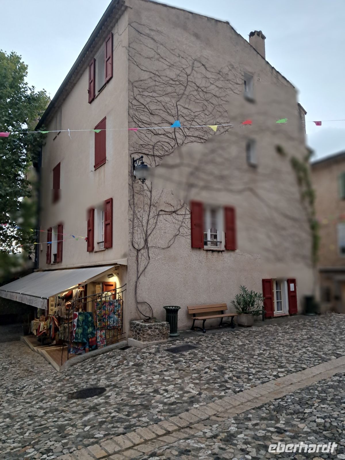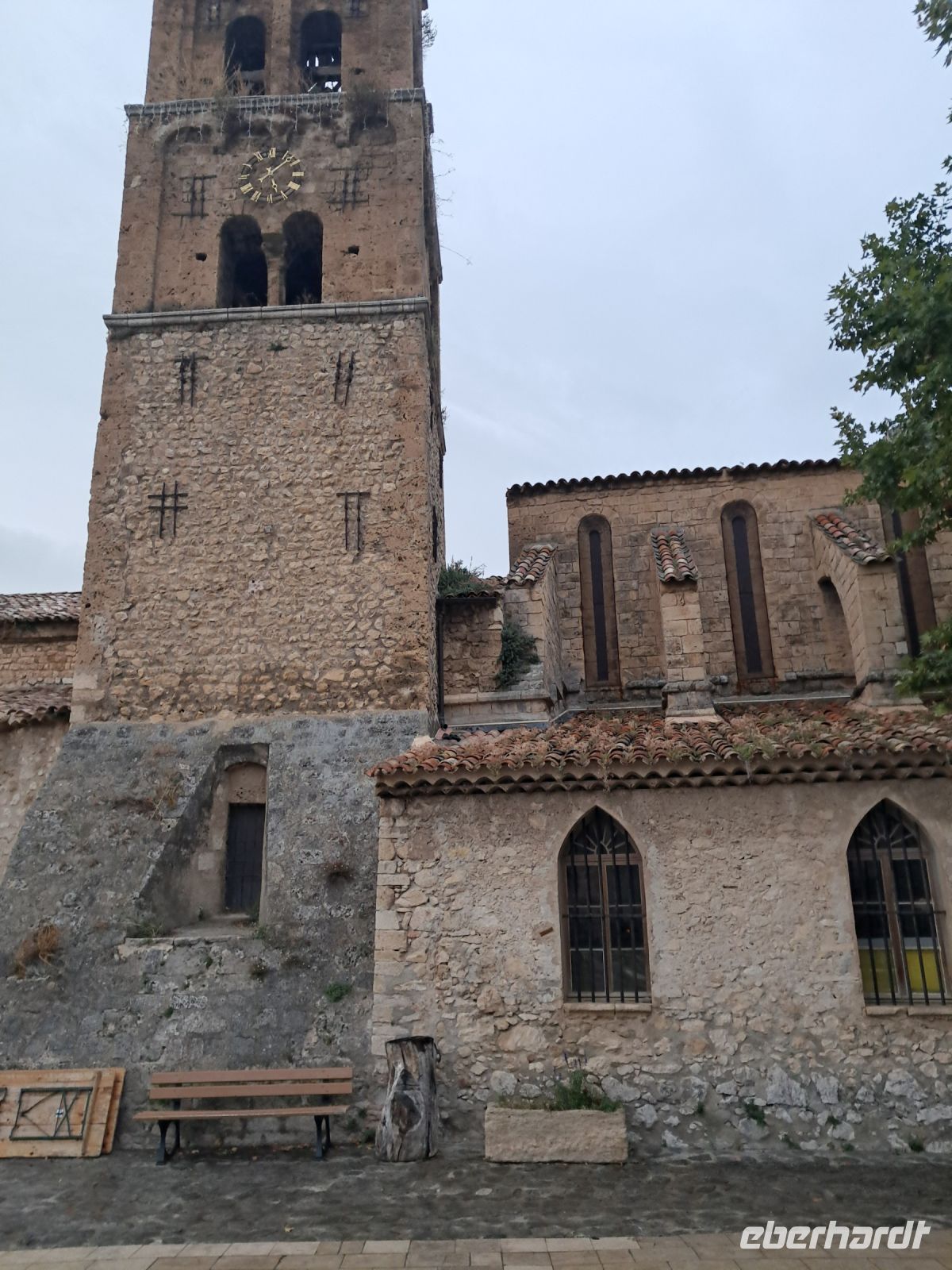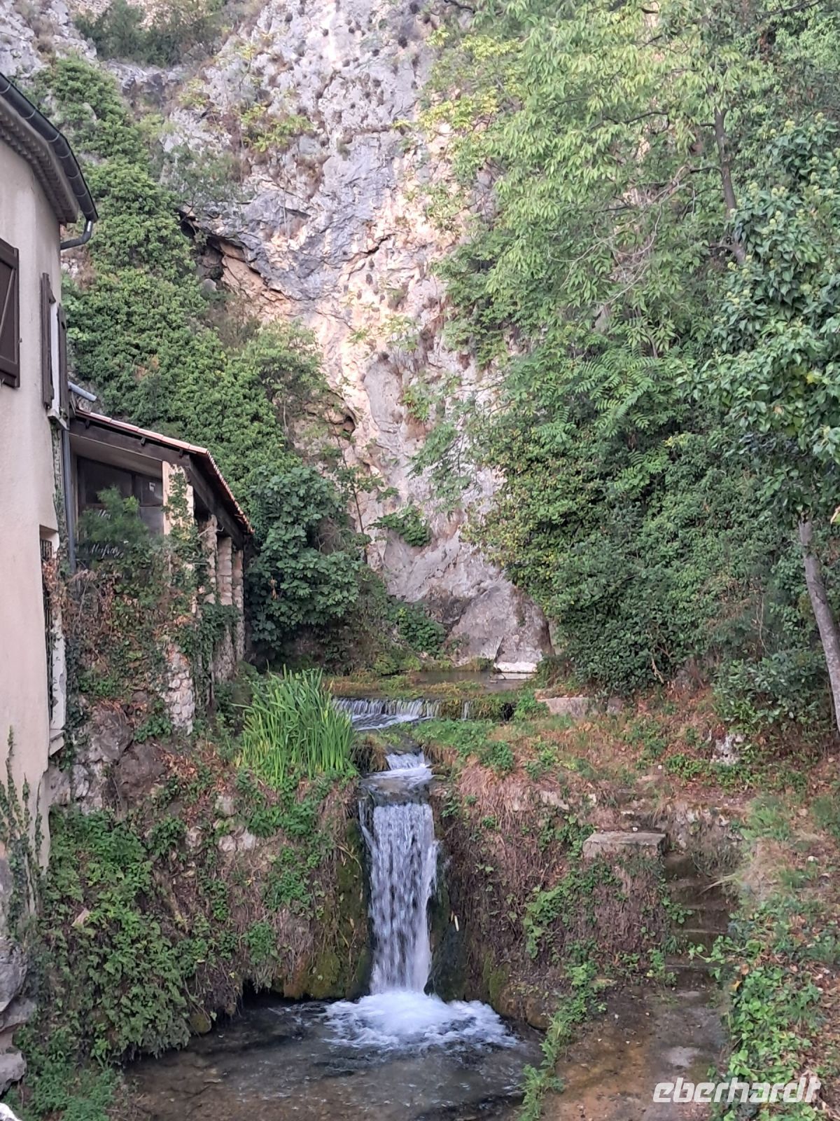 Wir erreichen Moustiers Sainte Marie. Ein historischer Wallfahrtsort mit seiner kleinen, über steile Stufen zu erreichenden Kapelle Notre-Dame-de-Beauvoir, der größeren Pfarrkirche Notre Dame zur Auferstehung und seinem Fayence-Museum. Nicht zu vergessen die wunderschönen Gassen und ein Dorf, wie eine Bienenwabe am Berg hängend, nicht ohne Grund eines der schönsten Dörfer Frankreichs. Das Wetter spielt eher in Moll und so ziehen einige der Reisegruppe den Espresso an der Theke, den Roséwein im Restaurant oder den Croque-Madame am überdachten Imbiss dem ausgedehnten Bummel bei Regen vor. Immerhin kommen wir alle aber wieder trocken zum Bus.
