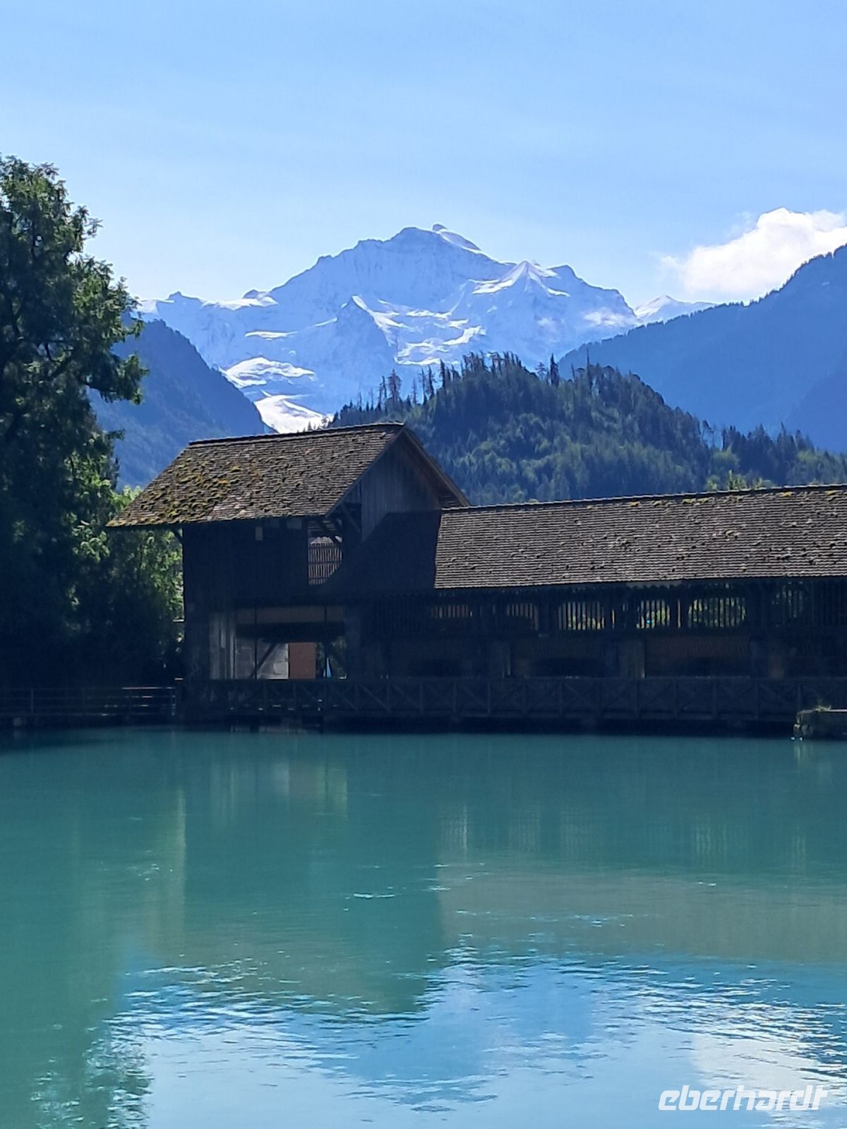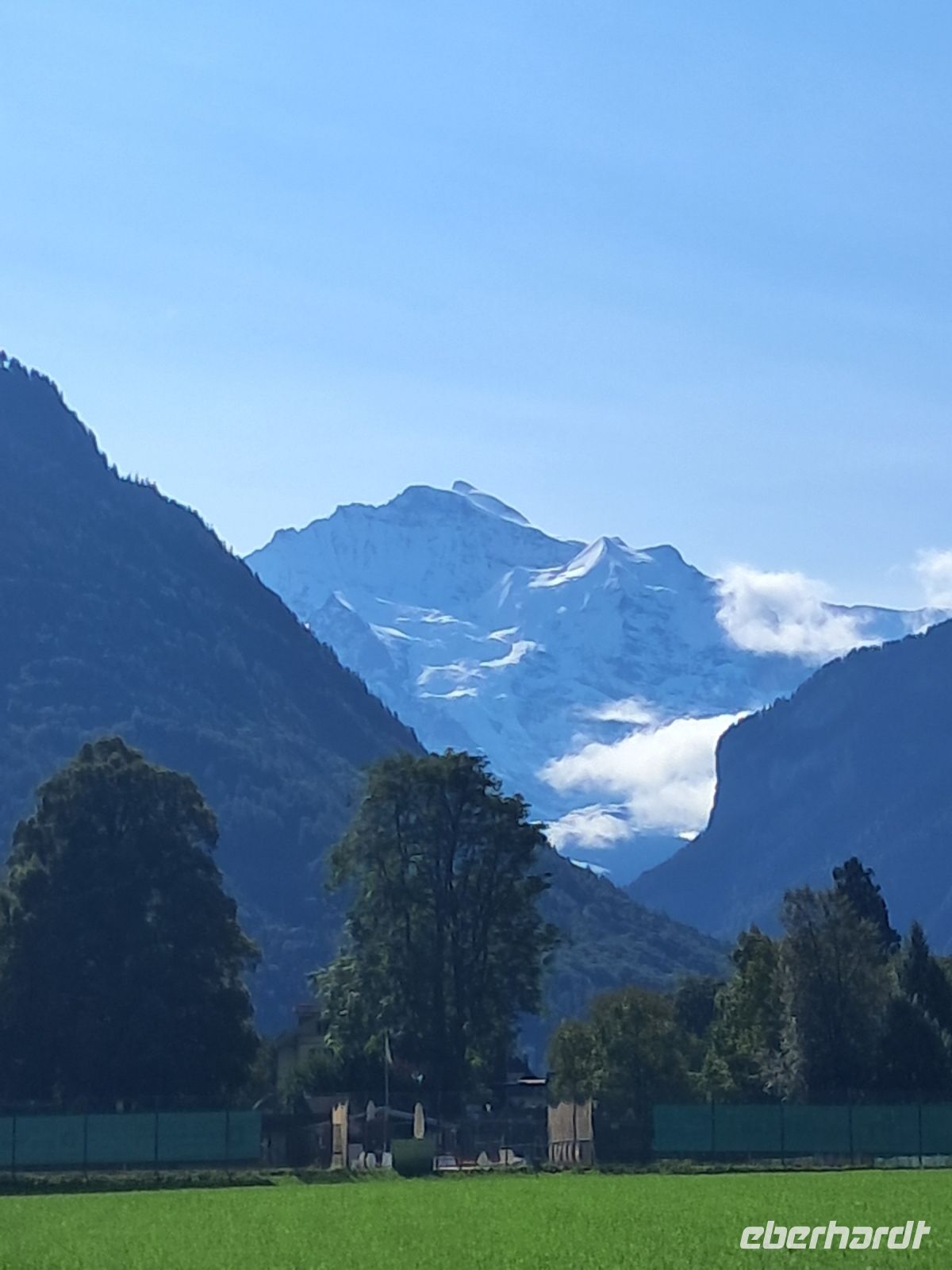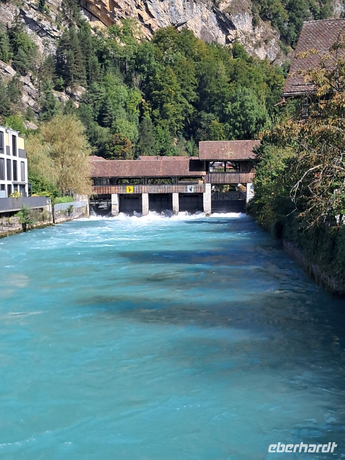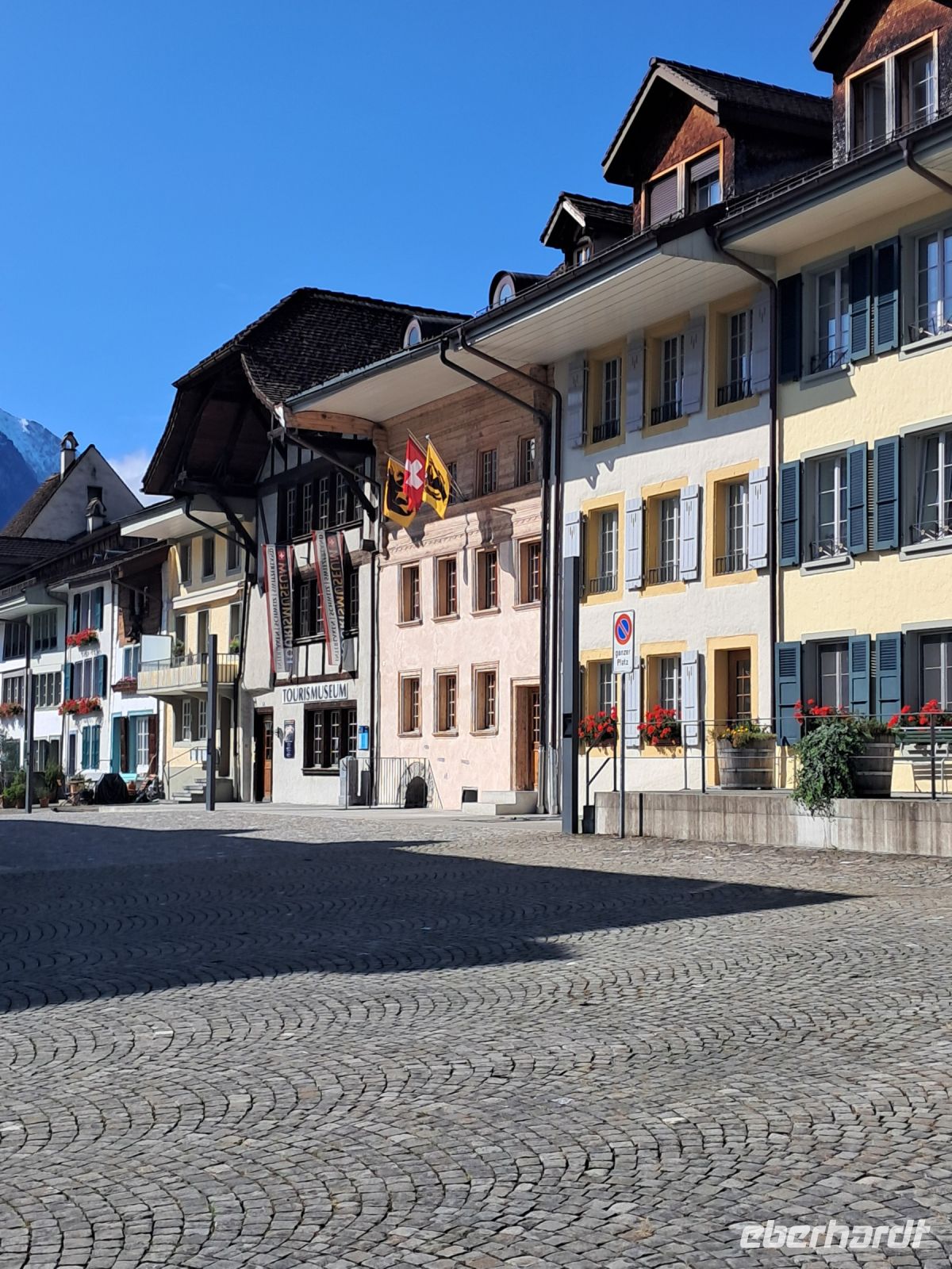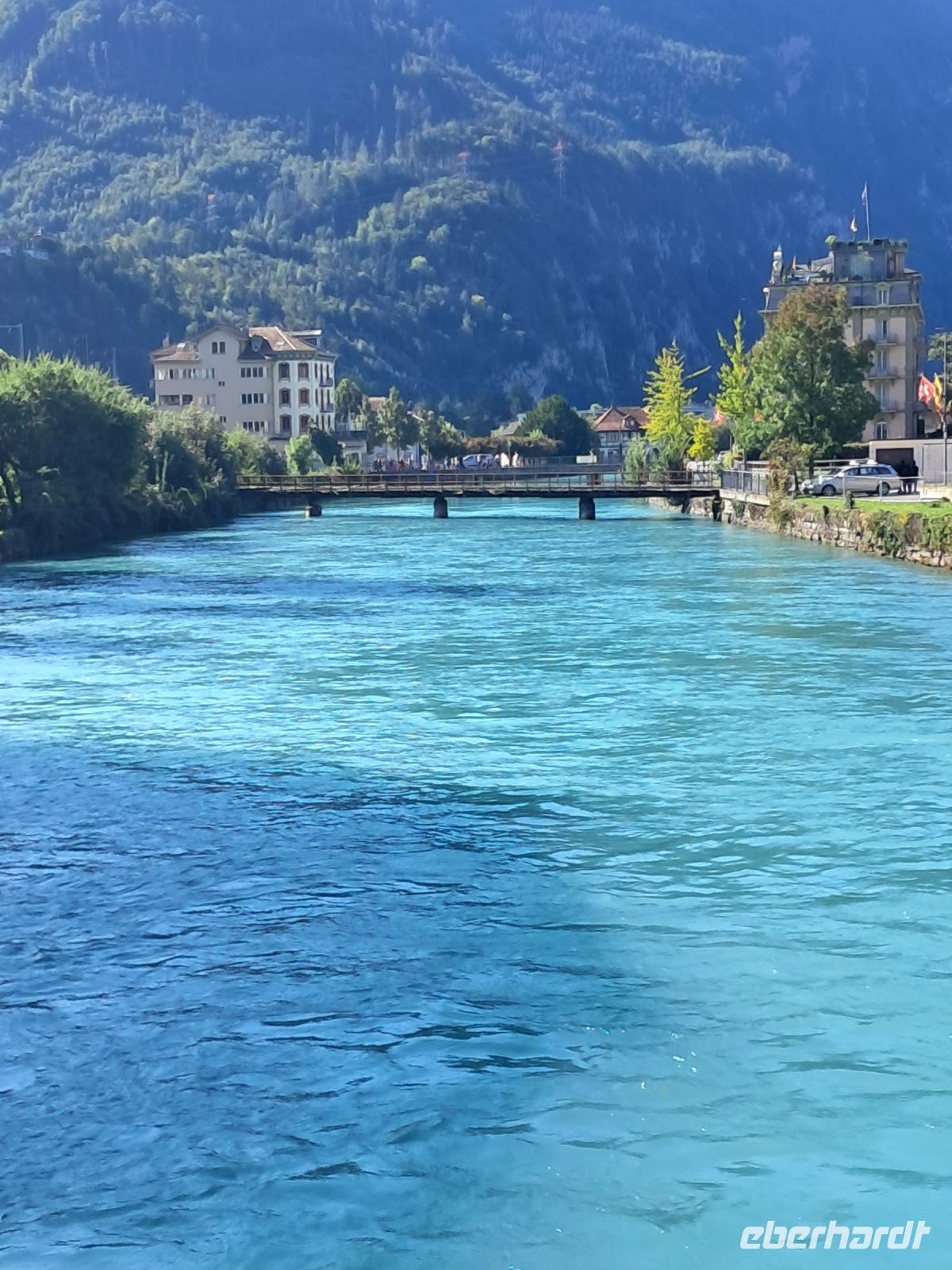 Umso härter ist der Einschnitt nun am zweiten Tag. Wir fahren quer durch die Schweiz und machen Halt in Interlaken. Die Paraglider künden schon von Weitem, dass heute der Blick auf das Jungfraumassif frei sein muss. Im Minutentakt landen sie einzeln oder als Tandem ganz in der Nähe unseres Parkplatzes. Jetzt ist ein wenig Bewegung angesagt. Der Spaziergang geht vorbei an Luxusgeschäften und Hotels der höchsten Kategorie bis ins historische Zentrum von Interlaken. Hier fährt die Bahn mitten durch die Stadt, wir überqueren Gleise und den Fluss Aare und genießen den Blick auf das rauschende, glasklare Wasser, das den Augen so wohl tut, dass man die Farbe gar nicht beschreiben oder benennen möchte.