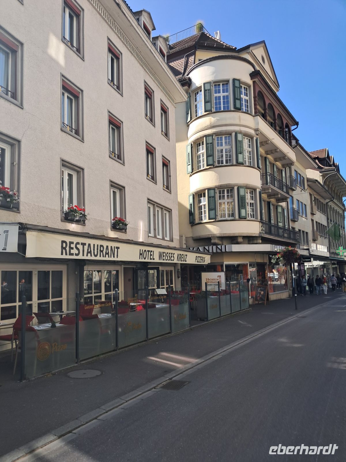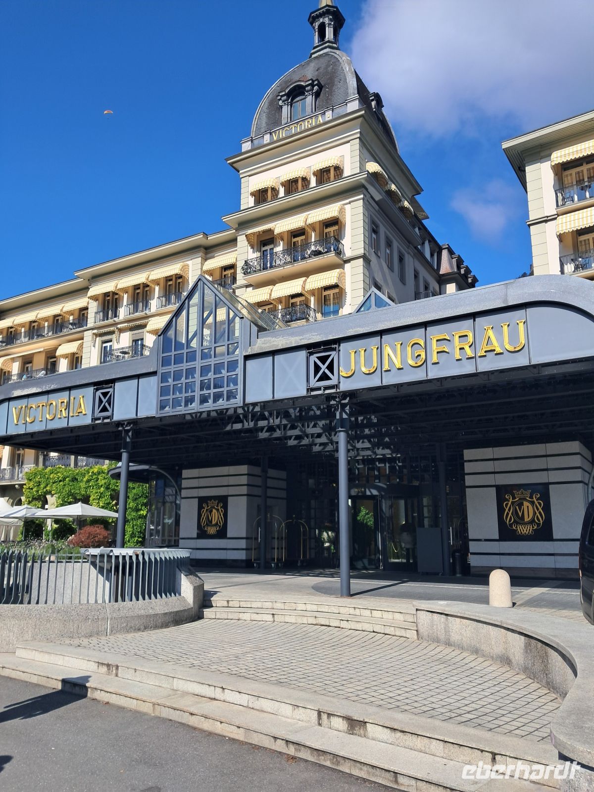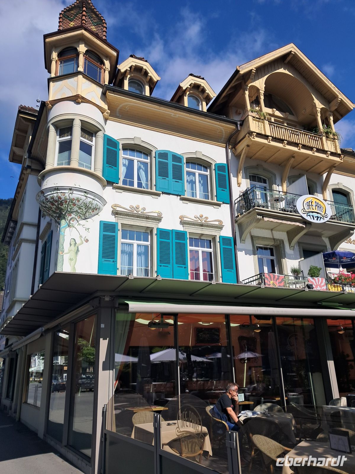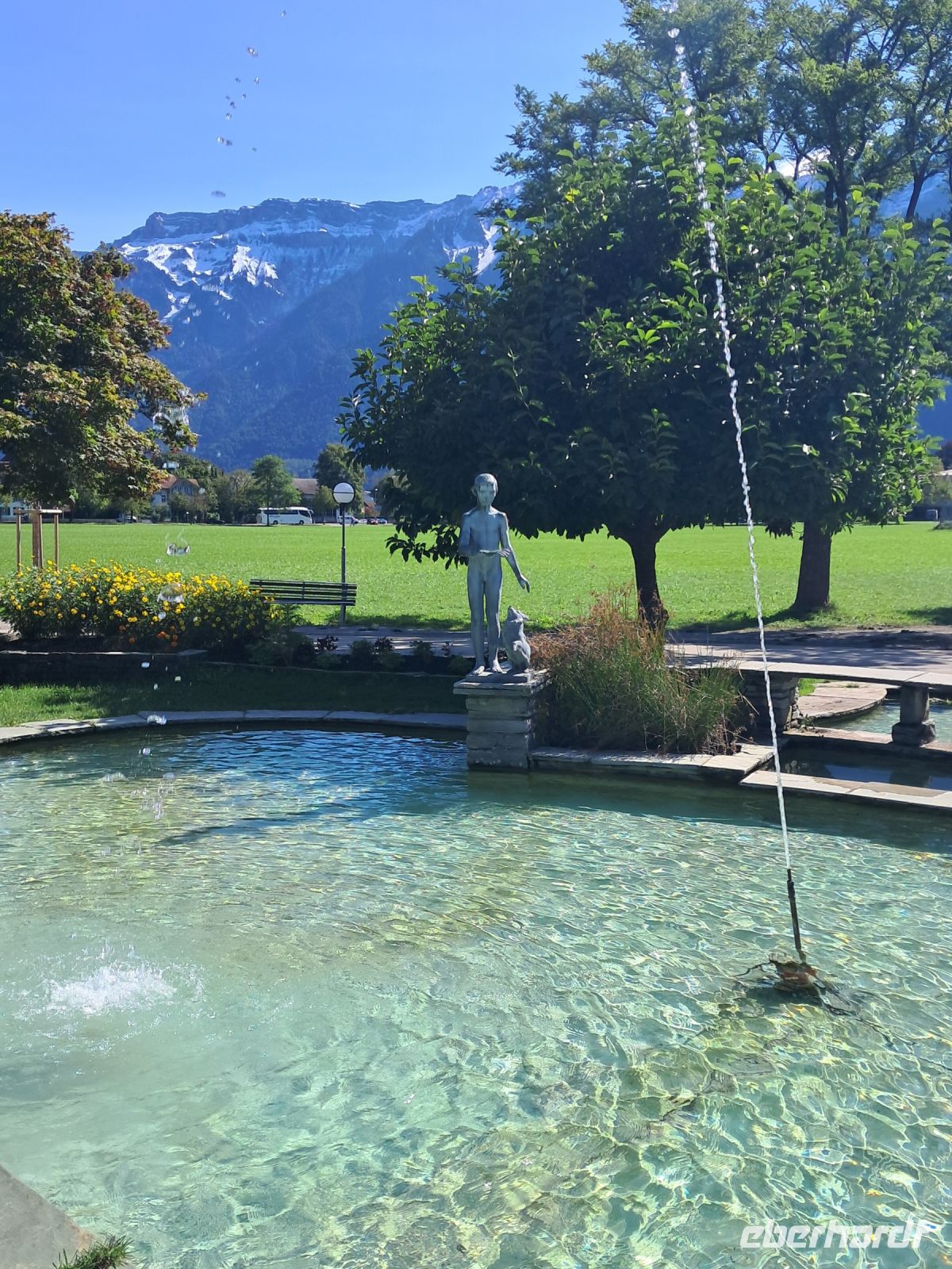 Umso härter ist der Einschnitt nun am zweiten Tag. Wir fahren quer durch die Schweiz und machen Halt in Interlaken. Die Paraglider künden schon von Weitem, dass heute der Blick auf das Jungfraumassif frei sein muss. Im Minutentakt landen sie einzeln oder als Tandem ganz in der Nähe unseres Parkplatzes. Jetzt ist ein wenig Bewegung angesagt. Der Spaziergang geht vorbei an Luxusgeschäften und Hotels der höchsten Kategorie bis ins historische Zentrum von Interlaken. Hier fährt die Bahn mitten durch die Stadt, wir überqueren Gleise und den Fluss Aare und genießen den Blick auf das rauschende, glasklare Wasser, das den Augen so wohl tut, dass man die Farbe gar nicht beschreiben oder benennen möchte.