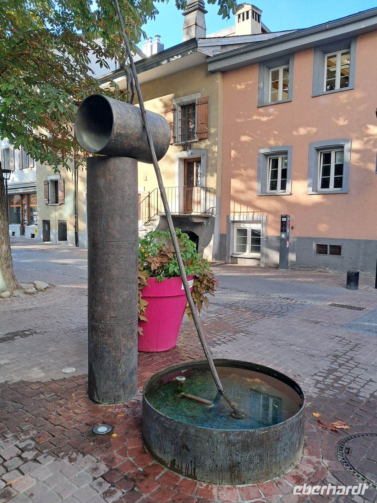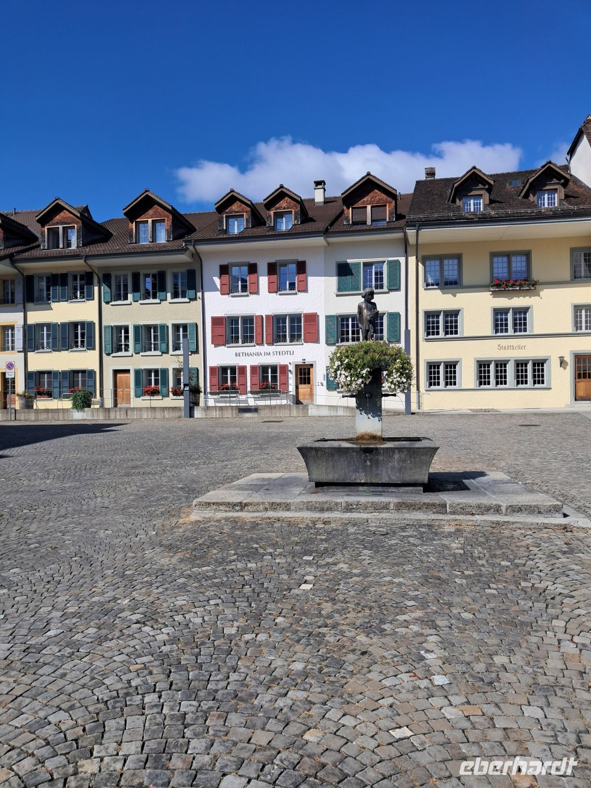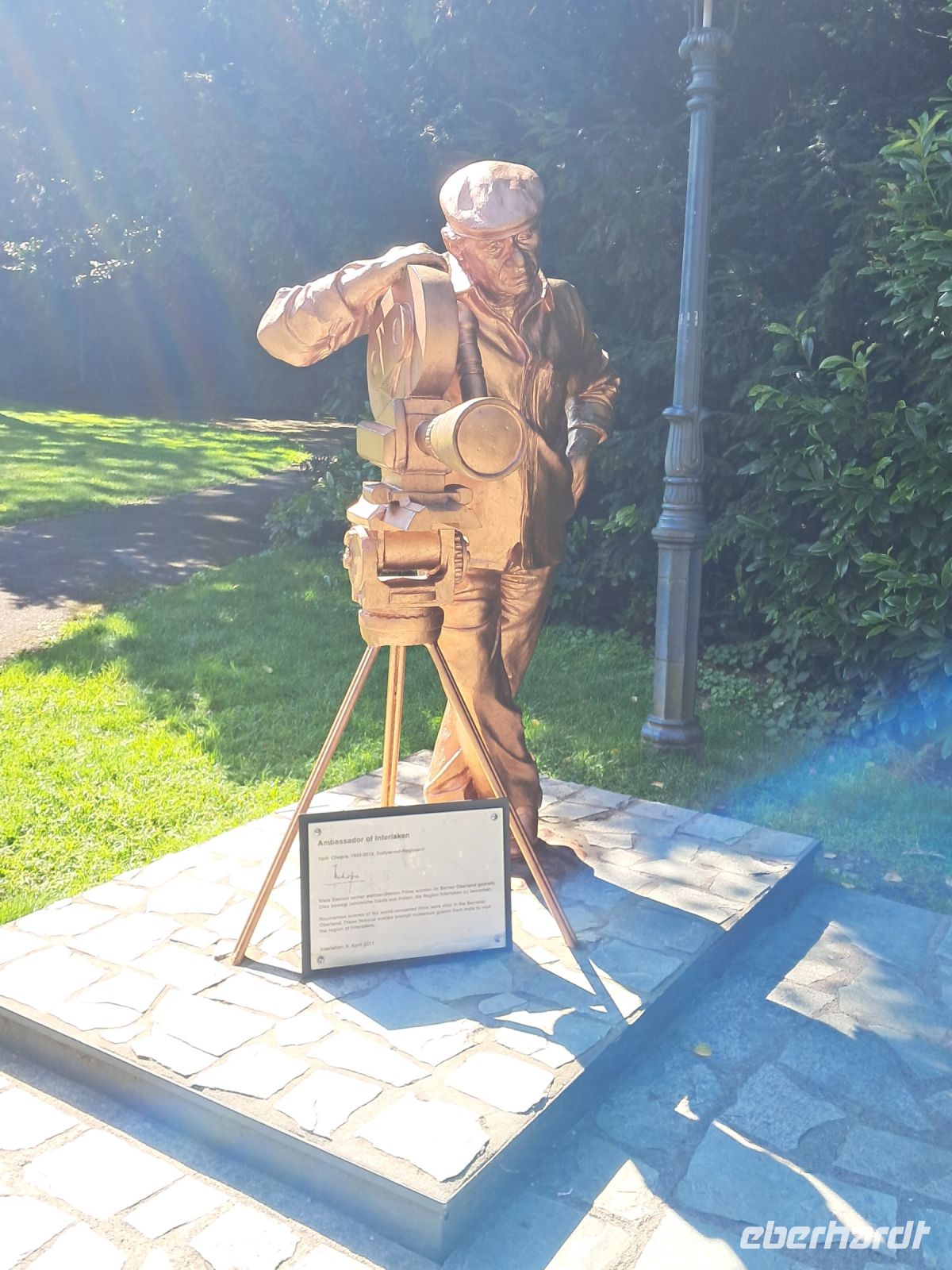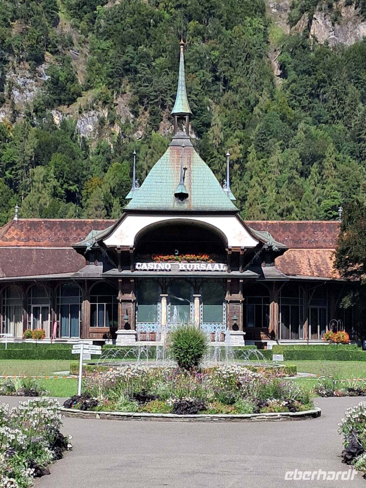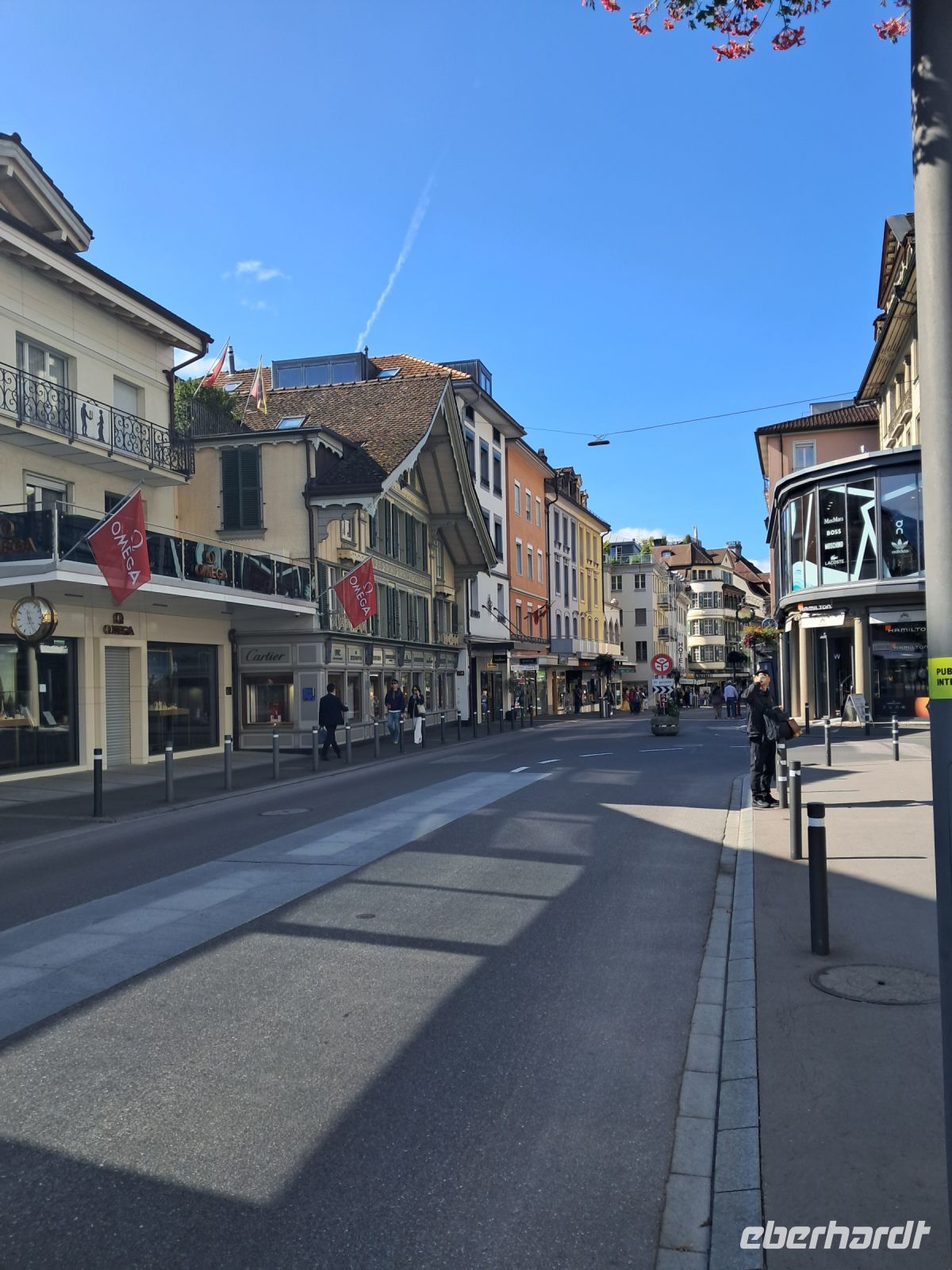 Umso härter ist der Einschnitt nun am zweiten Tag. Wir fahren quer durch die Schweiz und machen Halt in Interlaken. Die Paraglider künden schon von Weitem, dass heute der Blick auf das Jungfraumassif frei sein muss. Im Minutentakt landen sie einzeln oder als Tandem ganz in der Nähe unseres Parkplatzes. Jetzt ist ein wenig Bewegung angesagt. Der Spaziergang geht vorbei an Luxusgeschäften und Hotels der höchsten Kategorie bis ins historische Zentrum von Interlaken. Hier fährt die Bahn mitten durch die Stadt, wir überqueren Gleise und den Fluss Aare und genießen den Blick auf das rauschende, glasklare Wasser, das den Augen so wohl tut, dass man die Farbe gar nicht beschreiben oder benennen möchte.