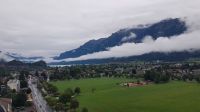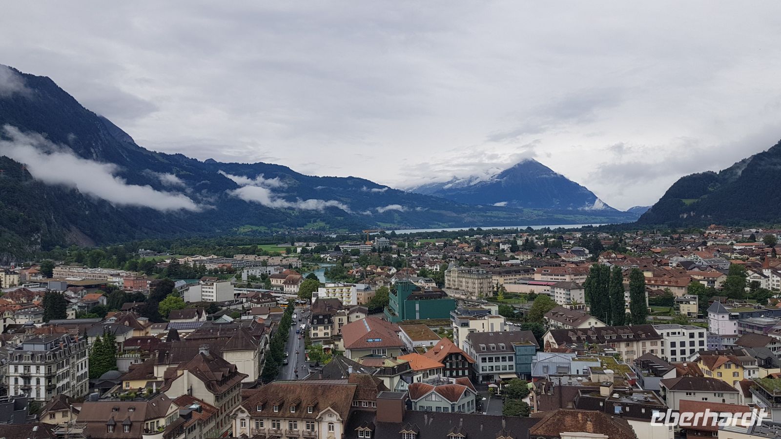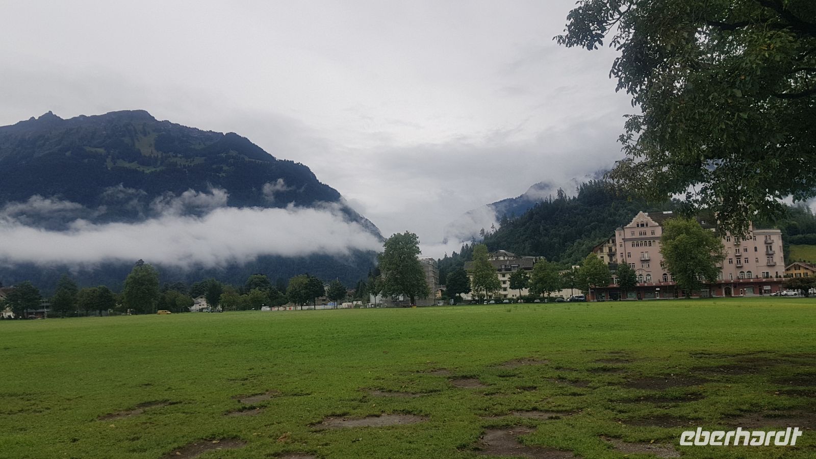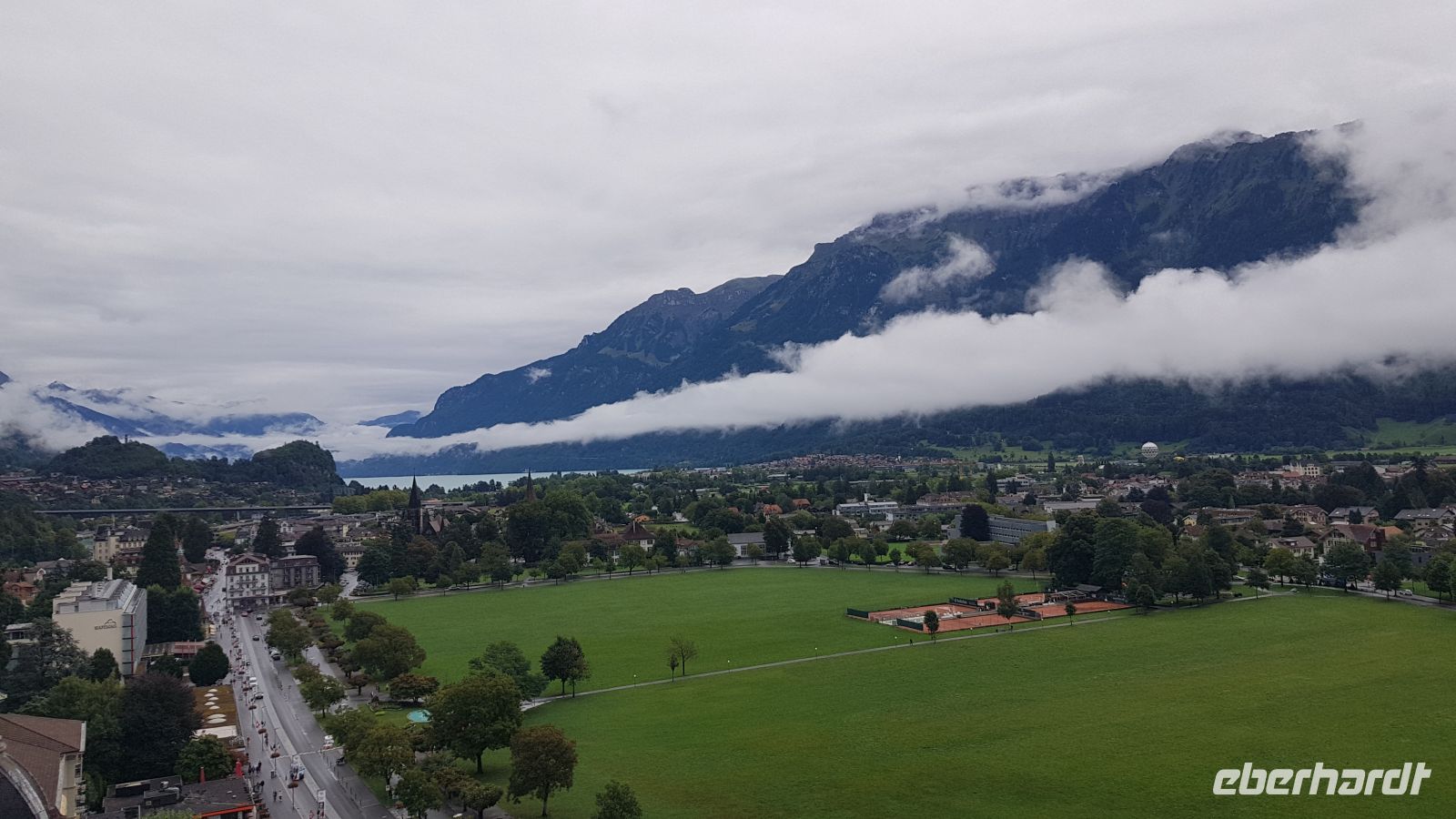 Bei trüben regnerischen Wetter nahmen wir am nächsten Morgen Abschied vom Elsass in der französischen Region Grand Est und fuhren in die Schweiz. An der Metropole Basel vorbei ging es dann zu den Berner Alpen, deren Ansicht vom Thuner See aus einmalig ist. Doch dicke Regenwolken verhüllten jede Sicht. Weder von der Autobahn bei der Anfahrt von Solothurn nach Bern noch von Interlaken am Thuner See aus konnten wir das berühmte Dreigestirn der Berner Alpen Eiger, Mönch und Jungfrau sehen. Als wir in Interlaken ankamen, hatte der Regen zumindest aufgehört und nach einer Weile stellten sich auch die ersten Paragleiter auf der großen Wiese, der Höhenmatte, ein. Diese Wiese wurde von den Einwohner von Interlaken schon im 19. Jahrhundert erworben, um dort jede Bebauung zu vermeiden, die den freien Blick auf das Panorama der Berner Alpen mit dem Gipfel der Jungfrau verhindert hätte.