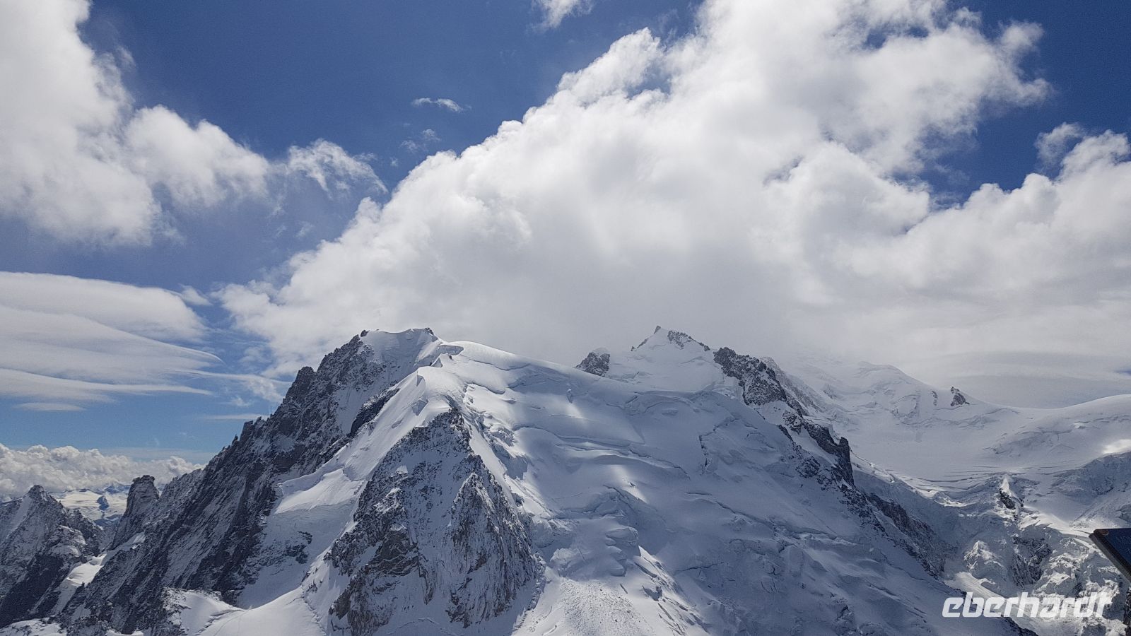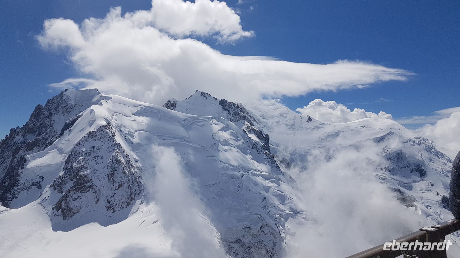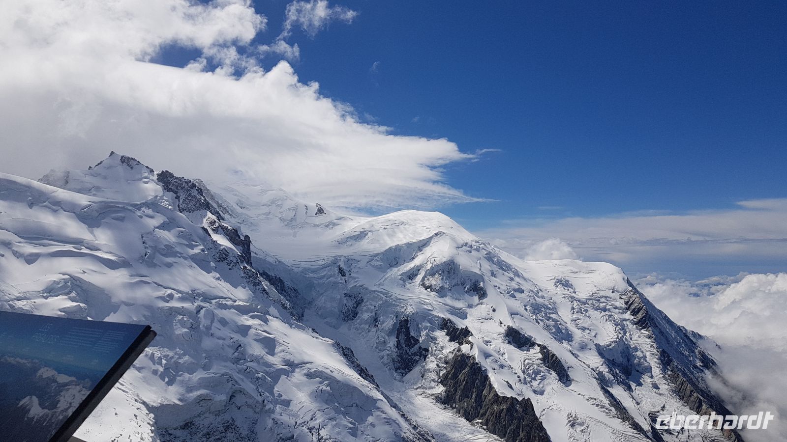 Bei Sonnenschein aber noch leicht bewölkten Himmel trafen wir in Chamonix ein. Während einige Gäste zum Bahnhof Montvers gingen, um den Eismeergletscher zu sehen und andere sich im Ort Chamonix umsahen, entschied sich der größte Teil unserer Gruppe, mit der Seilbahn auf die Aiguille du Midi zu fahren. In den letzten Stunden und Minuten waren die Aussichten, den Mont Blanc zu sehen gestiegen und so stellten wir uns an der Seilbahn an. Mit zwei Seilbahnen und einem Fahrstuhl ging es dann in schneller Fahrt gut 1000 m hinauf. Oben auf der Aussichtsplattform erwartete uns ein überwältigendes, geradezu berauschendes Alpenpanorama. Schnee und Eis hüllte die teils von der Sonne beschienen, teils von Wolken umspielten Gipfel ein. Der Gipfel des Mont Blanc blieb zwar hinter einer Wolke versteckt, aber es war viel schöner als wir je zu hoffen gewagt hatten. Wir versuchten mit unseren Fotos einiges von dieser großartigen Landschaft, die man bestenfalls für einige Sekunden nur aus dem Flugzeug sieht, einzufangen und verweilten erfüllt von unvergesslichen Eindrücken. Dann ging es herunter zum Bus, mit dem wir später durch die französischen Hochalpen von Savoyen in die Dauphiné nach Grenoble fuhren.