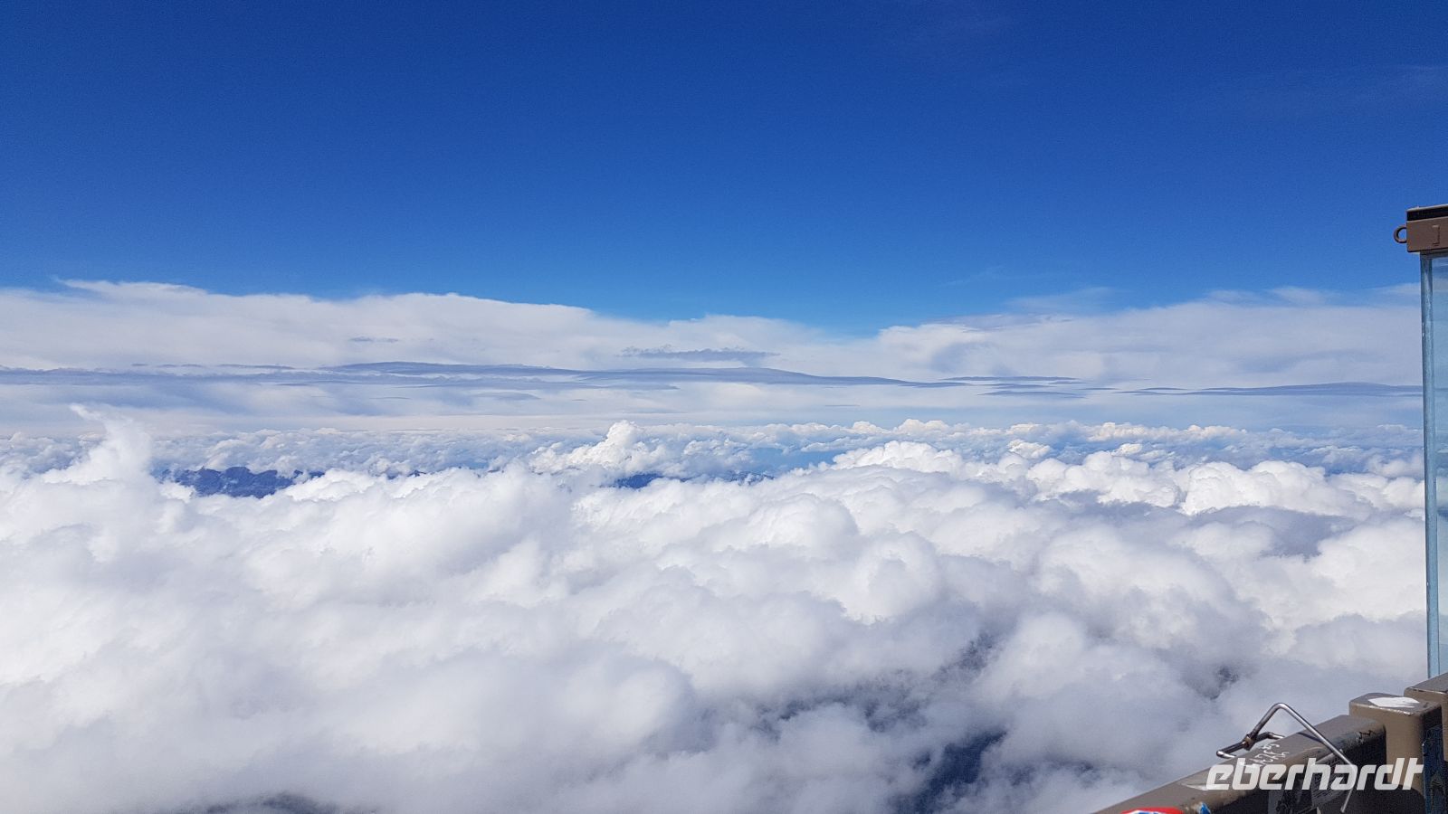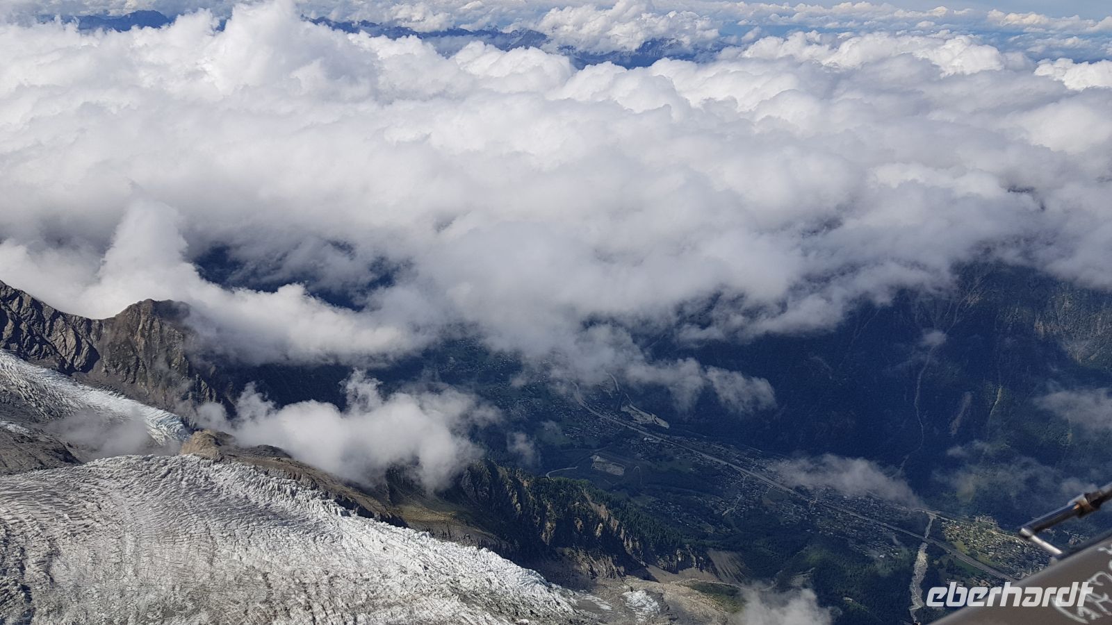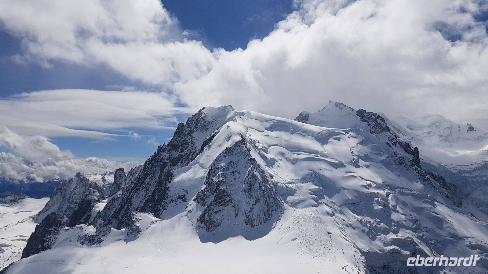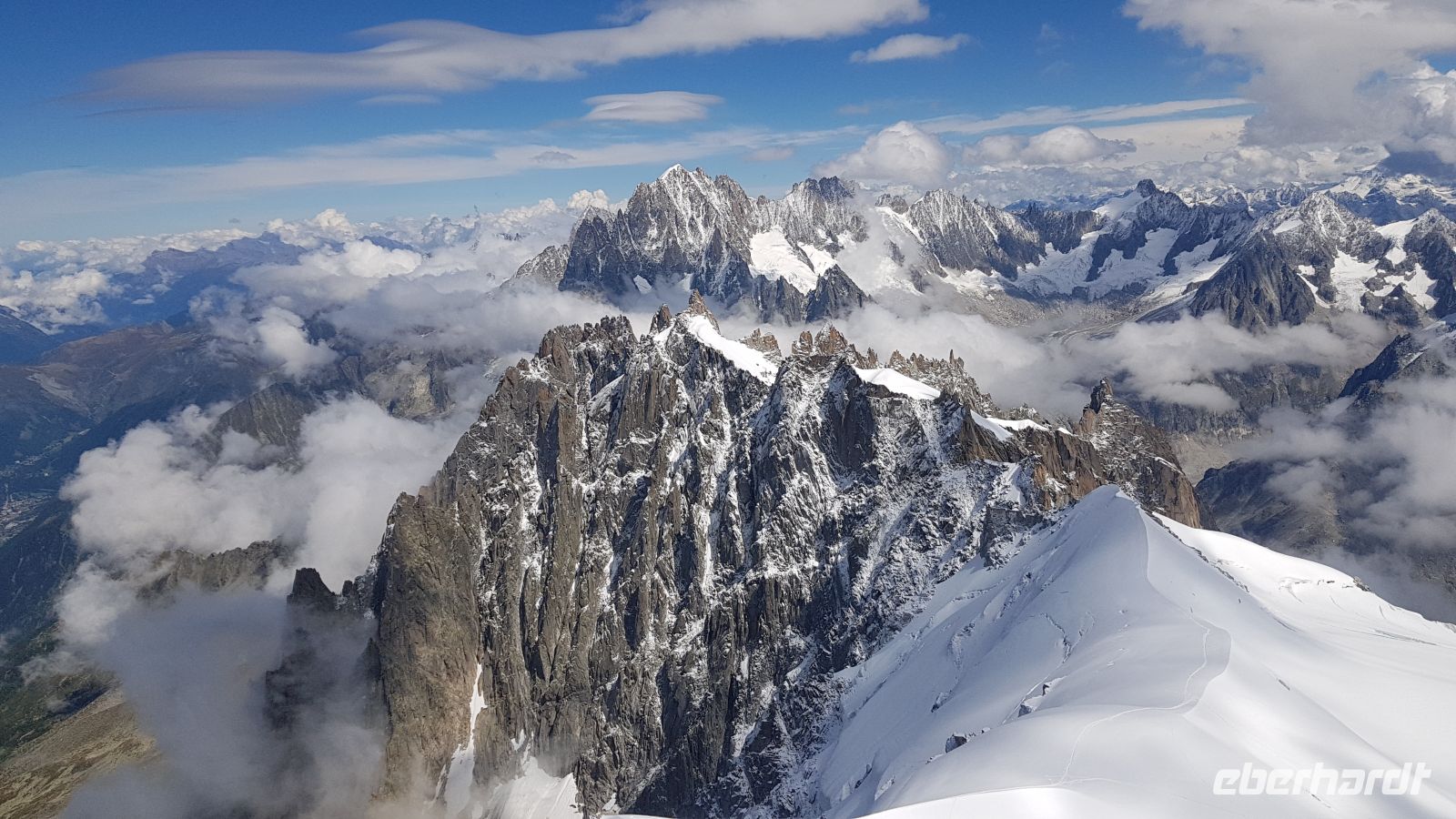 Bei Sonnenschein aber noch leicht bewölkten Himmel trafen wir in Chamonix ein. Während einige Gäste zum Bahnhof Montvers gingen, um den Eismeergletscher zu sehen und andere sich im Ort Chamonix umsahen, entschied sich der größte Teil unserer Gruppe, mit der Seilbahn auf die Aiguille du Midi zu fahren. In den letzten Stunden und Minuten waren die Aussichten, den Mont Blanc zu sehen gestiegen und so stellten wir uns an der Seilbahn an. Mit zwei Seilbahnen und einem Fahrstuhl ging es dann in schneller Fahrt gut 1000 m hinauf. Oben auf der Aussichtsplattform erwartete uns ein überwältigendes, geradezu berauschendes Alpenpanorama. Schnee und Eis hüllte die teils von der Sonne beschienen, teils von Wolken umspielten Gipfel ein. Der Gipfel des Mont Blanc blieb zwar hinter einer Wolke versteckt, aber es war viel schöner als wir je zu hoffen gewagt hatten. Wir versuchten mit unseren Fotos einiges von dieser großartigen Landschaft, die man bestenfalls für einige Sekunden nur aus dem Flugzeug sieht, einzufangen und verweilten erfüllt von unvergesslichen Eindrücken. Dann ging es herunter zum Bus, mit dem wir später durch die französischen Hochalpen von Savoyen in die Dauphiné nach Grenoble fuhren.