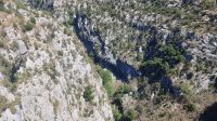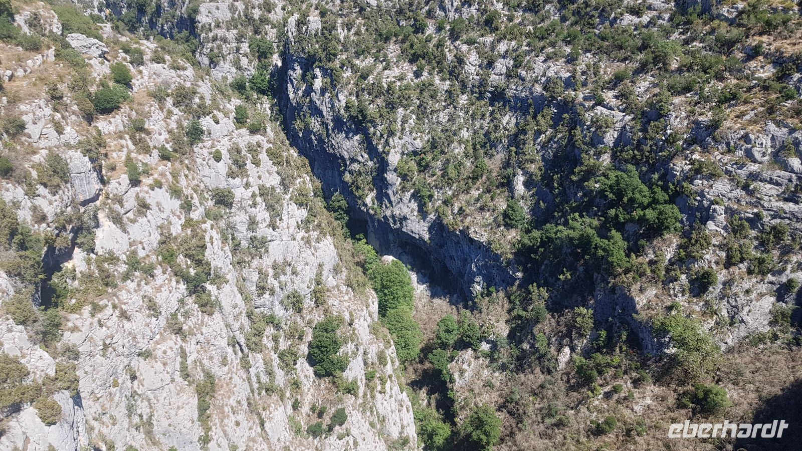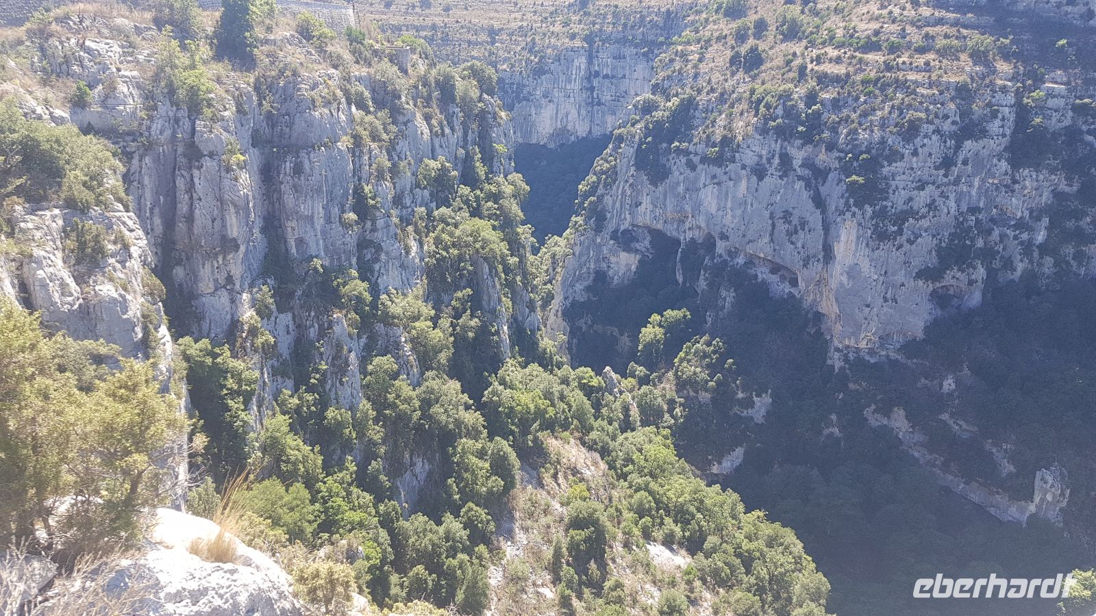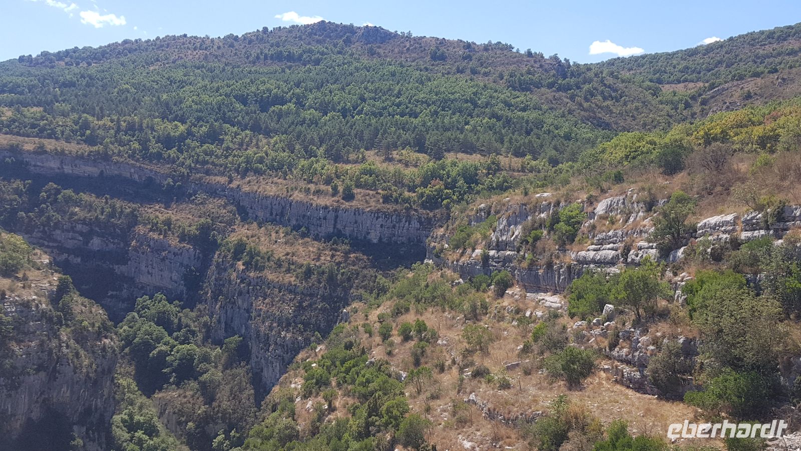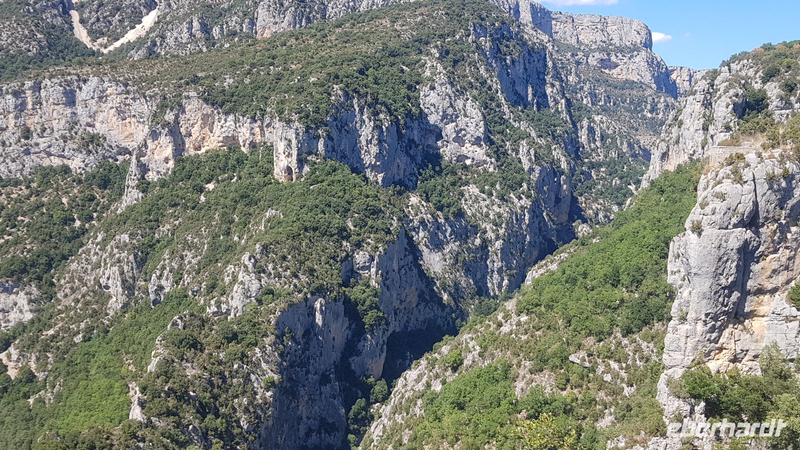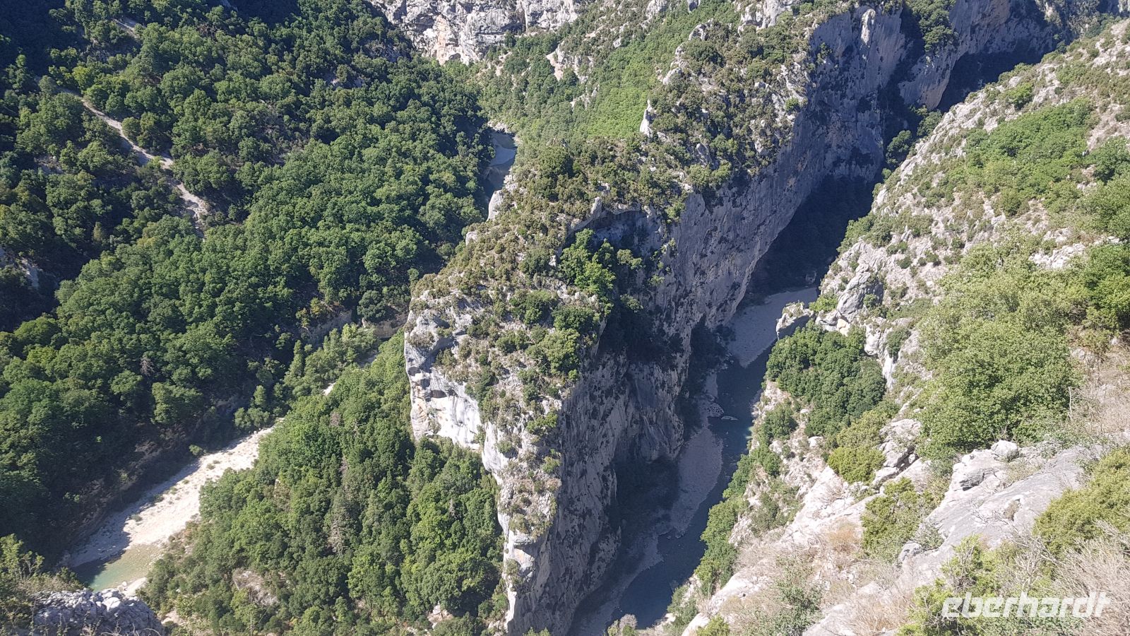 Später fuhren wir zum Lac de Sainte Croix, der direkt am Eingang der Schlucht endet. Als künstlicher Stausee ab 1973 geschaffen, nimmt er seitdem das Wasser des Flusses Verdon auf. Auf ihm sowie am Ausgang der Schlucht tummelten sich viele Paddelboote. Der faszinierende Blick von der Brücke in die Schlucht war ein fulminanter Anfang für unsere Fahrt entlang der Verdon-Schlucht. Wir nahmen die Südroute, die unmittelbar an der Schlucht entlang führt und vertrauten voll auf die Fahrkunst unseres Busfahrers. Was für eine imposante Schluchtlandschaft ! Mächtige Felsen von bis zu 700 m Höhe stiegen beidseitig vom Flussbett des Verdon auf. Als wir bei einem Fotostopp auf der Brücke des Flusses Artuby, einem Nebenfluss der Verdon, hielten, mussten wir jedoch feststellen, dass er vollkommen ausgetrocknet war. Zum Glück konnte man etwas oberhalb dieses „Zuflusses“ beim „Balcon du Mescla“ den Fluss des Verdon mit seinem türkisfarbenen Wasser wieder deutlich erkennen. Auch diese ca. zweistündige Fahrt entlang des „Grand Canyon du Verdon“ wird sicher zu den schönsten Erinnerungen unserer Reise gehören.