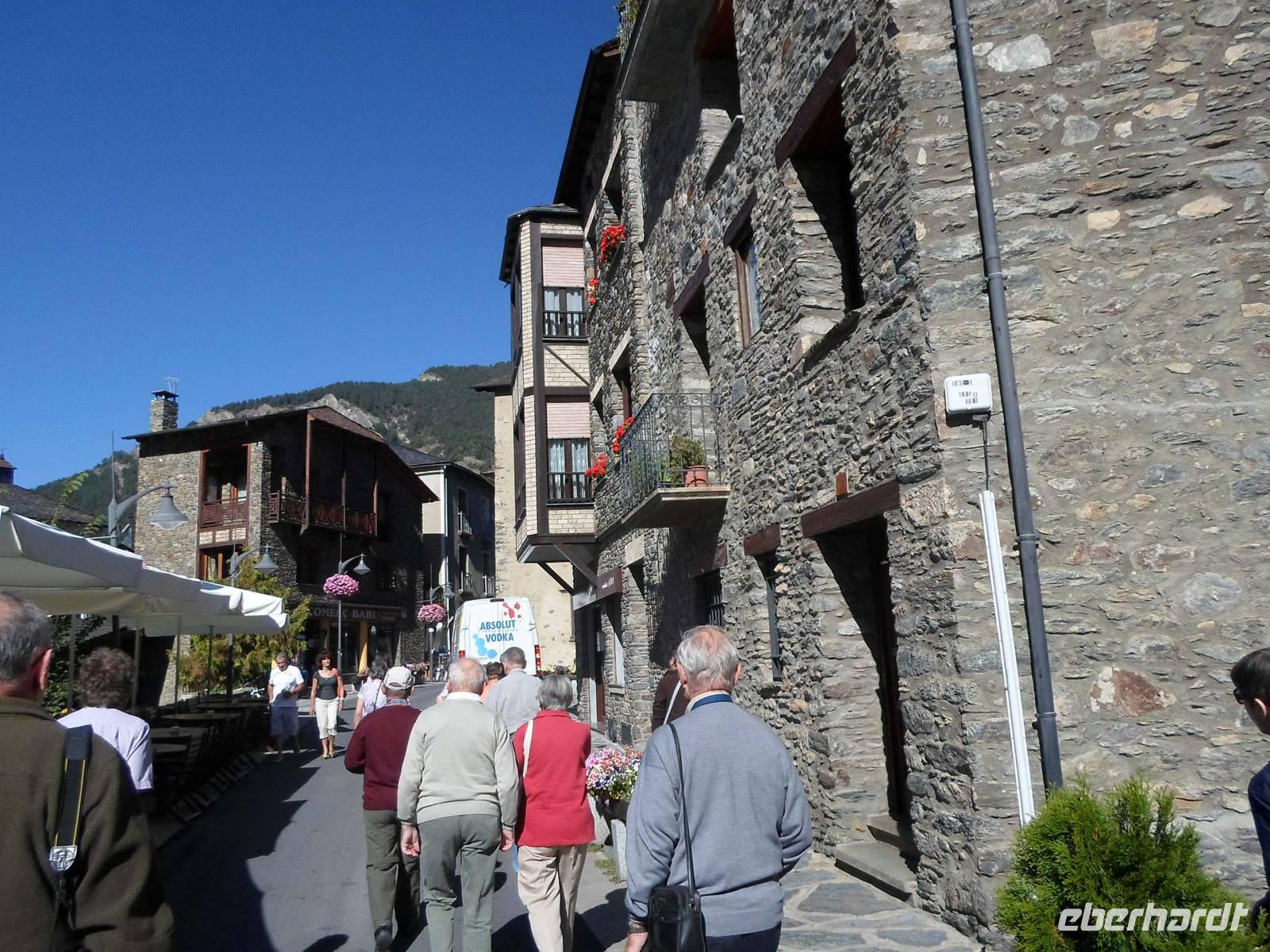 Wir fahren durch zahlreiche kleine Ortschaften, an Wasserfällen und steilen Abhängen vorbei, nach Meritxell. Sie ist die Hauptkirche des Zwergstaates und repräsentiert alle sieben Gemeinden des Landes. Unsere örtliche Reiseleiterin führt uns durch die moderne und helle Kirche, die 1976 eingeweiht wurde, nachdem die Orginalkirche 1972 durch einen Brand vernichtet wurde. Die vor vier Jahren wieder errichtete alte Kirche kann man kaum als Neubau erkennen. Wir fühlen uns wie in einer Kirche aus dem 17. Jahrhundert. Sant Meritxell ist einfach ein historischer und moderner Wallfahrtsort nicht nur am Nationalfeiertag der Andorras. Die Sonne meint es gut mit uns. Wir fahren entlang des rauschenden Flusses Valira d'Orient hinunter über Encamp, Escaldes - Engordany, La Massana nach Ordino. Hier sehen wir viele Einfamilienhäuser, die mit Naturstein verkleidet und mit Schiefer gedeckt sind. Man mag es nicht glauben, dass das neue Häuser sind. Aber das andorranische Baugesetz verlangt das von den "Häuslebauern". Für uns wirken diese Häuser ungewöhnlich und auch etwas dunkel. In Ordino besuchen wir zuerst das Museum der Familie Aren Plandolit, das uns allen gefällt und wir uns das Leben der Familie des Eisenmagnaten im 19. Jahrhundert bildhaft vorstellen können. Einige Gäste laufen noch zum Miniaturmuseum, das unbedingt einen Besuch wert ist. Auf unserer Weiterfahrt stoppen wir an einer kleinen Likörfabrik, die durch ein deutsches Ehepaar geführt wird. Wir probieren verschiedene Sorten von Likör und lassen uns zum Kauf manch kleiner Leckerei verführen. Dann fahren wir weiter und erreichen das Dreiländereck Andorras - genannt auch "Flaschenhals". Es ist ein Aussichtsplateau, 2069 m hoch gelegen, eingerahmt durch die Bergwelt Andorras, Frankreichs und Spaniens. Wir genießen den phantastischen Ausblick. Danach fahren wir wieder bergab und erfrischen uns an der dem "Jungbrunnen". Auf die sichtbare Verjüngung warten wir aber immer noch. Anschließend machen wir einen kleinen Spaziergang in der Hauptstadt Andorras - Andorra la Vella. Dort besuchen wir gemeinsam die Altstadt und machen einen Einkaufsbummel im Kaufhaus. Nach diesem erlebnisreichen Tag geht es zurück zu unserem schönen Hotel.