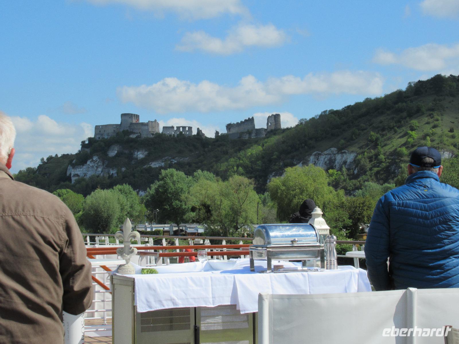Als wir uns unserem ersten Halt, den Andelys, nähern, sehen wir die imposante Silhouette der Ruinen von Château Gaillard, die auf einem kleinen Hügel liegen.