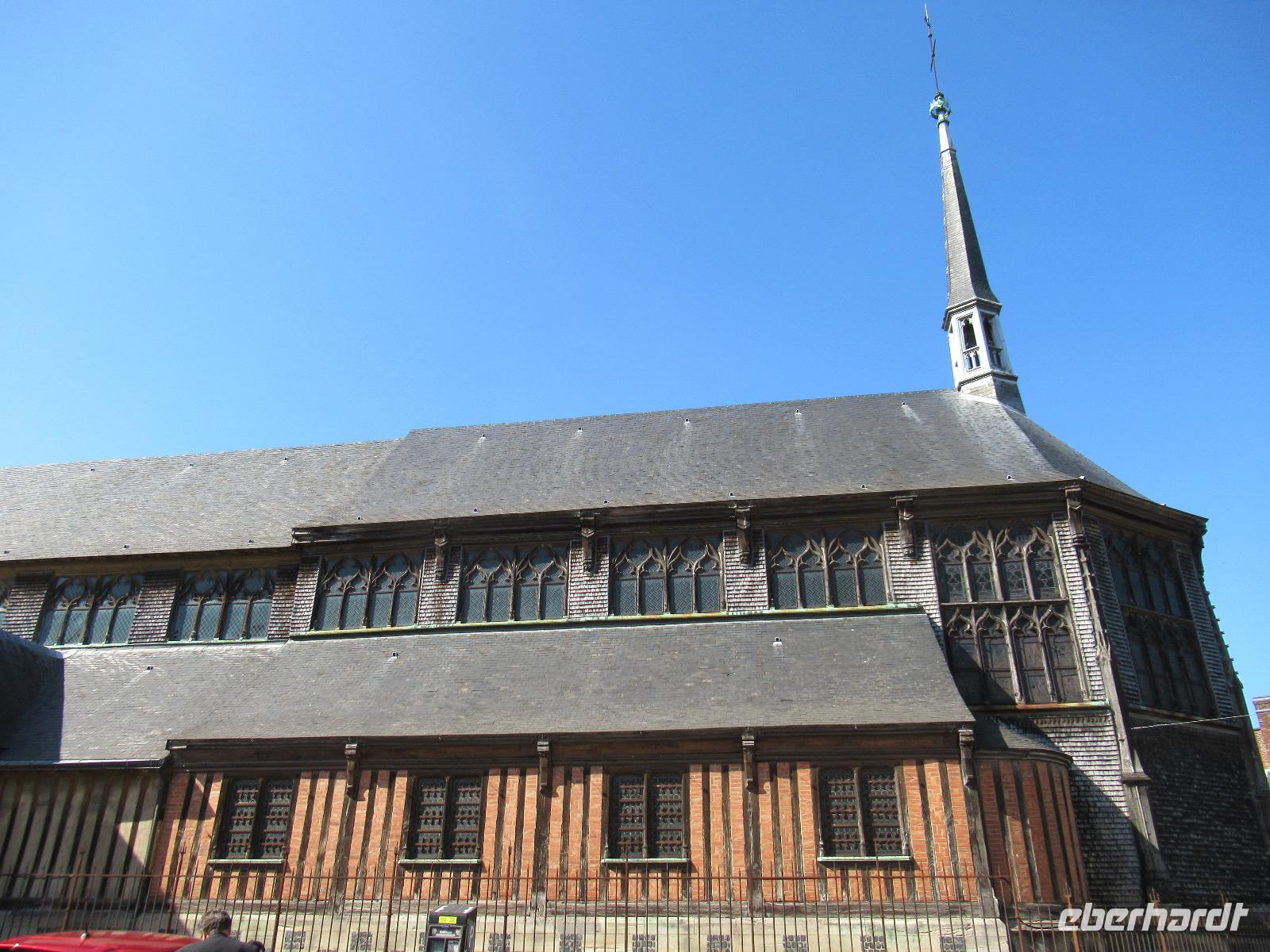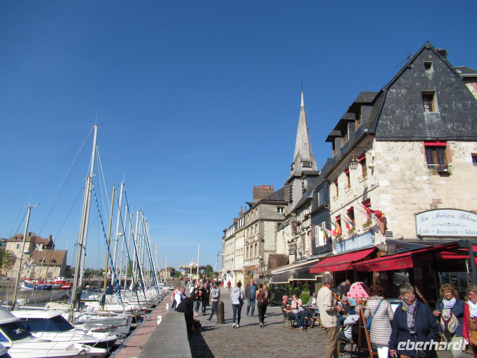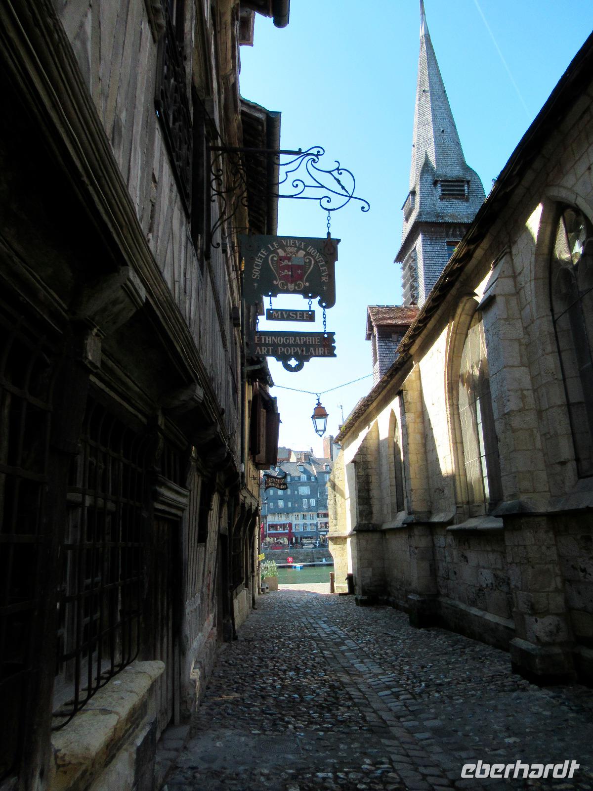 Dann fahren wir nach Honfleur, einem kleinen Fischerhafen, mit seiner vollständig aus Holz gebauten Kirche St. Katharina und seinem separaten Glockenturm.