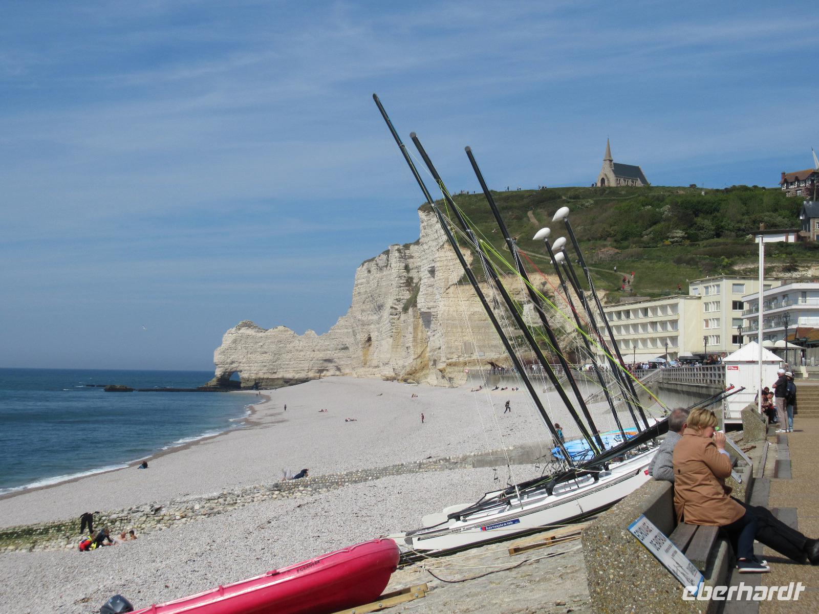 Auf der Spitze der Klippe von Amont, im Osten, befindet sich eine kleine Kapelle. Zwischen den beiden Klippen befindet sich ein sehr schöner Strand aus grauen Kieselsteinen, die früher für den Bau verwendet wurden. Aber niemand soll es wagen, heute einen dieser Steine aufzuheben. Sie stehen unter Naturschutz, weil sie dazu beitragen, dass das Meer den unteren Teil der Stadt nicht überschwemmt.