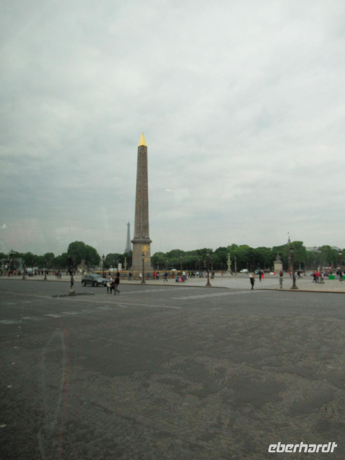 Dann fahren wir zum Place de la Concorde und über die Champs-Elysées mit ihren Luxusboutiquen, Kinos, Restaurants und Luxushotels. Die Champs Elysées ist ein Vorzeigebild von Paris, der Touristenanzugspunkt. Wir halten am Eingang des Tuilerie-Gartens, um diese schöne Allee und den Place de la Concorde (Platz der Eintracht), mit dem Obelisken aus dem Tempel von Luxor, besser fotografieren zu können. Der Obelisk war ein Geschenk des ägyptischen Vize-Königs Mohammed Ali an der König Louis Phillipe im Jahre 1831, um ihm für seinen Beitrag zur Entwicklung des Landes zu danken. Er stammt aus dem 13. Jh.v.Chr. von Ramses II. als Teil eines Tempelvorbaus.