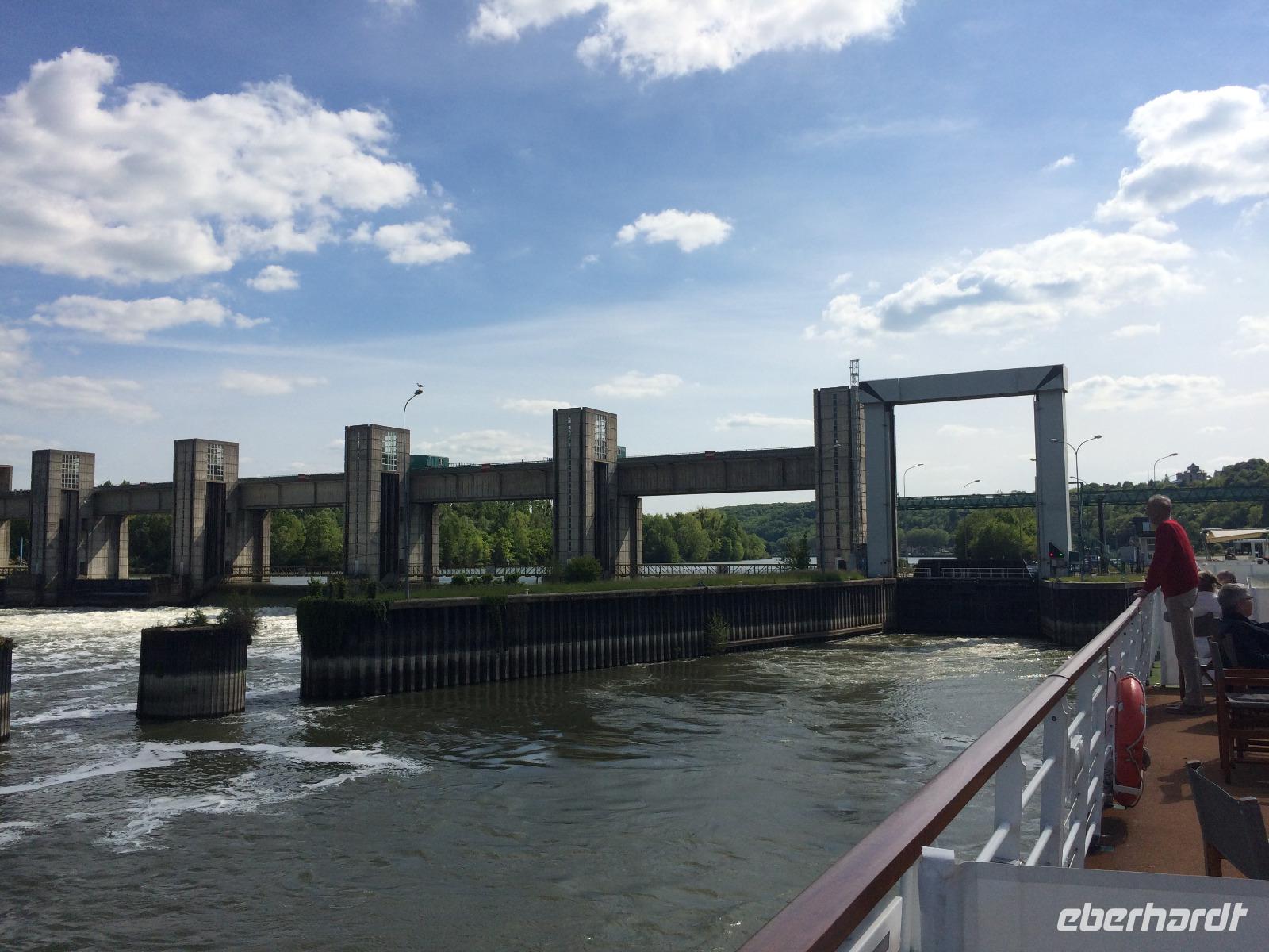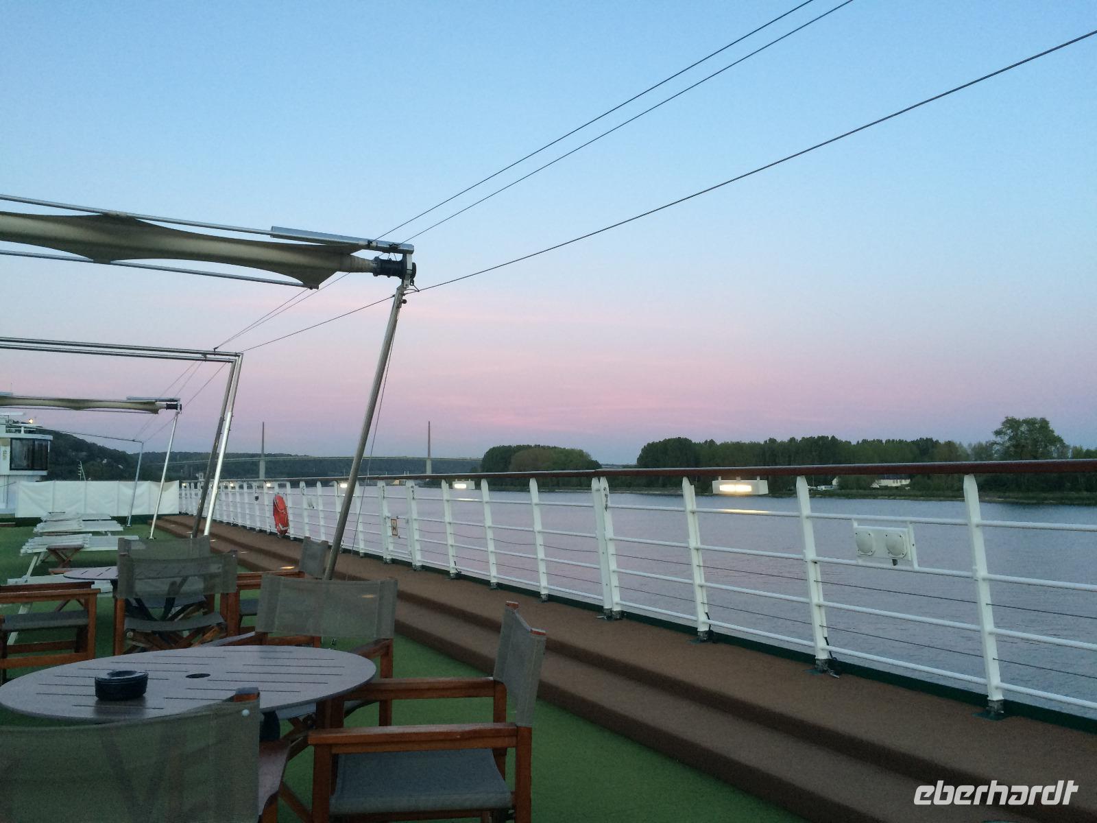 Wir passieren die Seinemündung mit der Normandie Brücke, deren Länge, in den 80er Jahren, einen Weltrekord aufstellte und kommen gegen 18.30, vom Calvados beflügelt, an unserem Schiff an.