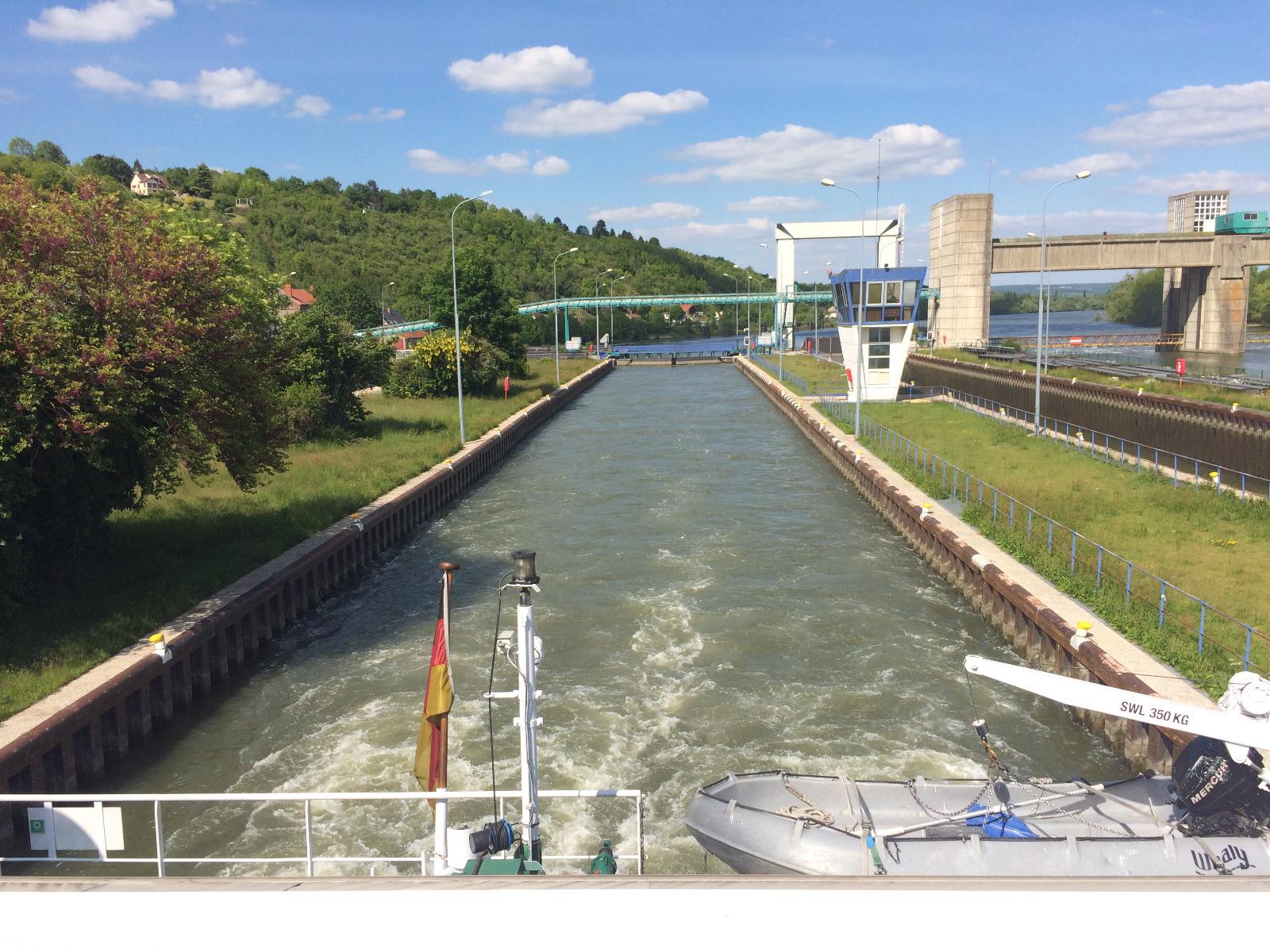 An Deck des Schiffes beobachten wir eine Schleuse, welche sich öffnet und schließt, während wir vorbeifahren und ein Glas Bier oder Wein trinken.