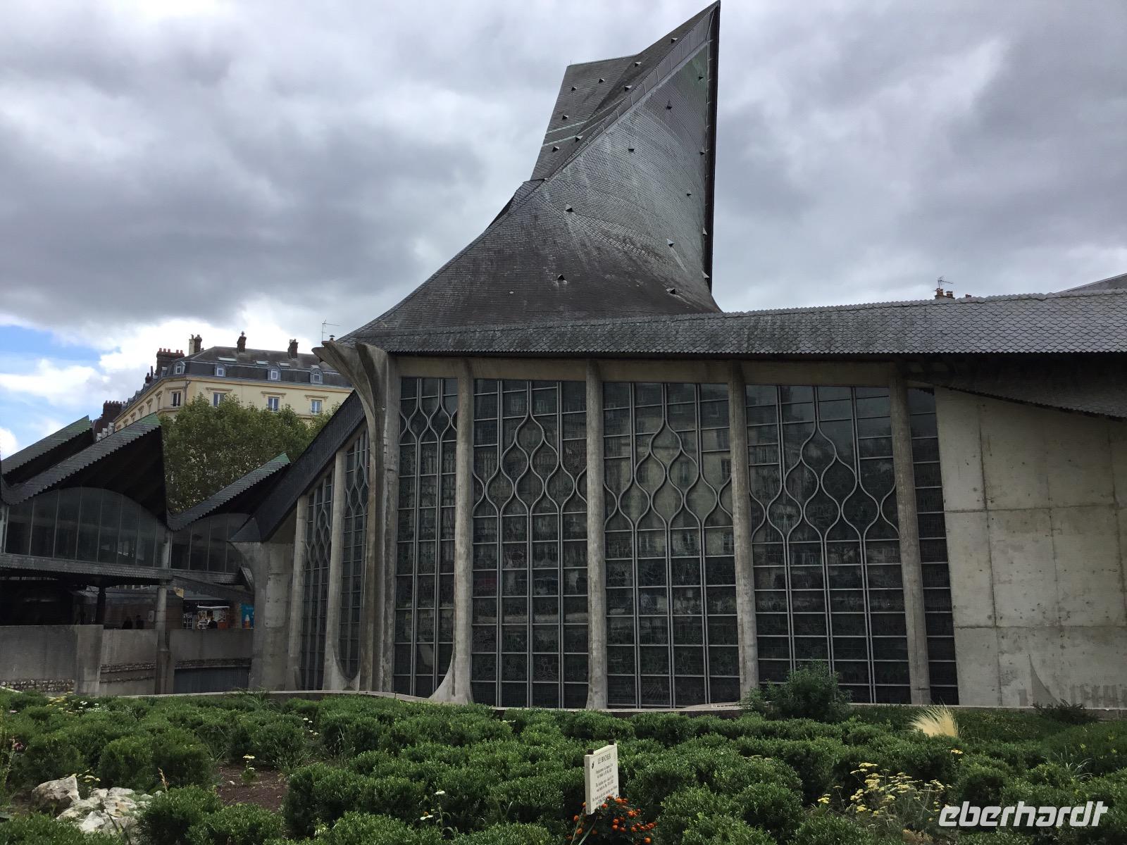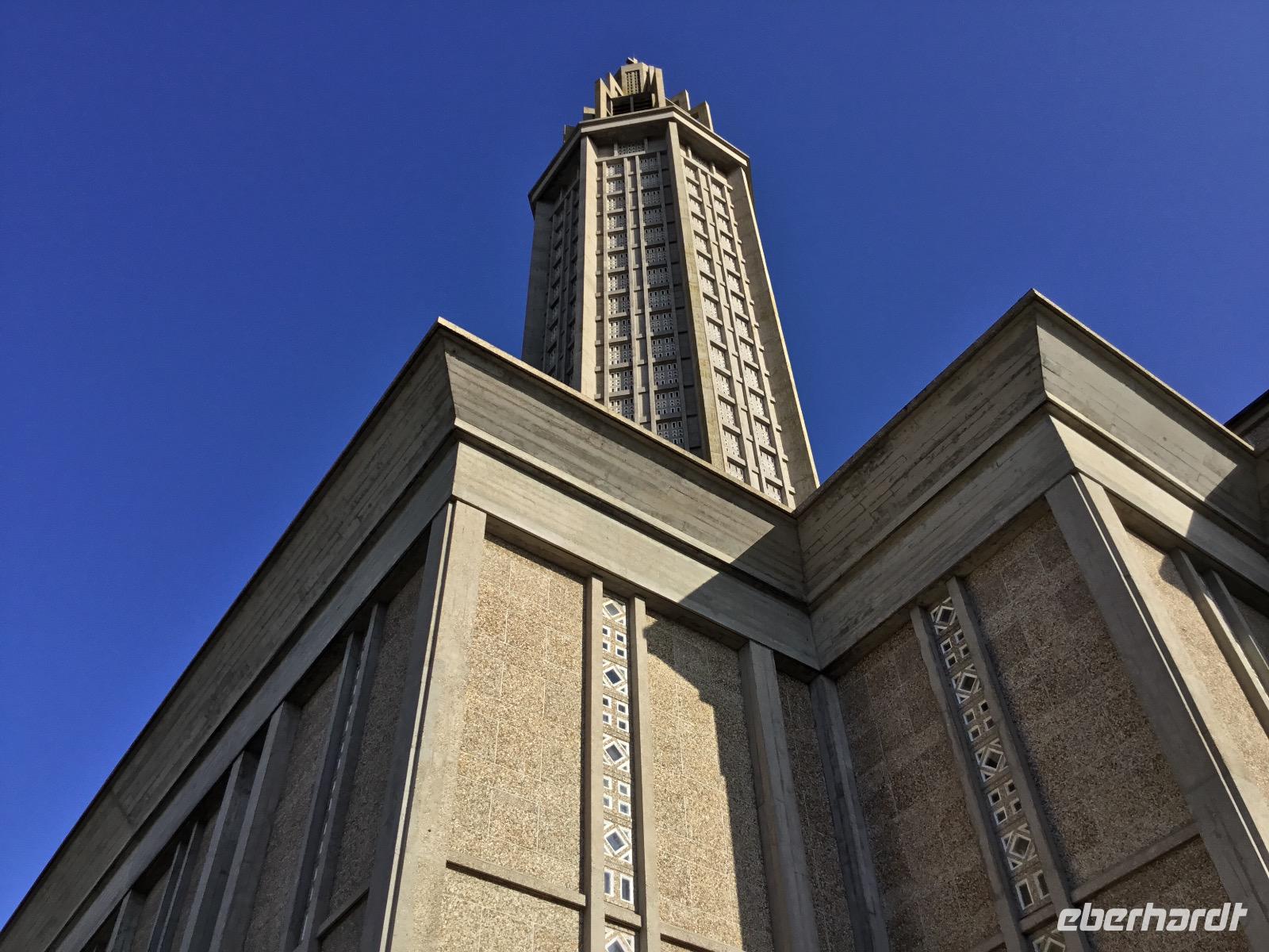 Nach dem Mittagsbuffet geht es dann erneut ans Meer, an die „Alabasterküste". Die unterschiedlichen Formen der Felsen regen die Phantasie an und zahlreiche Maler habe hier ihre Motive gefunden. Uns bläst zwar ordentlich der Wind entgegen, aber trotz der ziehenden Wolken, gewinnt die Sonne zunehmend die Oberhand. Nach diesem Naturerlebnis begeben wir uns auf die Rückfahrt, nicht jedoch ohne einen Abstecher in Le Havre gemacht zu haben. Die Innenstadt wurde im Zweiten Weltkrieg fast gänzlich zerstört, weshalb hier in den 1950er Jahren eine neue Stadt gebaut wurde. Ein Architektenteam um Auguste Perret gab der Stadt ein neues Gesicht in der damals modernen Bauweise des Stahlbetons. Heute erfreuen sich die Wohnungen großer Beliebtheit, denn Le Havre gehört zu den Regionen in Frankreich, die im Wachsen begriffen sind.