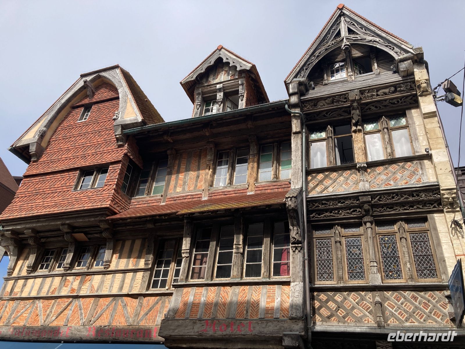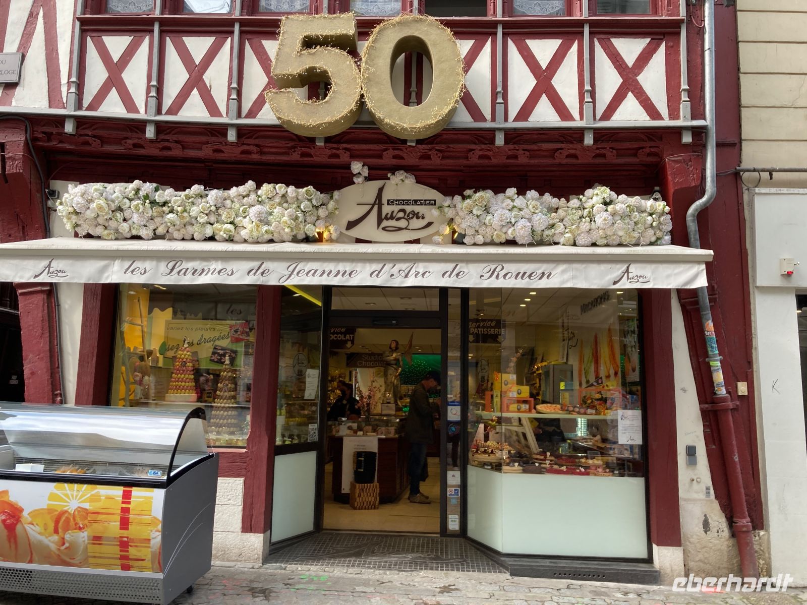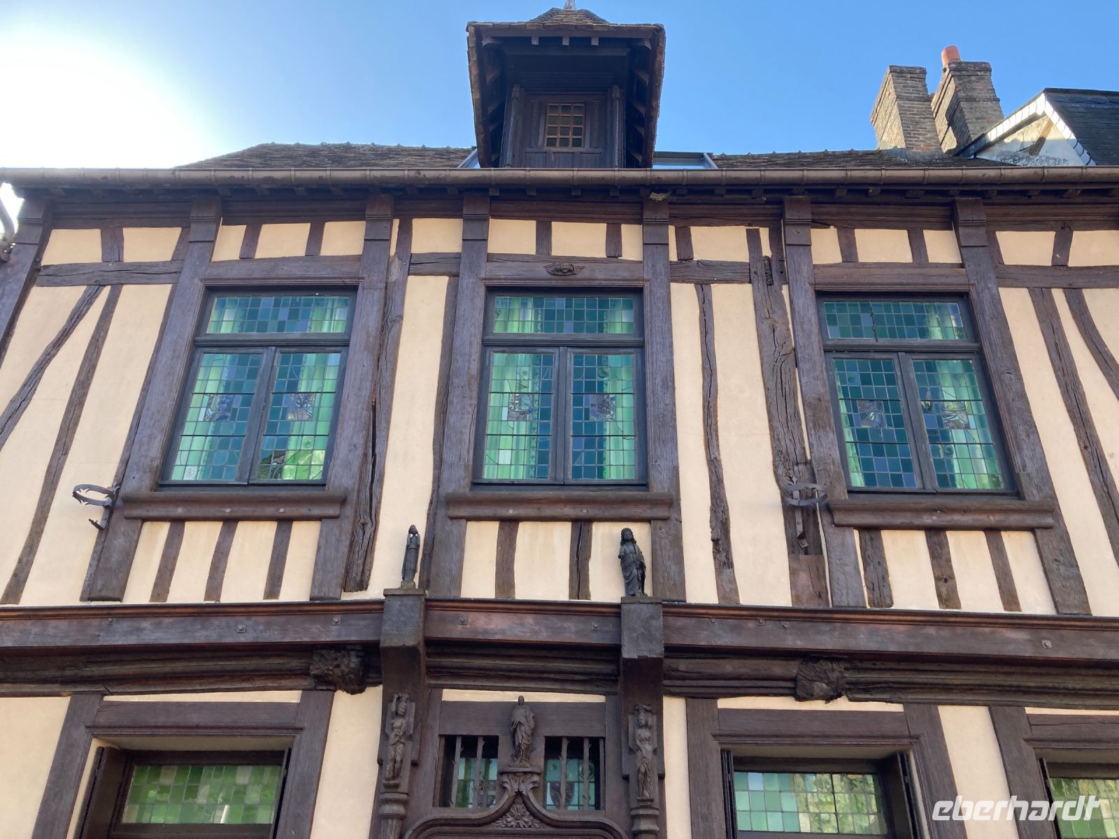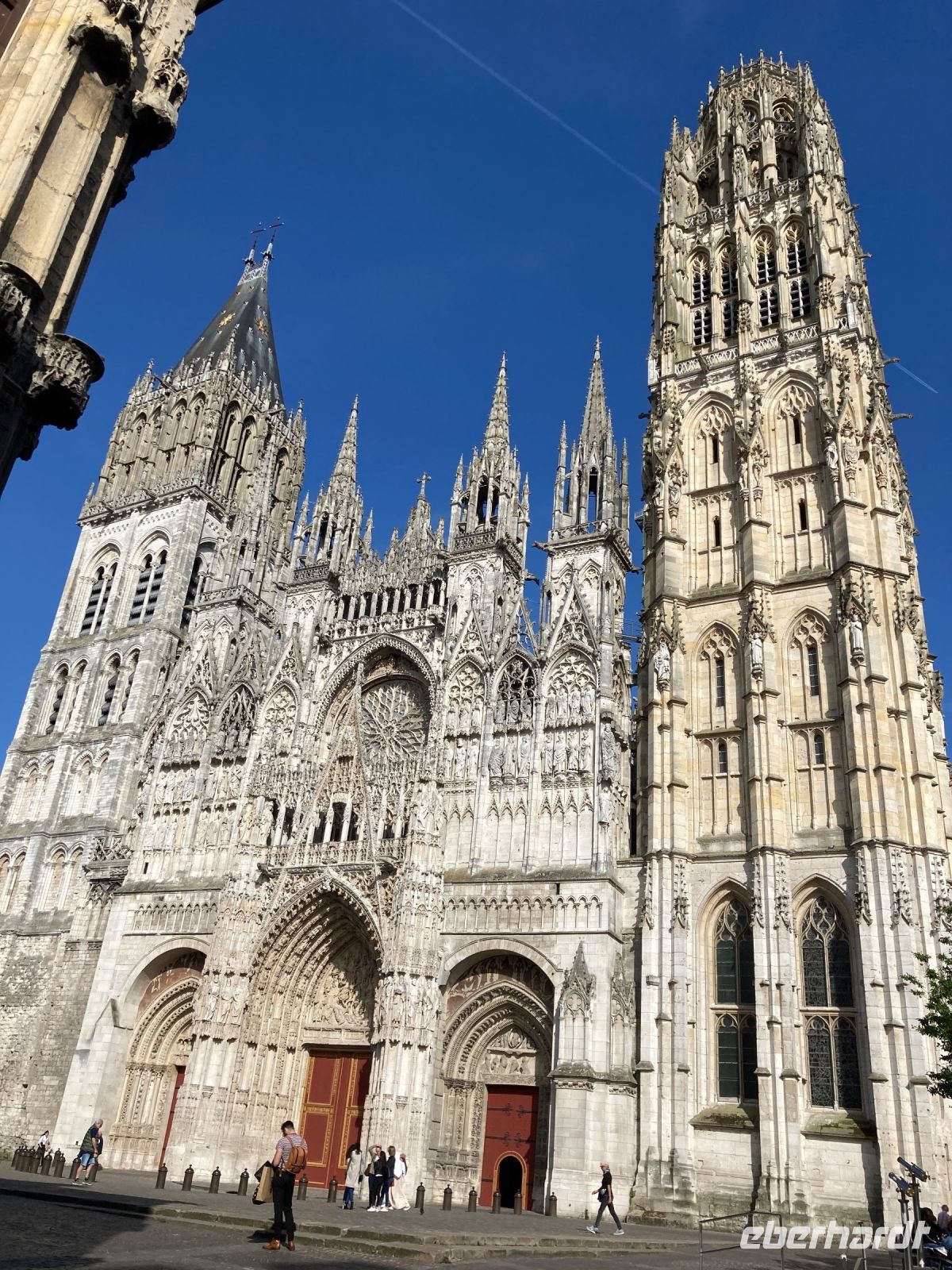 Der Vormittag sollte eigentlich mit einem Stadtrundgang mit örtlichen StadtführerInnen, die der deutschen Sprache mächtig sind, beginnen. Nur leider muss die Führung abgesagt werden. Nun denn... Ein zweites Mal geht es also nun in Richtung Zentrum, schließlich soll ja auch der andere Teil der Eberhardt-Gäste einen Eindruck von dieser reizvollen Stadt bekommen. Zunächst geht es an der Seine entlang. Es ist schon ein kleiner Fussmarsch zu absolvieren. Aber das Wetter ist gut. Morgens zwar immer noch frisch, aber dafür gibt es ja schließlich die passende Bekleidung. Unser erstes Ziel ist die Kathedrale, die gleich mit drei imposanten und zudem noch unterschiedlichen Türmen aufwarten kann. Der rechte Turm auf der Westseite trägt den Namen Butterturm. Das hat nichts seiner gelblichen Farbe zu tun, sondern mit dem Einfallsreichtum der Bürger dieser Stadt. Um die strengen Speiseregeln in der Fastenzeit zu umgeben, spendeten die cleveren Bewohner für den Bau des Turmes und mussten im Gegenzug unter anderem auf ihre heiß geliebte Butter nicht verzichten. Einige Gäste möchten gerne noch etwas mehr von dieser Stadt gehen, und gehen in östlicher Richtung weiter. Auf ihrem Weg werden ihnen noch zahlreiche Fachwerkhäuser begegnen. Die anderen zieht es gleich zur Gros Horloge. Die heutige Ansicht stammt aus dem Jahre 1389 und wird von einem Turm flankiert. Zuvor hatte Charles VI im Jahre 1382 den Vorgängerturm zerstören lassen als Strafe, da die Rouener gegen die Aufhebung ihrer kommunalen Rechte revoltierten. Die Zerstörung des alten Turms war für die EinwohnerInnen gleichbedeutend mit dem Verlust ihrer Freiheit. Daraus erklärt sich auch das dringende Bedürfnis einen neuen Turm und eine viel schönere Uhr zu schaffen. Aber nicht nur diese Uhr ist ein Zeugnis besonderer Ereignisse in dieser Stadt. Ein Stückchen weiter öffnet sich die enge Straße zu einem Platz, der Place Vieux-Marché. Hier fand im Mittelalter das öffentliche Leben statt. Am 30.Mai 1431 wurde Jeanne d'Arc hier den Flammen übergeben. Sie war gerade einmal 19 Jahre alt und doch hatte sie die Geschichte Frankreich maßgeblich mitbestimmt. Doch nun wollen wir wieder zum Schiff gehen. Schließlich wartet das Mittagessen, um dann gestärkt am Nachmittag einen Ausflug an die Küste zu unternehmen.