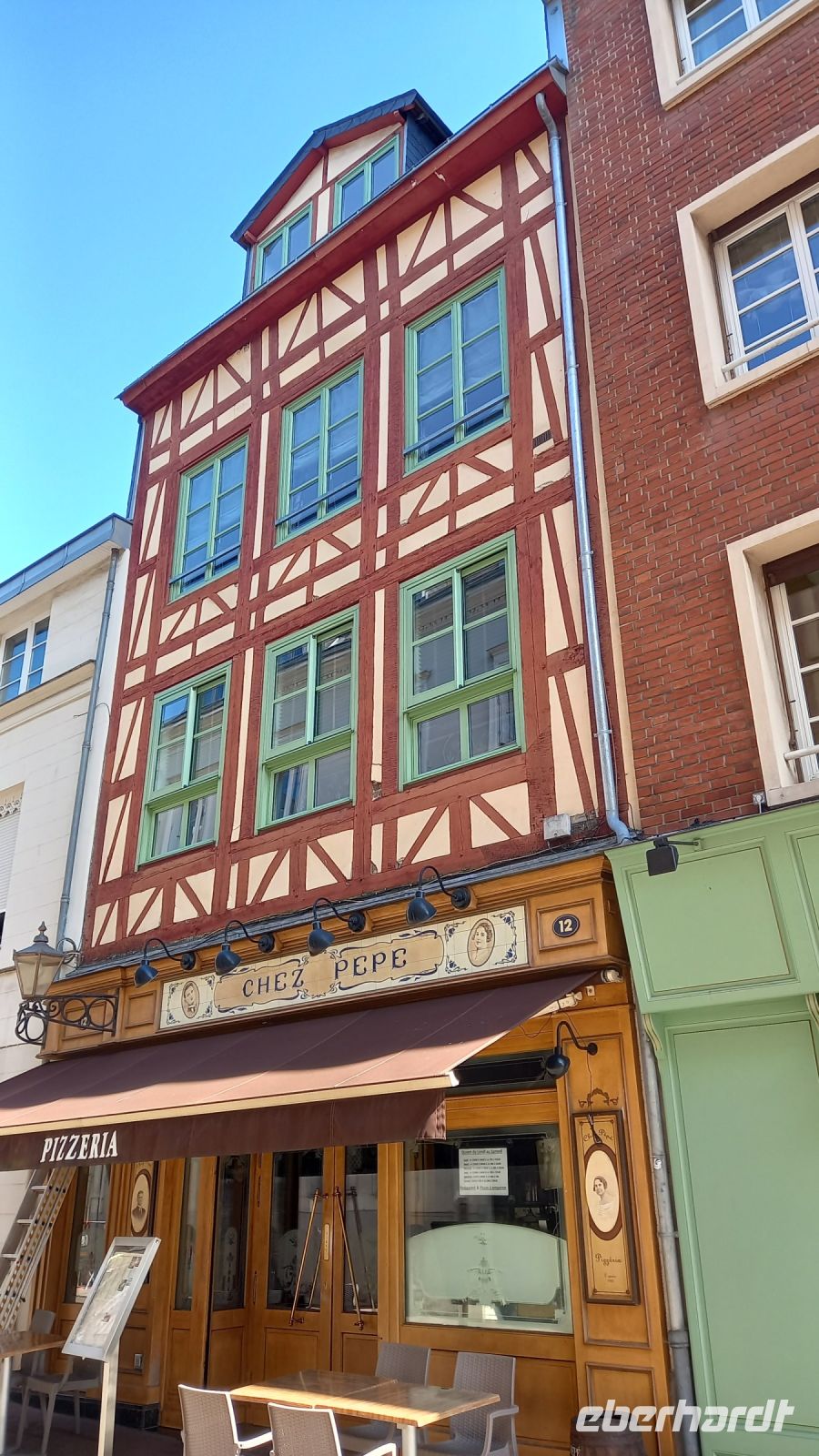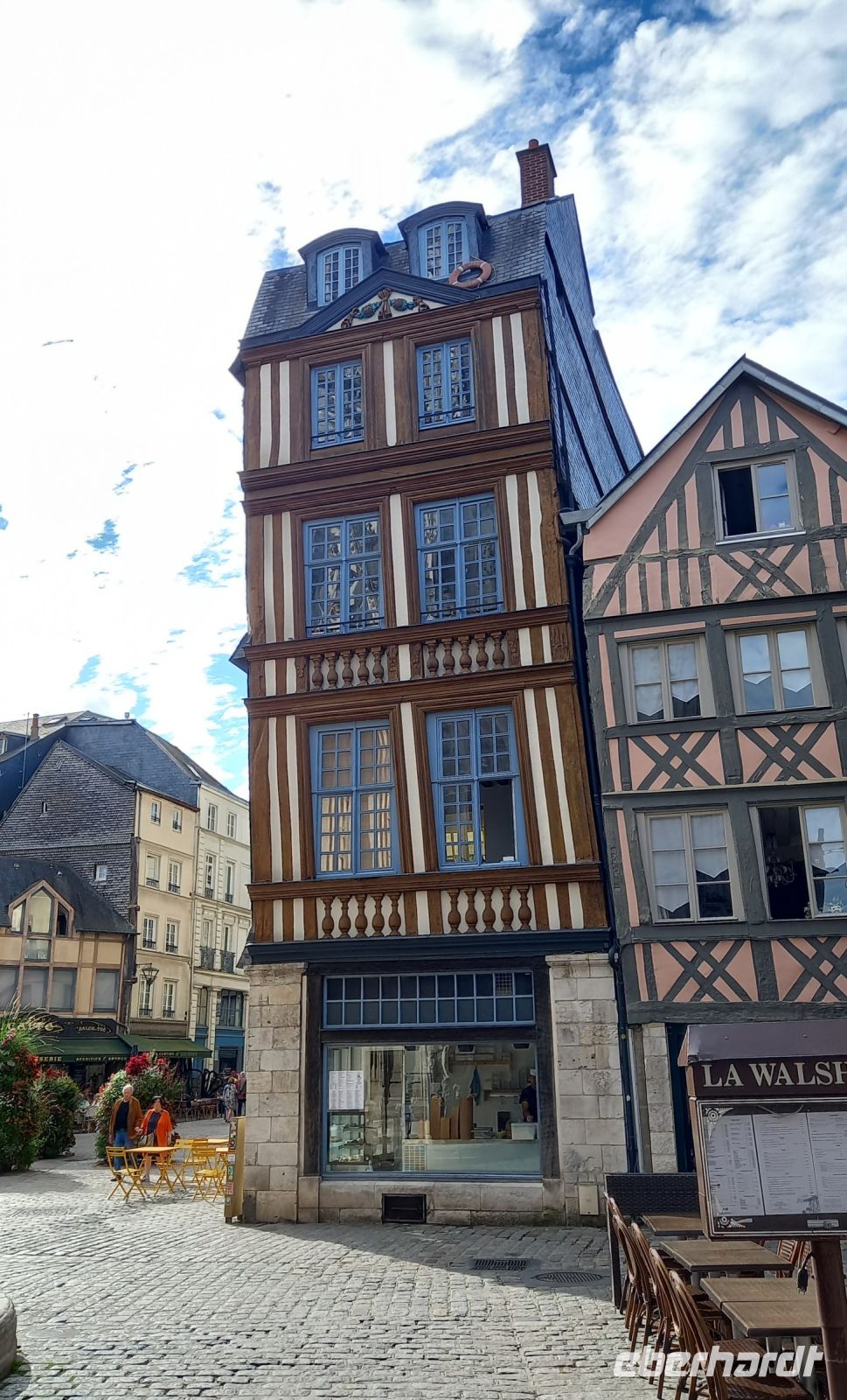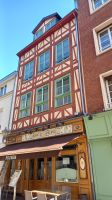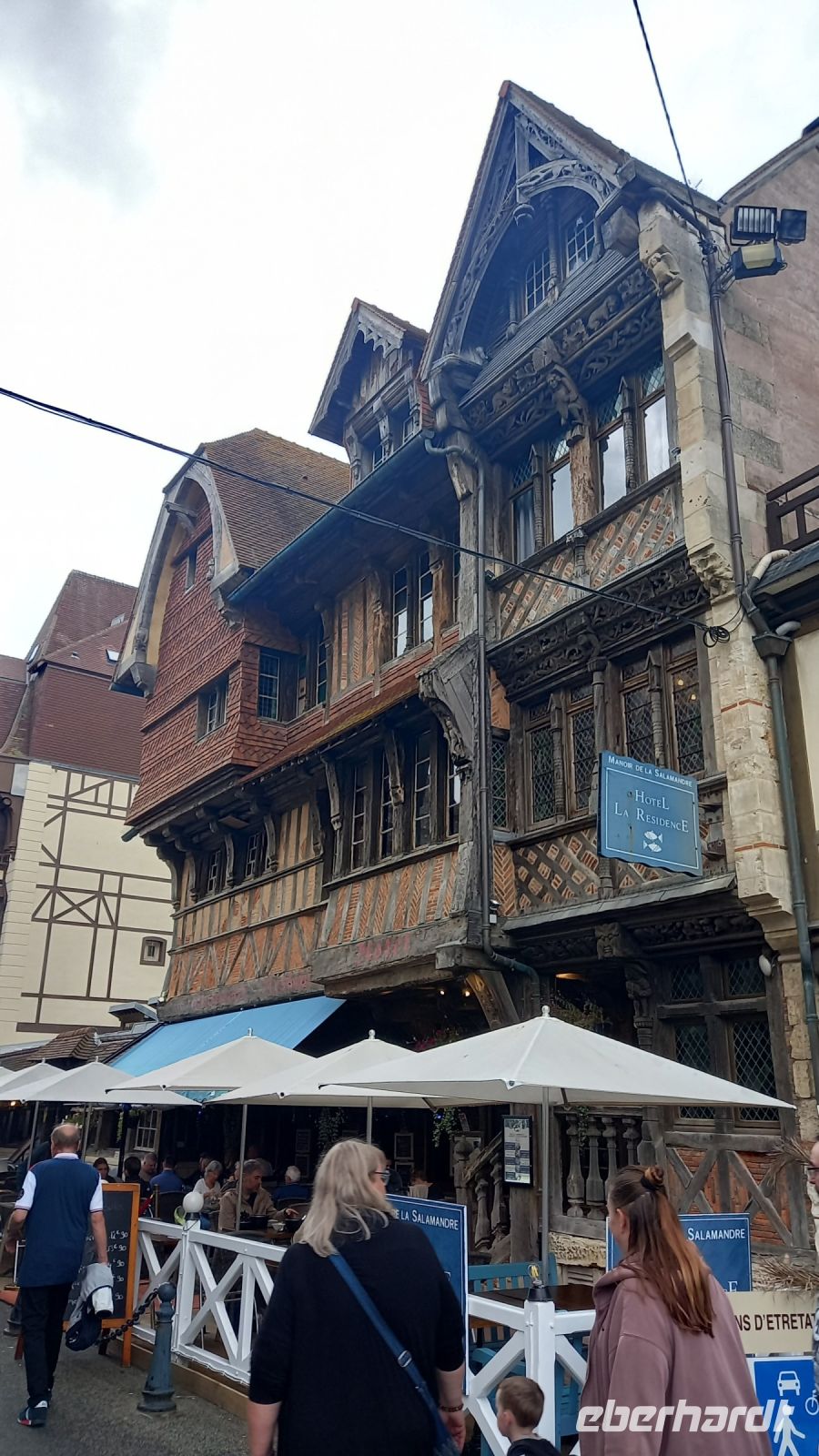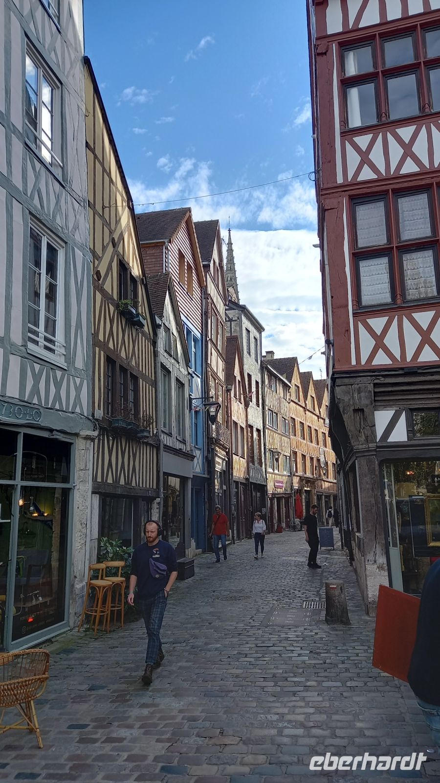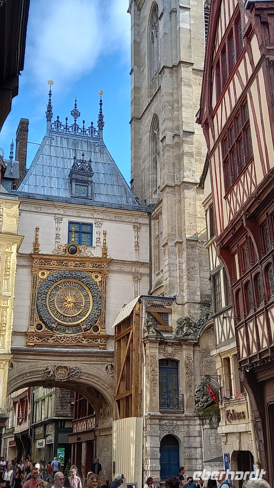 Auf dem Stadtrundgang durch Rouen am Nachmittag konnten wir die zahlreichen gut erhaltenen Fachwerkhäuser in der Altstadt bewundern, die sich durch ihre dominanten Längsbalken von der deutschen Fachwerkarchitektur doch unterscheiden. Reste der mittelalterlichen Stadtmauer mit einer großen goldenen Uhr und viele schmale Gässchen säumten unseren Weg zu einer Chocolaterie, in der wir köstliche Macarons in zahlreichen Geschmackssorten probieren konnten.