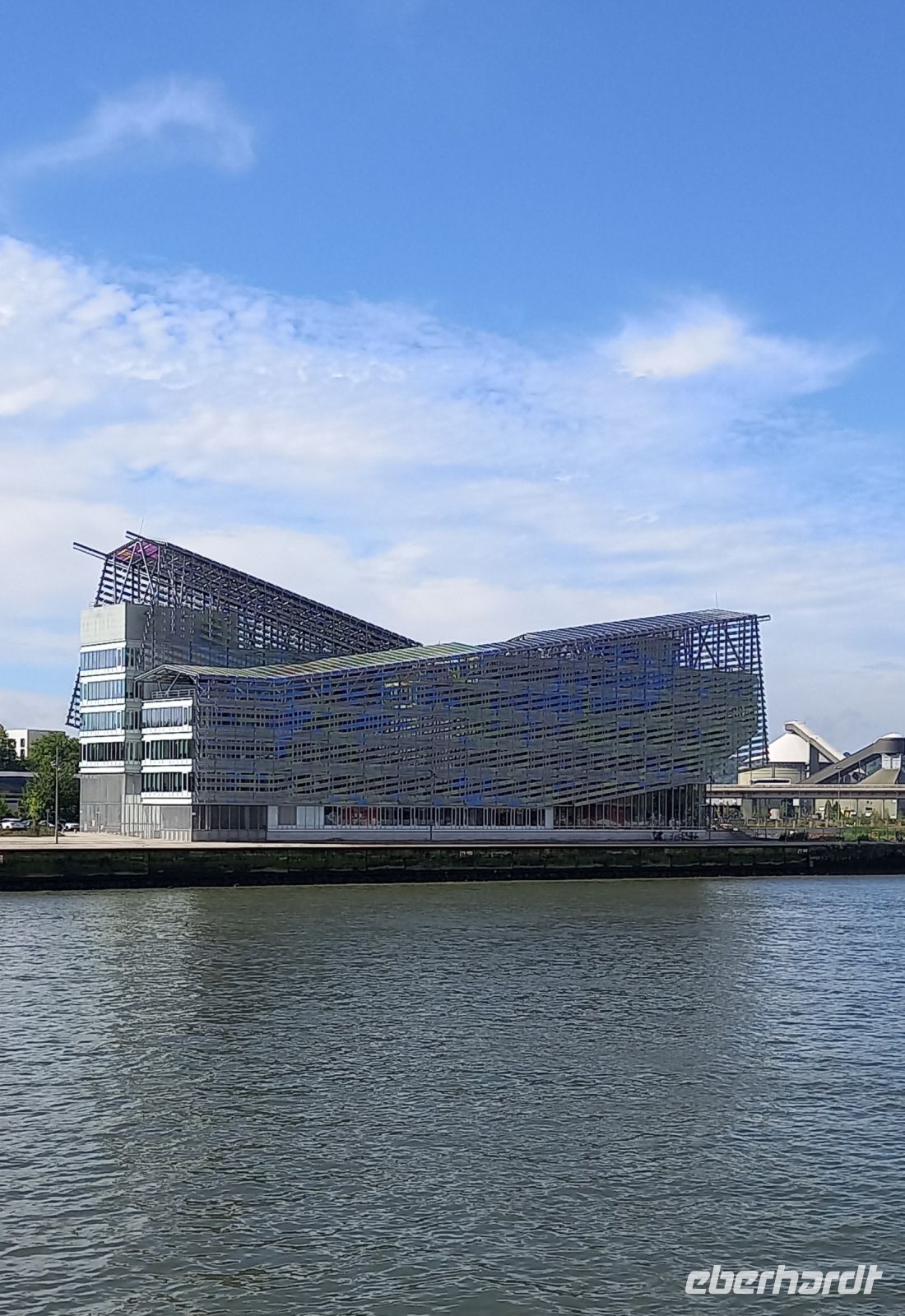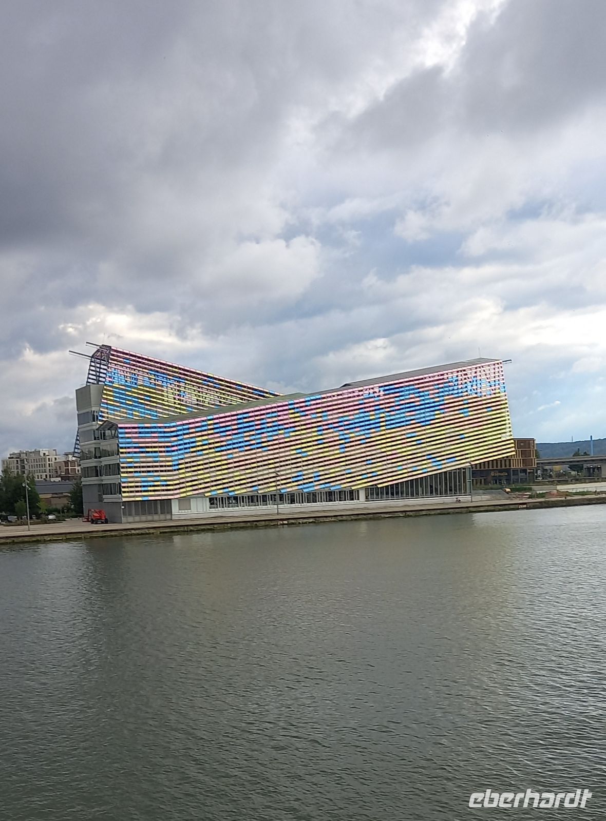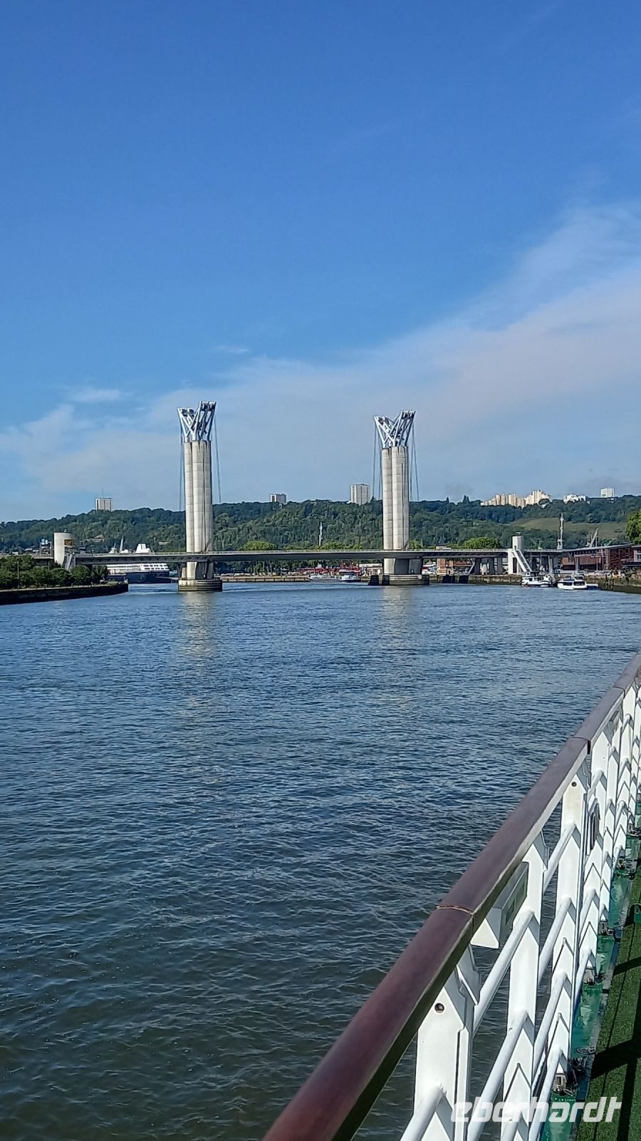 Während wir in Rouen bei strahlendem Sonnenschein einliefen und ankerten zog es viele aufs Sonnendeck, wo die Bordküche mittags eine französische Paella zur Verkostung anbot. Sehr beeindruckend war der Blick auf die riesige Hebebrücke und das am anderen Ufer liegende Stadtverwaltungsgebäude, welches mit bunten Jalousien verkleidet ist, die die Pinselstriche des berühmten Impressionisten Claude Monet symbolisieren sollen.