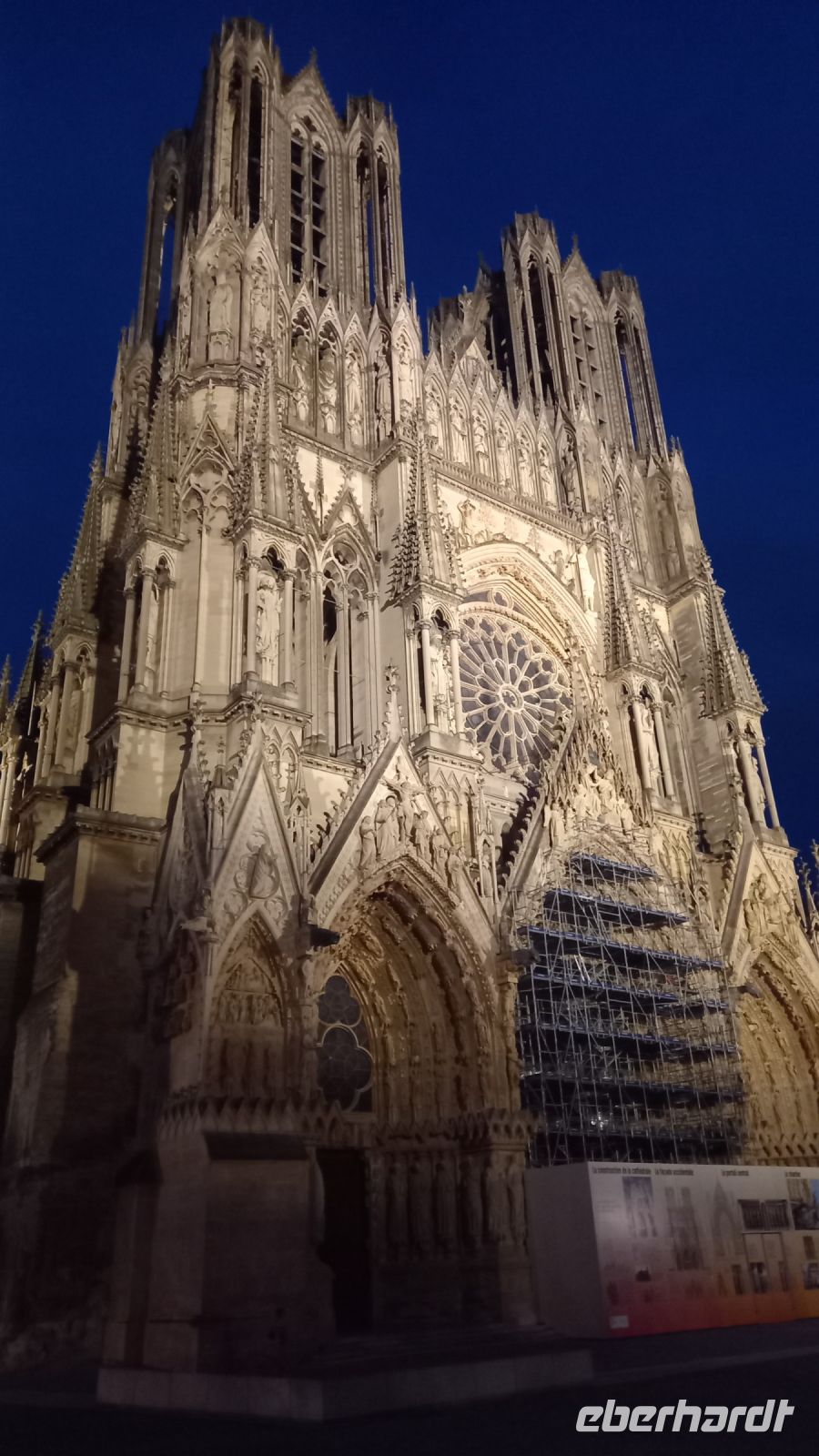 Am frühen Morgen starteten wir vom Dresdner Flughafen Richtung Reims in Frankreich. Nach einigen Stopps, um Zubringergäste aufzunehmen, waren wir dann gegen 10.30 Uhr vollzählig und fuhren Richtung Westen. Gegen Mittag erreichten wir die Ausläufer des Taunusgebirges, überquerten den Main und sahen die Skyline von Frankfurt. Weiter ging es an Karlsruhe und Ramstein vorbei Richtung Saarbrücken. Am Nachmittag passierten wir die französische Grenze und die Reiseleitung informierte uns über eventuelle Polizeikontrollen und worauf man dazu im Bus achten sollte. Wir passierten Verdun und Valmy, fuhren in die Region Champagne ein und befanden uns dann schon auf der Zielgeraden nach Reims.