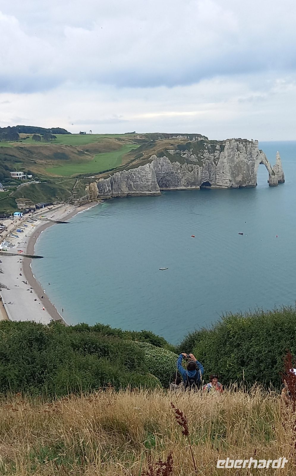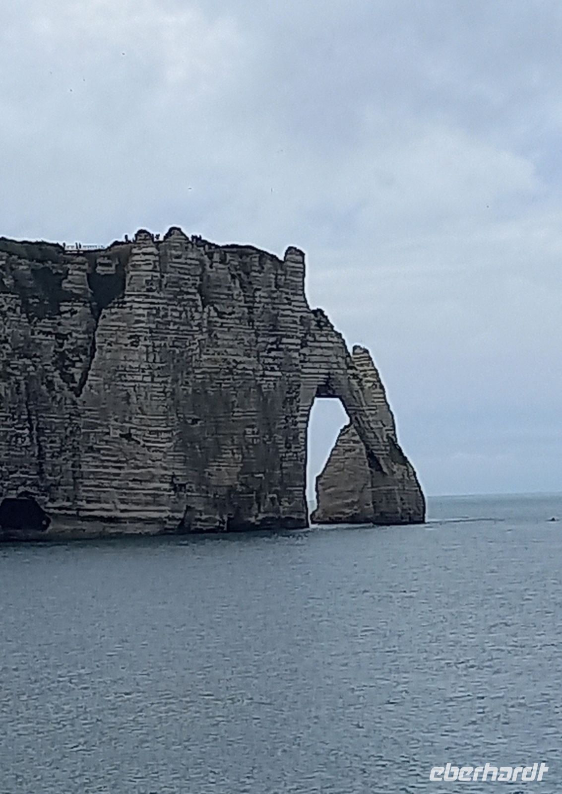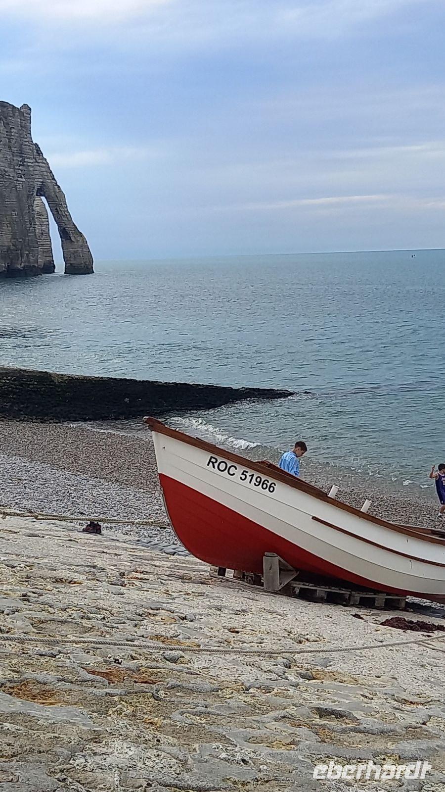 Heute ließen wir es am Vormittag ruhig angehen und schlenderten nochmal individuell durch das Morgengetümmel von Rouen. Nach dem Mittagessen holten uns mehrere Busse zu einem Ausflug in das kleine Fischerörtchen Etretat ab, das für seine Kreidefelsen bekannt ist. Auf der Fahrt dorthin erfuhren wir viel über den Flachsanbau und die farbenprächtigen Rhododendronbüsche, die für die Normandie so typisch sind. Auch historische Bauernhöfe mit Reet gedeckten Dächern waren zu bestaunen. In Etretat angekommen spazierten wir durch den Ort, vorbei an prächtigen Fachwerkhäusern, zu dem großen und weitläufigen Strand mit dem alabasterfarbenen Wasser, das diesem Küstenabschnitt seinen Namen verdankt.
