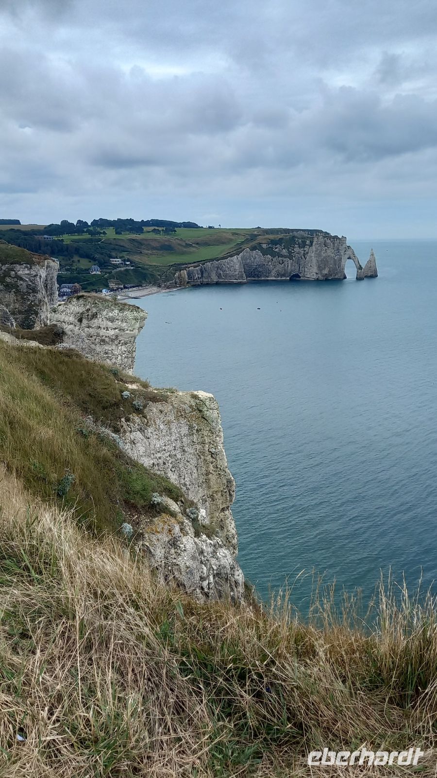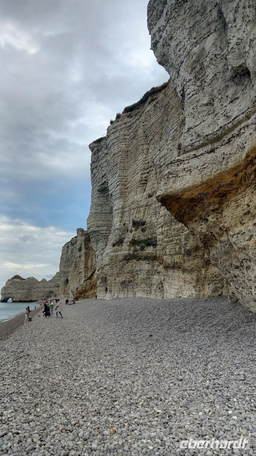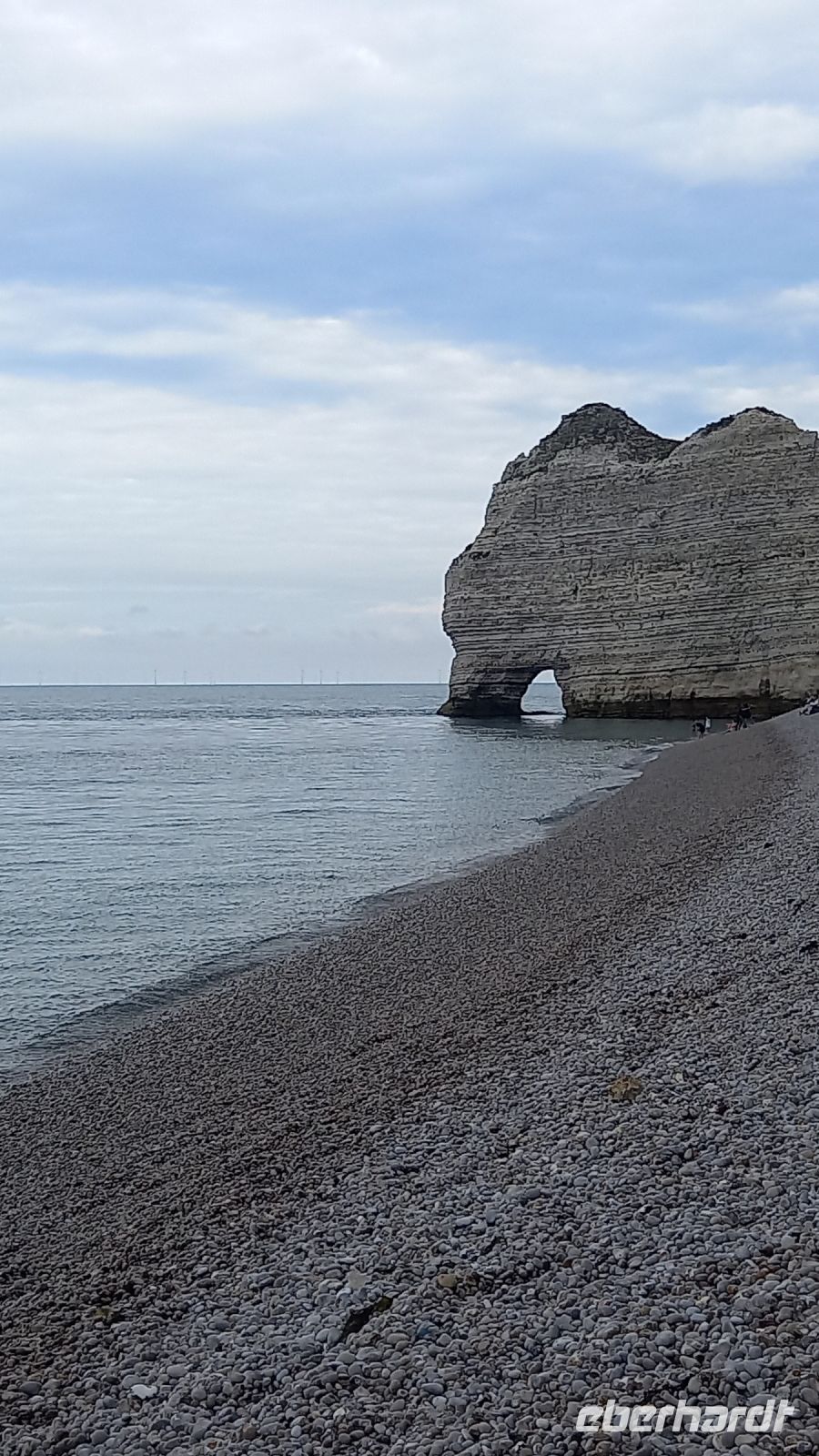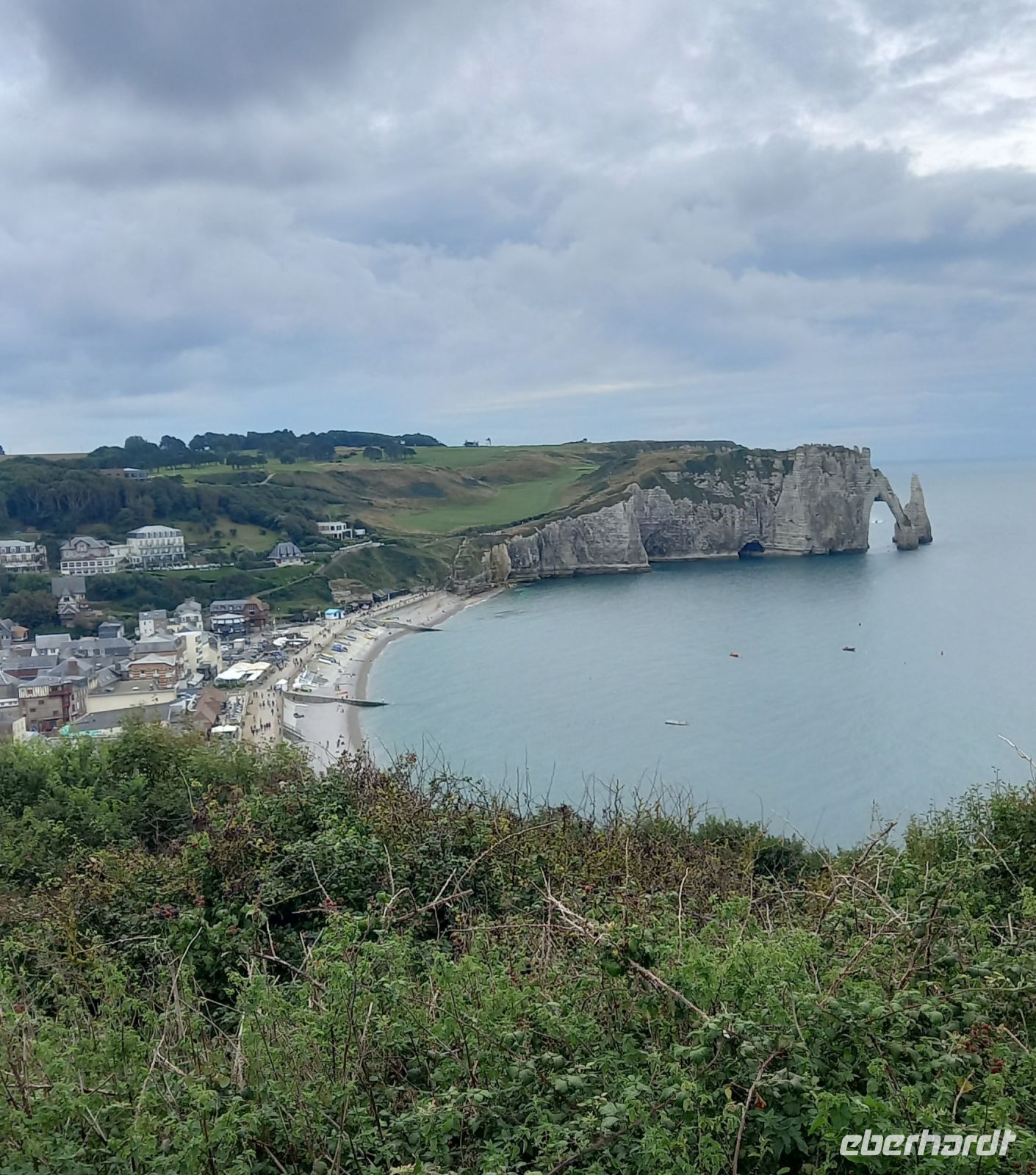 Heute ließen wir es am Vormittag ruhig angehen und schlenderten nochmal individuell durch das Morgengetümmel von Rouen. Nach dem Mittagessen holten uns mehrere Busse zu einem Ausflug in das kleine Fischerörtchen Etretat ab, das für seine Kreidefelsen bekannt ist. Auf der Fahrt dorthin erfuhren wir viel über den Flachsanbau und die farbenprächtigen Rhododendronbüsche, die für die Normandie so typisch sind. Auch historische Bauernhöfe mit Reet gedeckten Dächern waren zu bestaunen. In Etretat angekommen spazierten wir durch den Ort, vorbei an prächtigen Fachwerkhäusern, zu dem großen und weitläufigen Strand mit dem alabasterfarbenen Wasser, das diesem Küstenabschnitt seinen Namen verdankt.