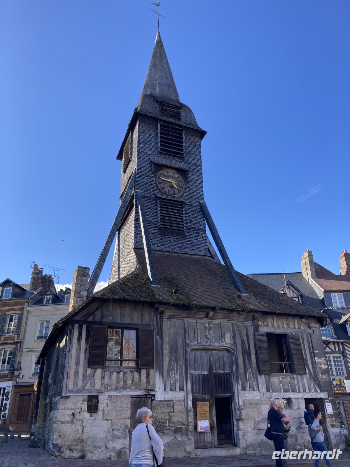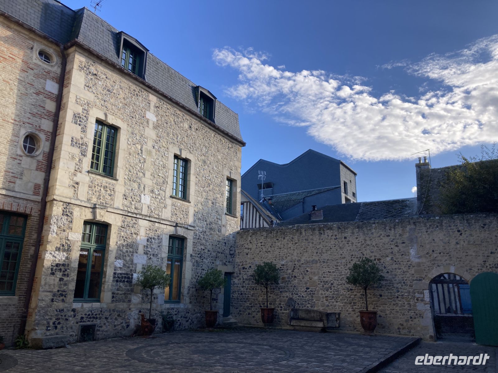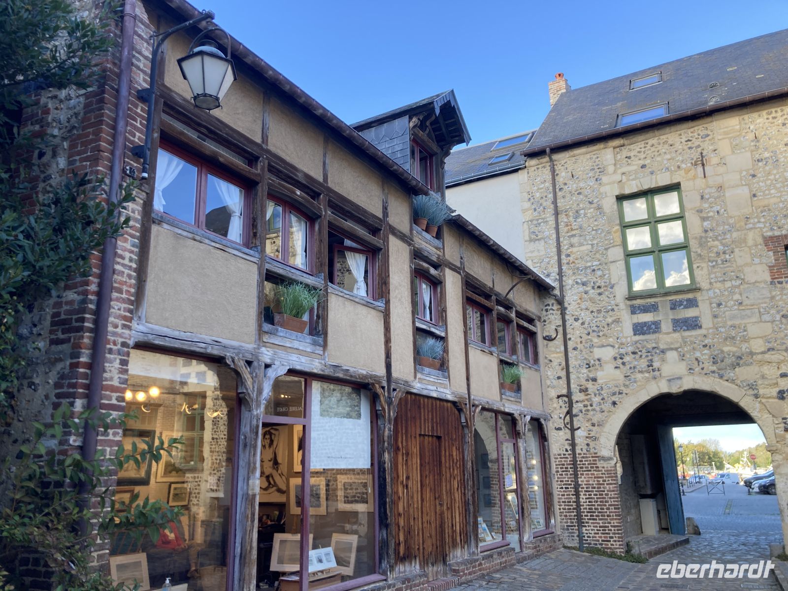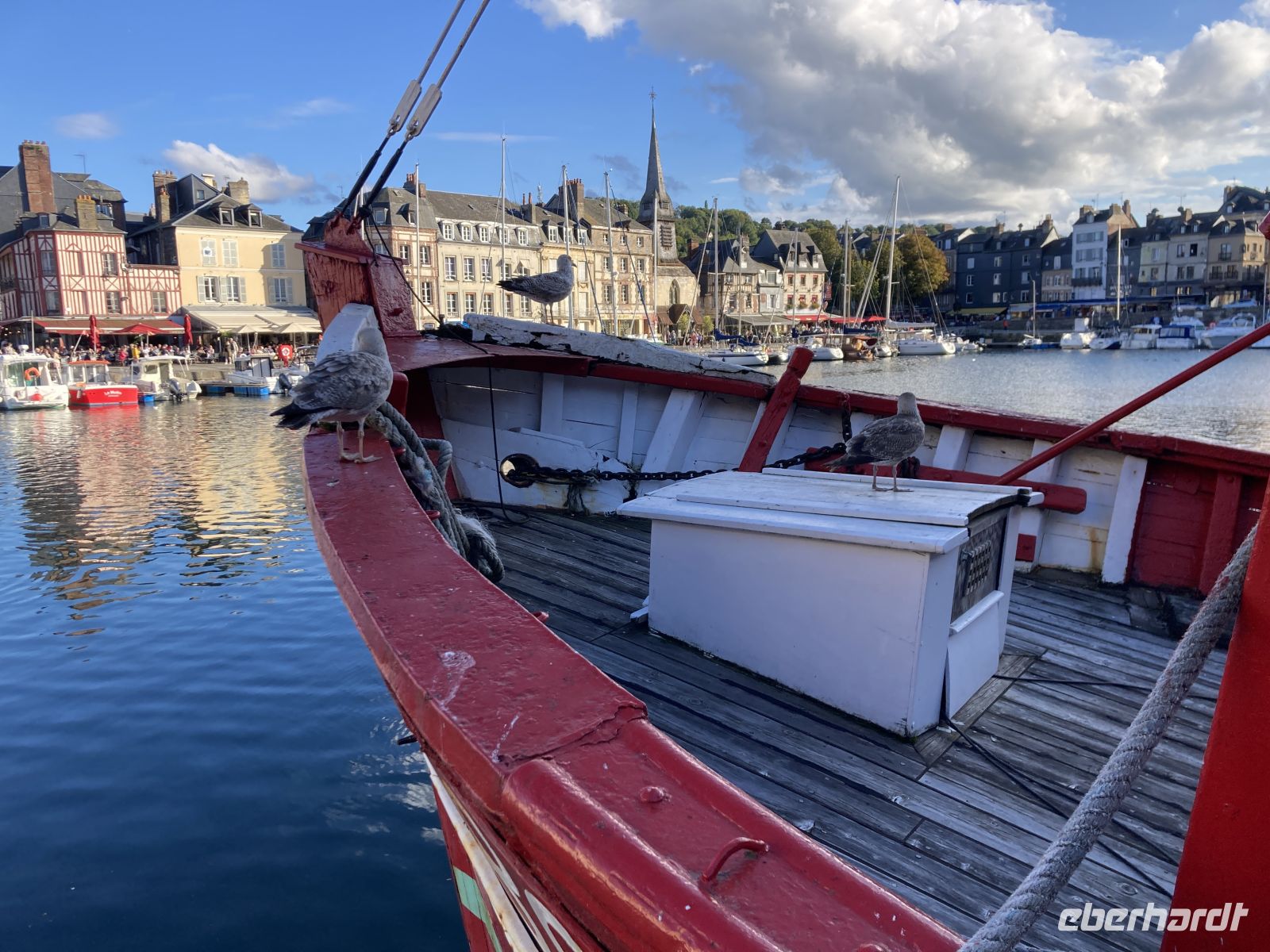 Im Inneren sehen wir schöne Kirchenfenstern sowie ein besonderes Kreuz beim Altarstein. Einst war Caudebec-en-Caux eine Stadt der Gerber. Im Zweiten Weltkrieg wurde auch dieser Ort stark beschädigt. Ein besonderes Gebäude ist jedoch erhalten geblieben - la Maison des Templiers aus dem 12. bis 13. Jahrhundert. Ein wunderbares Beispiel für die beginnende Renaissance-Architektur in Frankreich. Heute beherbergt das Gebäude Kunsthandwerker und einen Geschichtsverein. Wir schenken noch einem Stück verbliebener Stadtmauer unsere Aufmerksamkeit, immerhin findet sich hier auch das ehemalige Gefängnis der Stadt. Und nicht nur dies, auf dem Platz vor dem Gefängnis fanden auch die peinlichen Verhöre statt, bei denen Foltermethoden eingesetzt wurden. Jetzt macht sich der kleine Hunger bemerkbar und es geht wieder zum Schiff zurück. Der Nachmittag führt uns mit einem Ausflug erneut an Küste: Deauville und Honfleur stehen auf dem Programm. Obwohl oder vielleicht gerade deshalb, alle einen Schirm eingepackt haben, hält das Wetter. Wir erleben die Küste zwar mit Wind aber trocken. Deauville, das berühmte Seebad, dass die Pariser liebevoll ihr 21. Arrondissement nennen, begrüßt uns mit seinem wunderbaren Sandstrand. Nach einem Nahkontakt mit dem Wasser geht es weiter nach Honfleur. Hier wandeln wir erneut auf den Spuren der Impressionisten und genießen das Treiben dieses charmanten Städtchens, in dem heute noch Bildende KünstlerInnen leben und einige Galerien zu finden sind. Der Komponist Eric Satie stammte von hier und der Maler Eugène Boudin. Letzterer erkannte früh das Talent eines gewissen Claude Monet. Ein Museum widmet sich dem Leben und Werk Eugène Bodin. Eine große Sammlung seiner Werke findet sich aber in dem sehr schönen Museum in Le Havre. Wir erreichen wieder unser Schiff in Caudebec-en-Caux und treten nun schon wieder die Rückfahrt flussaufwärts an.