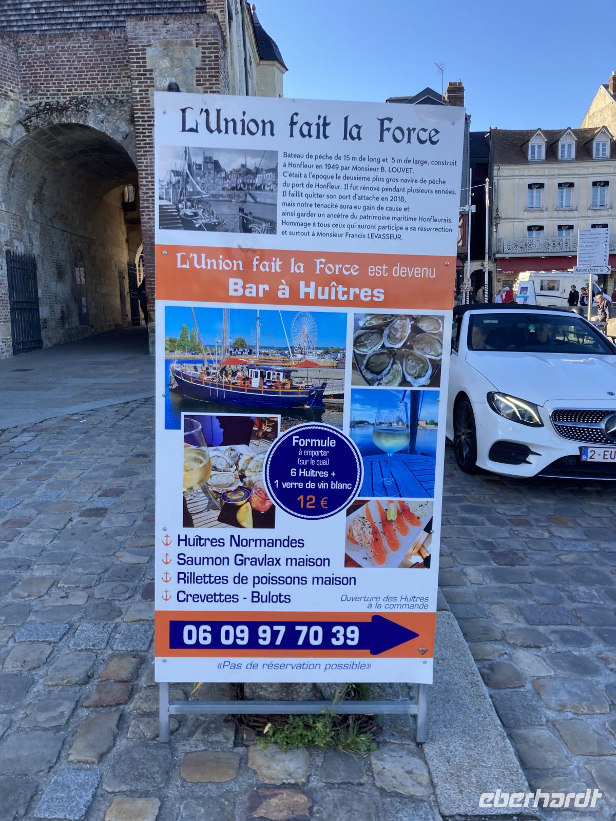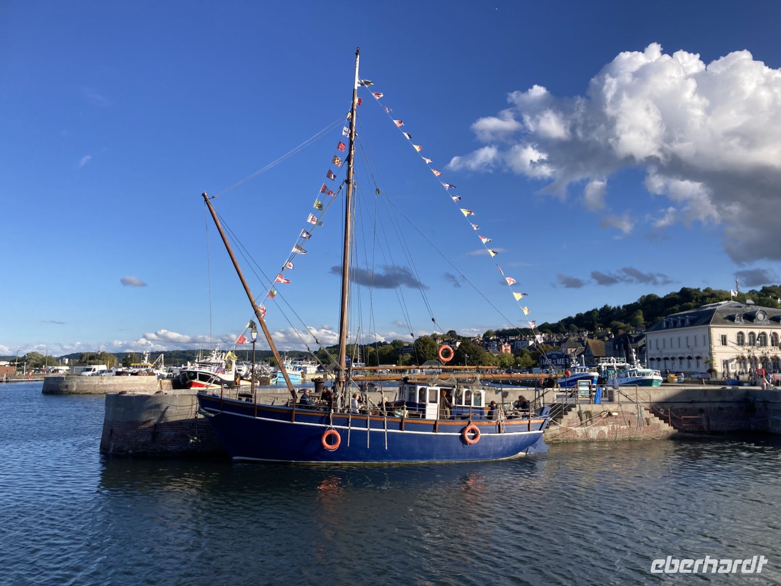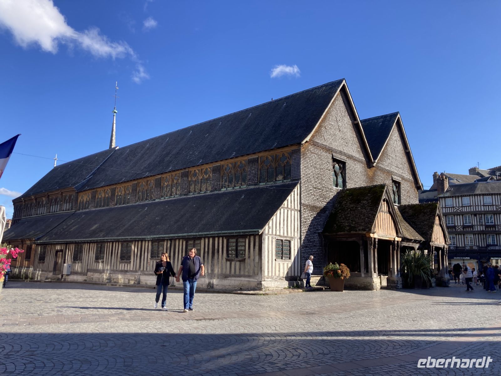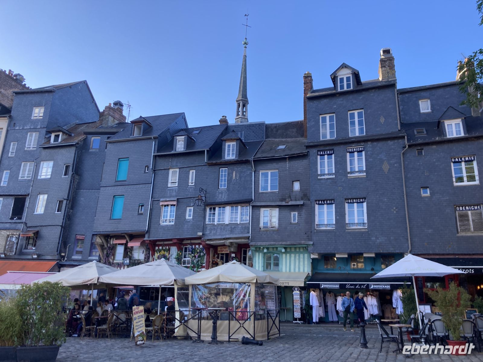 Im Inneren sehen wir schöne Kirchenfenstern sowie ein besonderes Kreuz beim Altarstein. Einst war Caudebec-en-Caux eine Stadt der Gerber. Im Zweiten Weltkrieg wurde auch dieser Ort stark beschädigt. Ein besonderes Gebäude ist jedoch erhalten geblieben - la Maison des Templiers aus dem 12. bis 13. Jahrhundert. Ein wunderbares Beispiel für die beginnende Renaissance-Architektur in Frankreich. Heute beherbergt das Gebäude Kunsthandwerker und einen Geschichtsverein. Wir schenken noch einem Stück verbliebener Stadtmauer unsere Aufmerksamkeit, immerhin findet sich hier auch das ehemalige Gefängnis der Stadt. Und nicht nur dies, auf dem Platz vor dem Gefängnis fanden auch die peinlichen Verhöre statt, bei denen Foltermethoden eingesetzt wurden. Jetzt macht sich der kleine Hunger bemerkbar und es geht wieder zum Schiff zurück. Der Nachmittag führt uns mit einem Ausflug erneut an Küste: Deauville und Honfleur stehen auf dem Programm. Obwohl oder vielleicht gerade deshalb, alle einen Schirm eingepackt haben, hält das Wetter. Wir erleben die Küste zwar mit Wind aber trocken. Deauville, das berühmte Seebad, dass die Pariser liebevoll ihr 21. Arrondissement nennen, begrüßt uns mit seinem wunderbaren Sandstrand. Nach einem Nahkontakt mit dem Wasser geht es weiter nach Honfleur. Hier wandeln wir erneut auf den Spuren der Impressionisten und genießen das Treiben dieses charmanten Städtchens, in dem heute noch Bildende KünstlerInnen leben und einige Galerien zu finden sind. Der Komponist Eric Satie stammte von hier und der Maler Eugène Boudin. Letzterer erkannte früh das Talent eines gewissen Claude Monet. Ein Museum widmet sich dem Leben und Werk Eugène Bodin. Eine große Sammlung seiner Werke findet sich aber in dem sehr schönen Museum in Le Havre. Wir erreichen wieder unser Schiff in Caudebec-en-Caux und treten nun schon wieder die Rückfahrt flussaufwärts an.