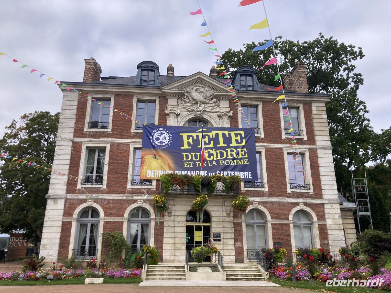 Wir treffen uns zu einem kleinen Rundgang und entdecken, dass wir eine Woche zu früh hier sind. Somit können wir leider nicht an dem großen Fest des Apfel teilnehmen. Schade, aber zu entdecken gibt es denn einiges, in der Stadt, die ihren Namen den Nordmännern zu verdanken hat. Da unser Schiff direkt vor dem Seine-Museum liegt, können wir einen Bootstyp betrachten mit dem über Jahrhunderte Waren auf diesem Fluss transportiert wurden. Und da heute der internationale Museumstag ist, finden auch im und rund um das Museum einige Aktivitäten statt. Wir begeben uns jedoch zunächst. zur Kirche Notre-Dame. Ein wunderbares Westportal zeichnet die Architektur aus. Zu entdecken gibt es so manche Kuriosität, vor allem auch Darstellungen, die wir nicht an einem Kirchenportal erwarten würden. Lustige Musikanten spielen hier auf und zeigen zudem auch noch ein interessantes Musikinstrument.