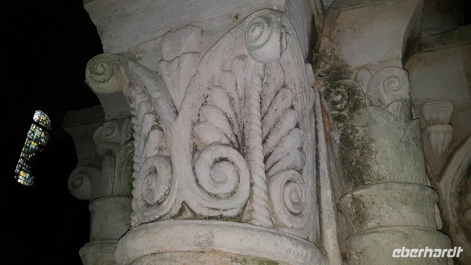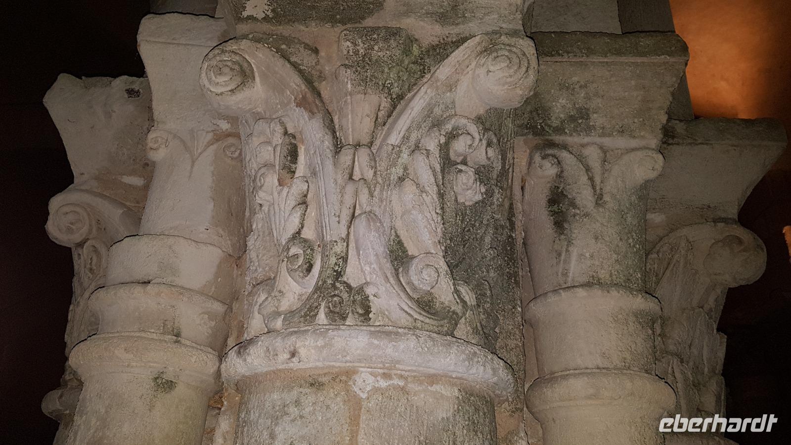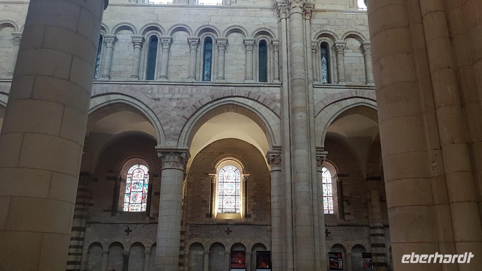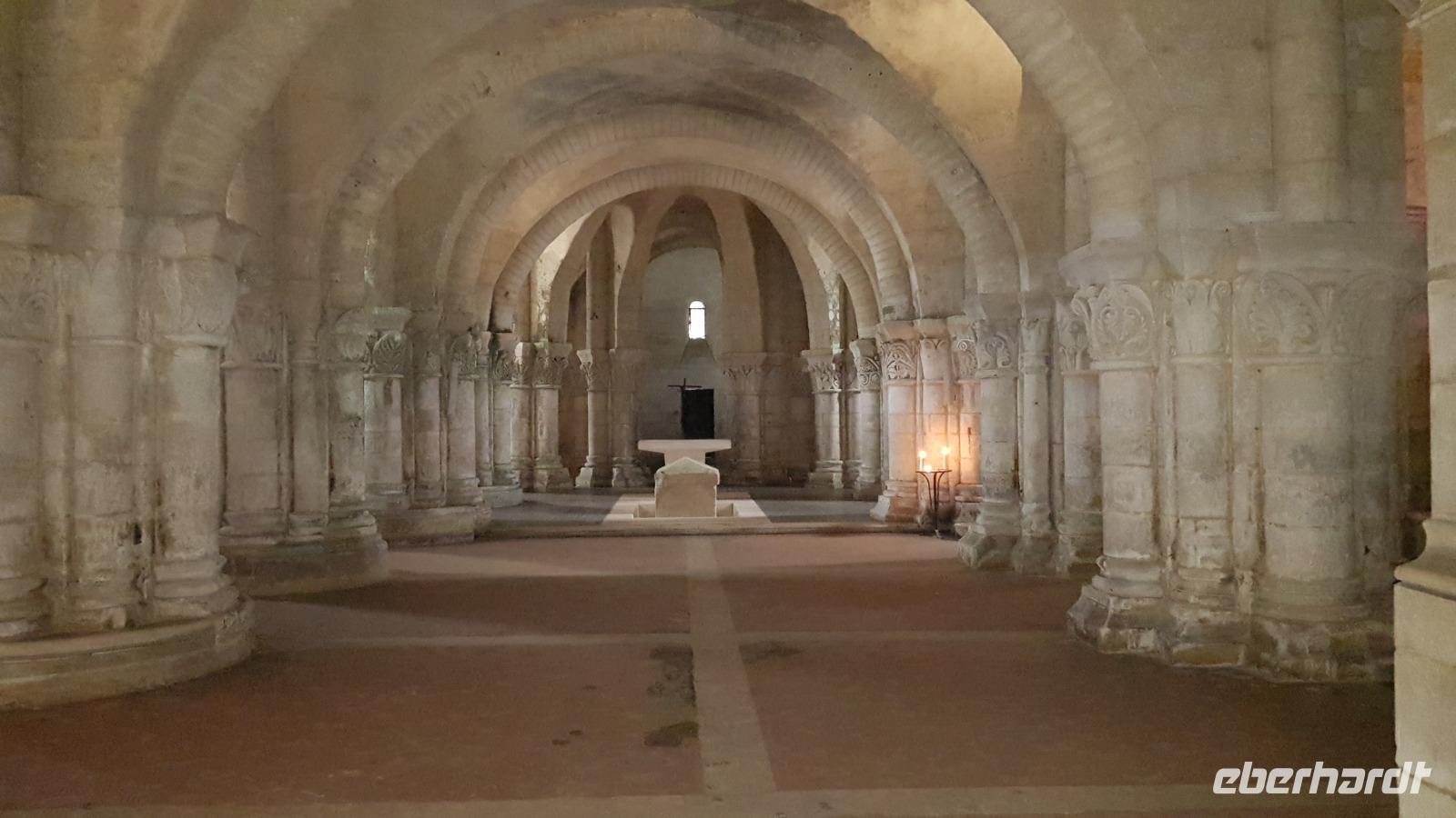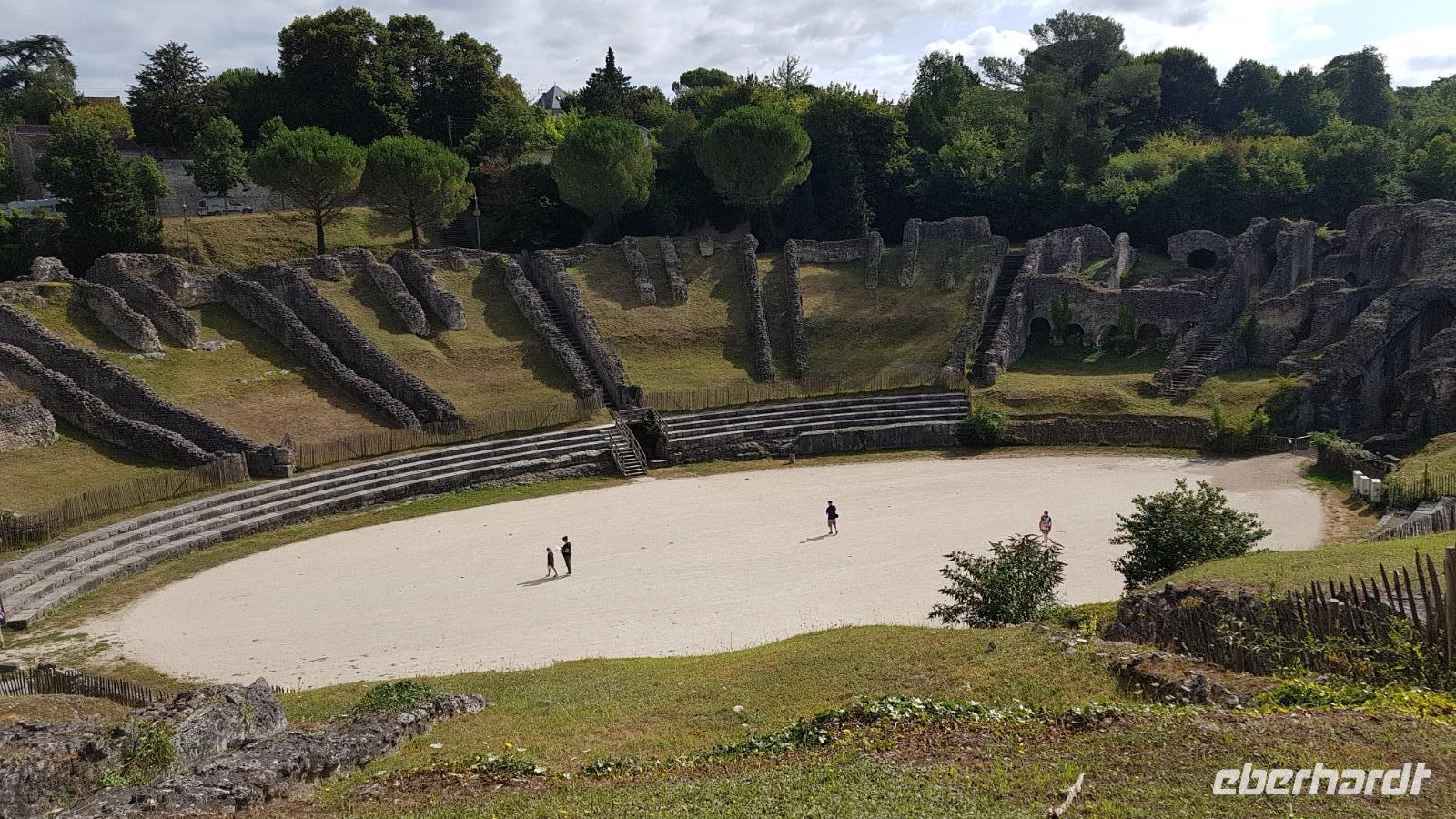 Nach dem wir am Morgen unsere Koffer wieder in den Bus geladen hatten fuhren wir nach Saintes, dem Hauptort der Saintonge. Die Stadt wurde um da Jahr 20 v. Chr von den Römern unter dem Namen „Mediolanum Santonum" an einer der ältesten Römerstraßen Galliens, der Via Agrippa, gegründet. Mit ca. 15.000 Einwohnern war sie in der Antike Hauptstadt der Provinz Saintonge. Diese Epoche der antiken Provinzhauptstadt dokumentiert das bis heute erhaltene Amphitheater von Saintes, das wir uns zuerst besuchten. Dieser Bau vermittelte uns eine ungefähre Vorstellung von der Größe und Bedeutung des Ortes, in den den, laut Legende, der Heilige Eutropius im 1. nachchristlichen Jahrhundert das Christentum verbreitet und dafür hier den Märtyrertot erlitten haben soll. Im 6. Jahrhundert entstand um das Grab des Heiligen aus der lokalen Verehrung ein Pilgerkult, der seine Blüte im 11. Jahrhundert haben sollte. Zu dieser Zeit lag Sainte an der berühmten Pilgerstraße nach Santiago de Compostela, der Via Turonensis, auf der unzählige Pilger unterwegs waren. Um die großen Pilgerströme aufzunehmen, wurden von der Benediktinerabtei Cluny erfahrene Baumeistern entsandt, die in Saintes einen neuen, mächtigen Kirchenbau errichteten. An diesem heute nur noch teilweise erhaltenen Bau beeindruckte uns besonders stark die riesige Wallfahrtskrypta aus den 80ger Jahren des 11. Jahrhunderts.
