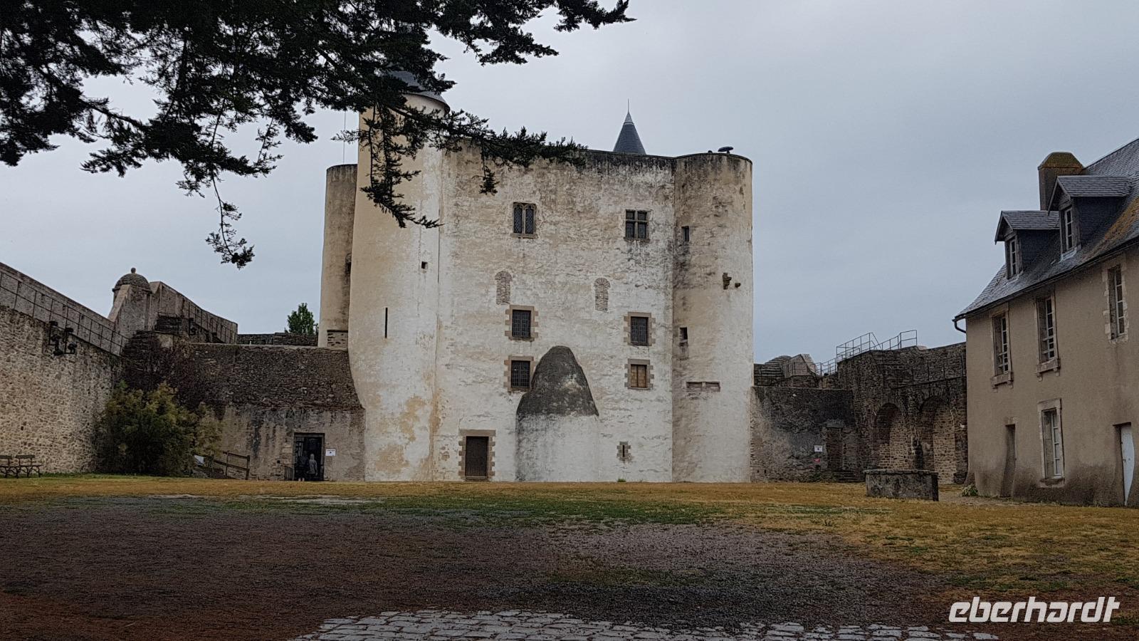 Die Ile de Noirmoutier ist 48,2 km² groß und 20 km lang. Sie zählt knapp 10.000 Einwohner, die vor allem von Fisch- und Muschelfang, Salzgewinnung, Landwirtschaft (vor allem Kartoffelanbau) und Tourismus leben. Da es inzwischen stark regnete verschoben wir unseren geplanten Besuch eines Salzgartens auf den Nachmittag und fuhren zuerst nach Noirmoutier-en-l'Ile. Dort besuchten wir die Abteikirche Saint-Philibert, die im Jahre 674 von dem berühmten Abt Philibert aus der Abtei Jumiège gegründet wurde. Als im 8. Jahrhundert die Wikinger kamen,um den Ort zu plündern, flohen die Mönche mit dem sterblichen Überresten des in der Abteikirche bestatteten Heiligen Philibert aufs Festland. Erst im Jahr 875 gelangten diese in das burgundische Tournus, wo eine prachtvolle romanische Kirche errichtet wurde, die heute zu den schönsten Kirchen Burgunds zählt. In Nourmoutier-en-l'Ile erinnert heute ein schlichter Kenotaph an den Heiligen. Nach dem Besuch der Abteikirche warfen wir einen Blick über den Burghof zum mittelalterlichen Donjon, der bis zum 17. Jahrhundert allen feindlichen Angriffen stand gehalten hatte.